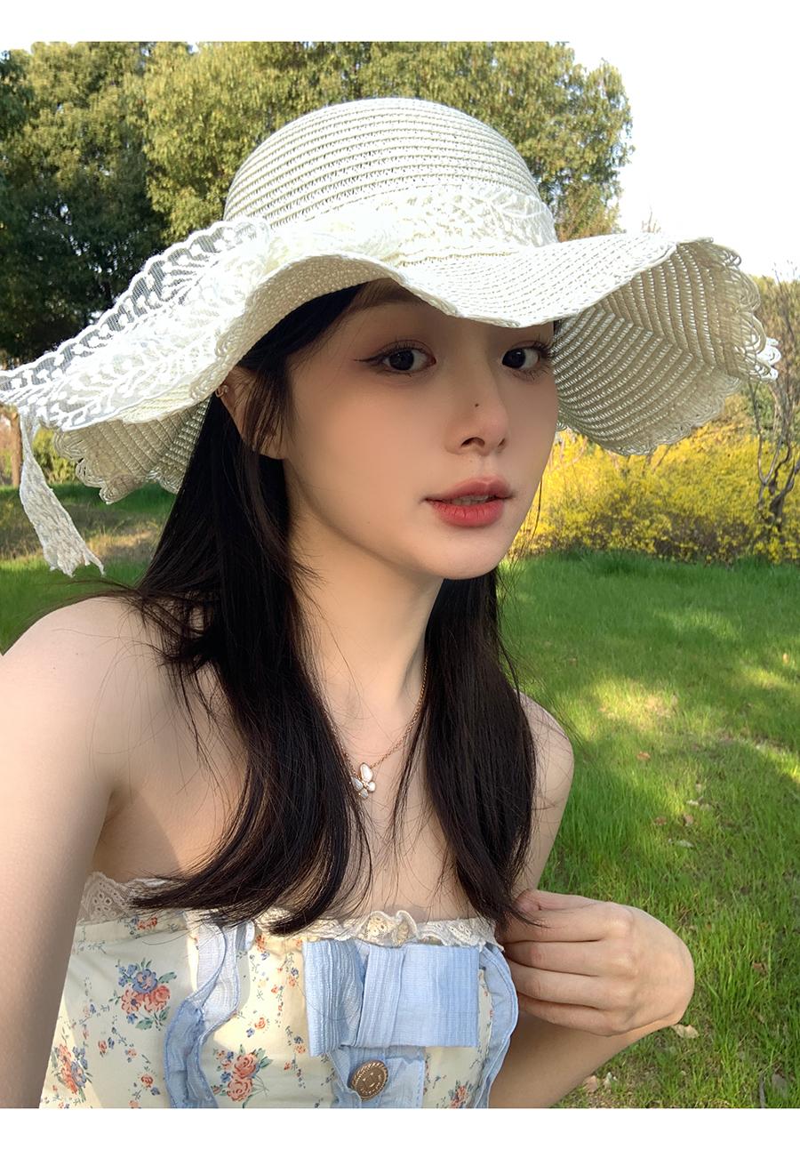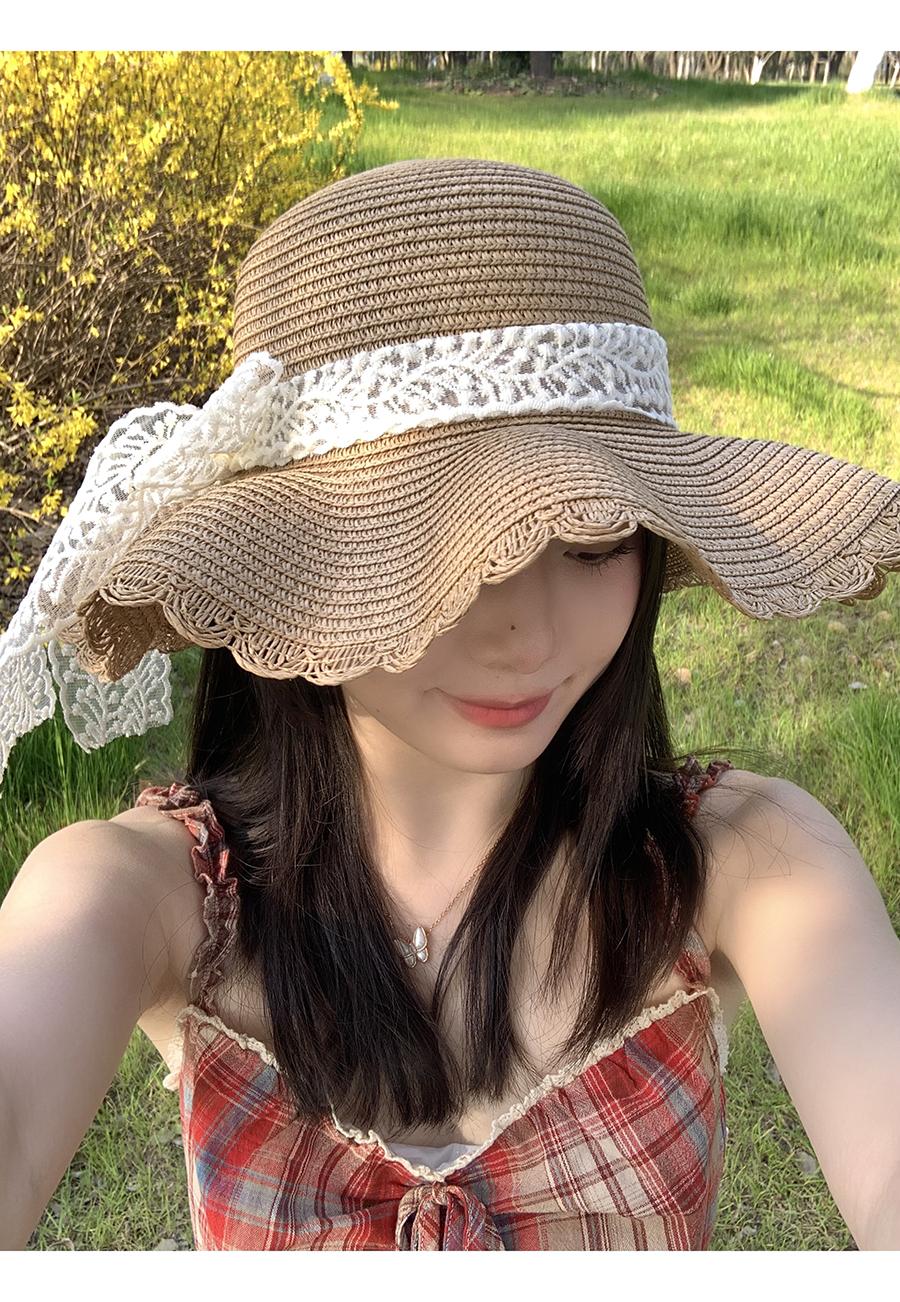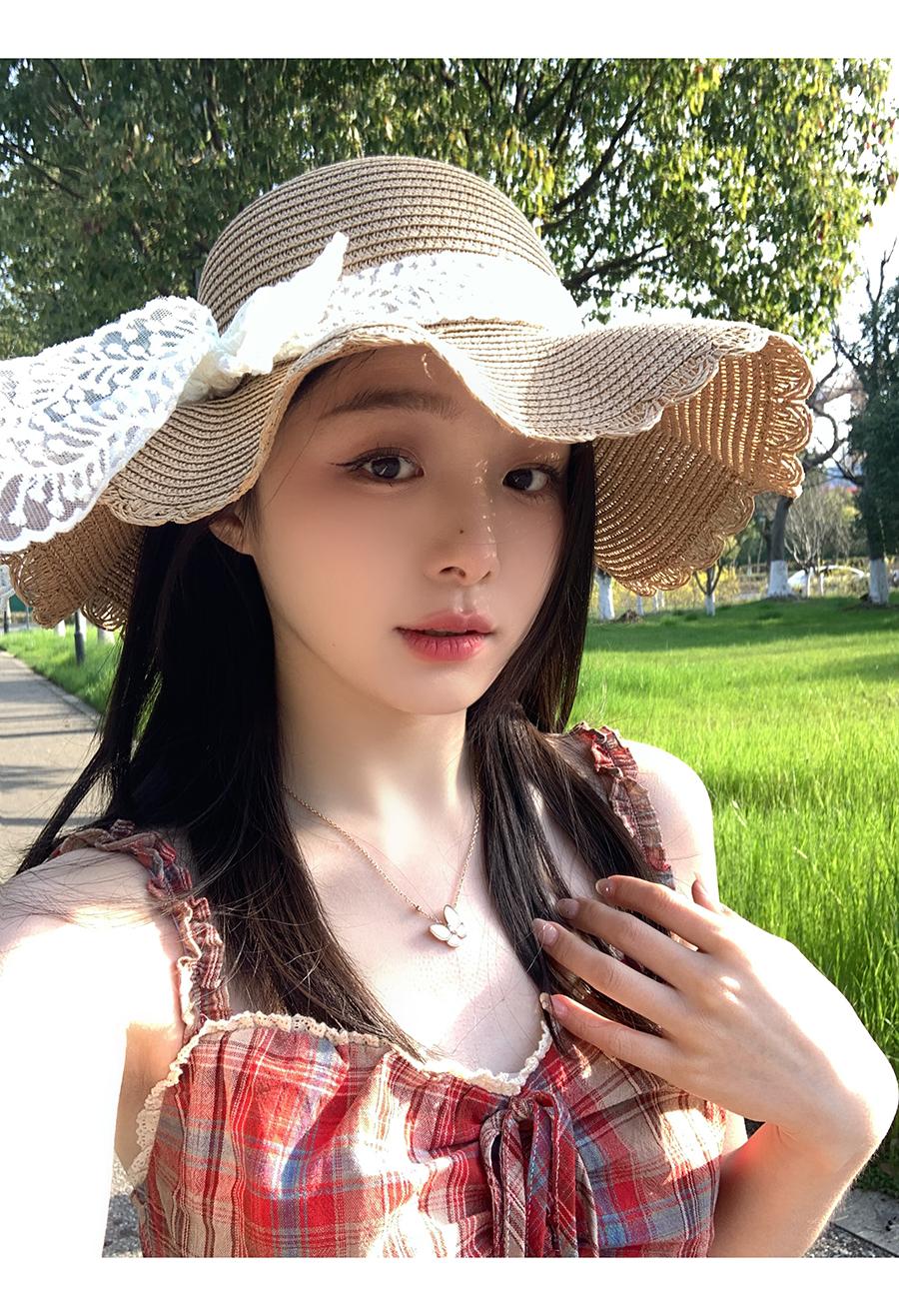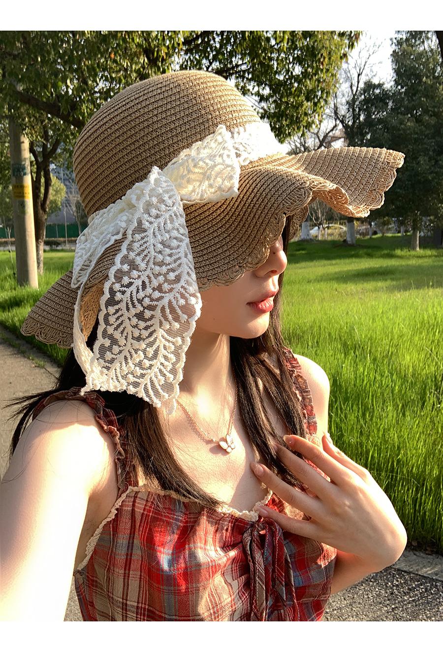 Sombrero de Paja para el Sol para Mujer Verano Dulce Lindo Sombrero de Pescador Sombrero de Paja de Ala Ancha Lazo de Encaje Borde Ondulado Sombrero Protector Solar