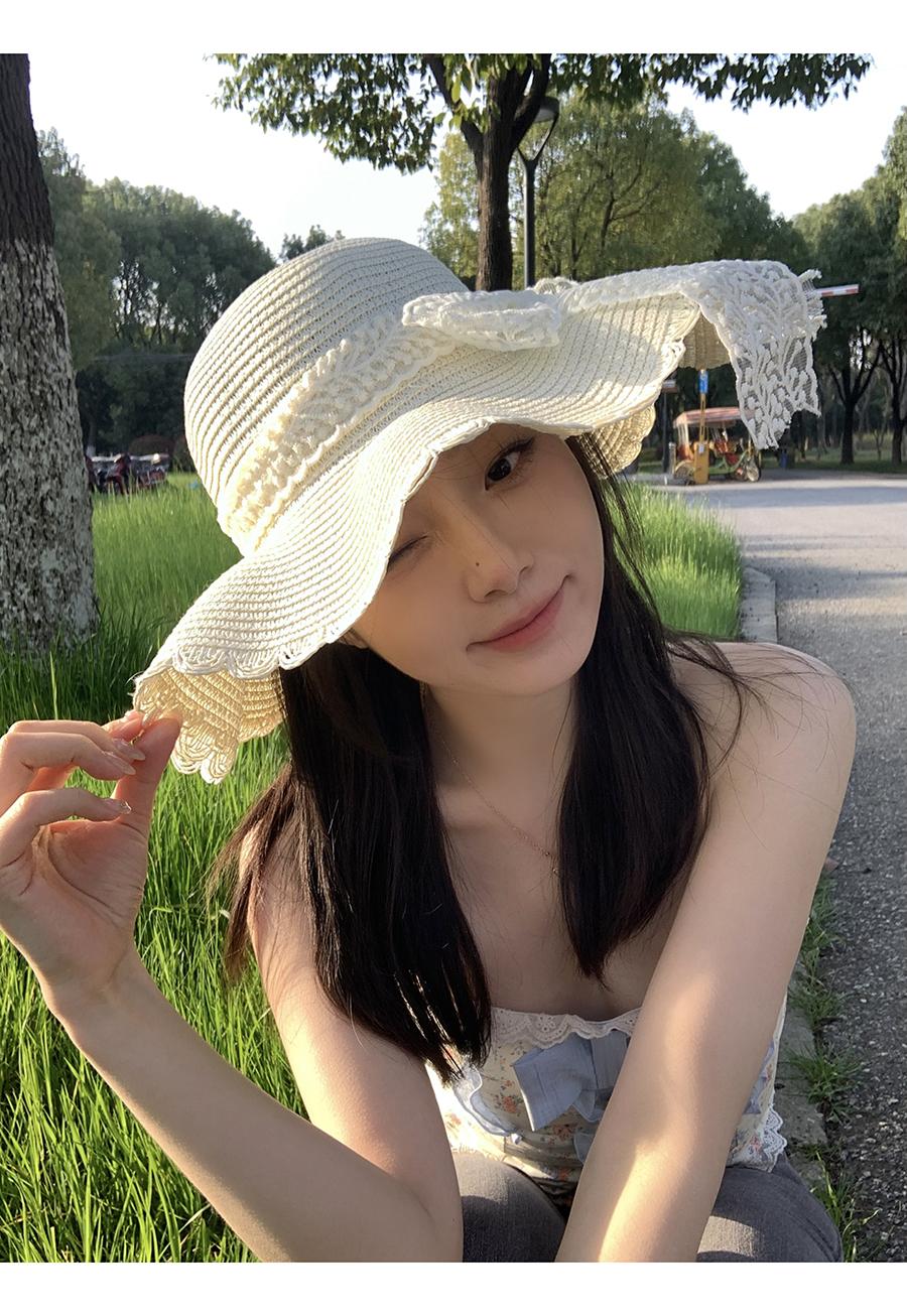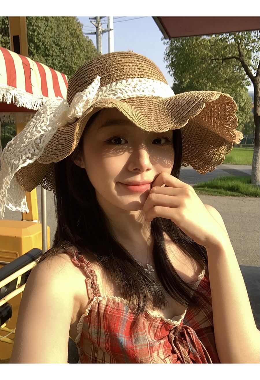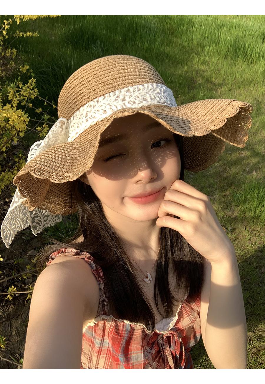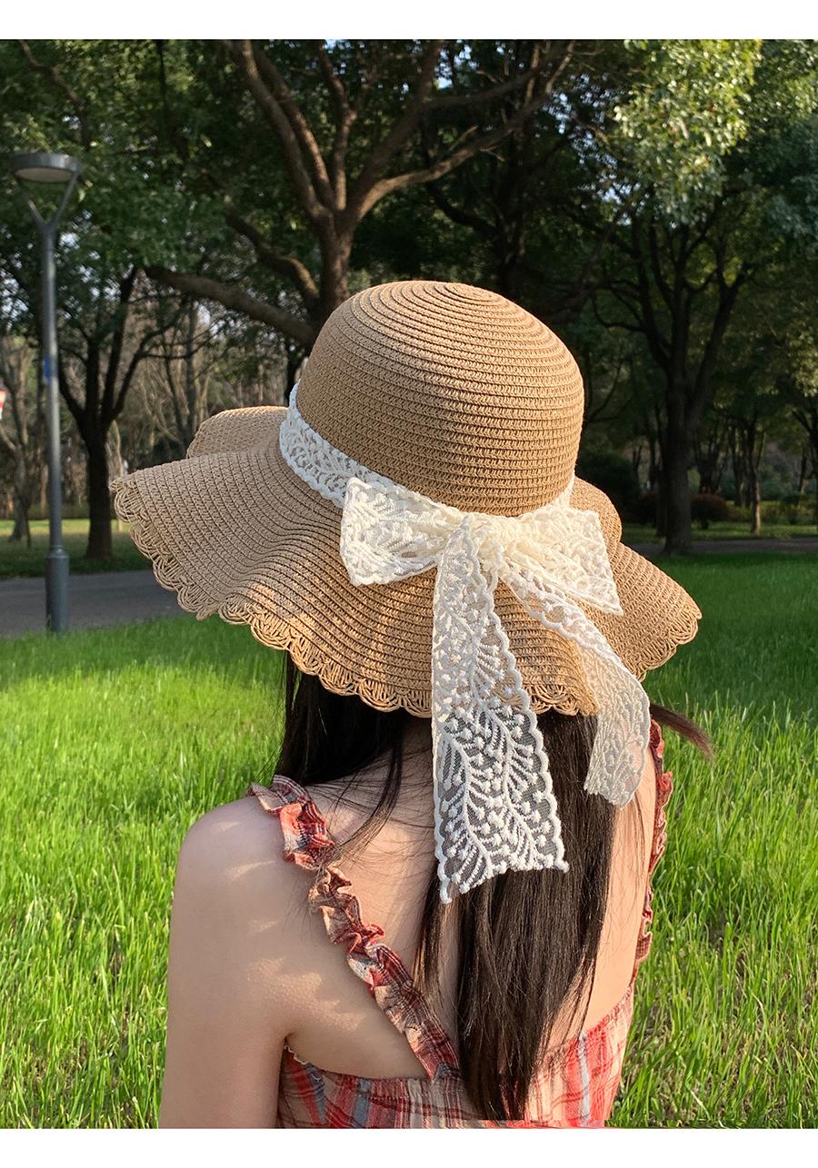 Sombrero de Paja para el Sol para Mujer Verano Dulce Lindo Sombrero de Pescador Sombrero de Paja de Ala Ancha Lazo de Encaje Borde Ondulado Sombrero Protector Solar