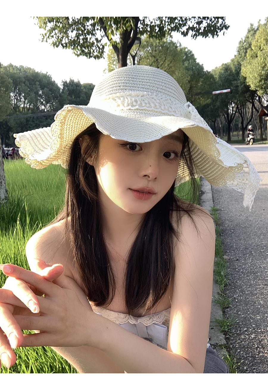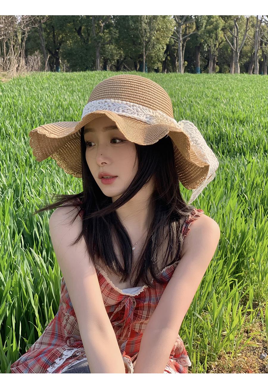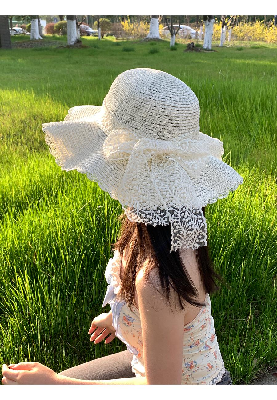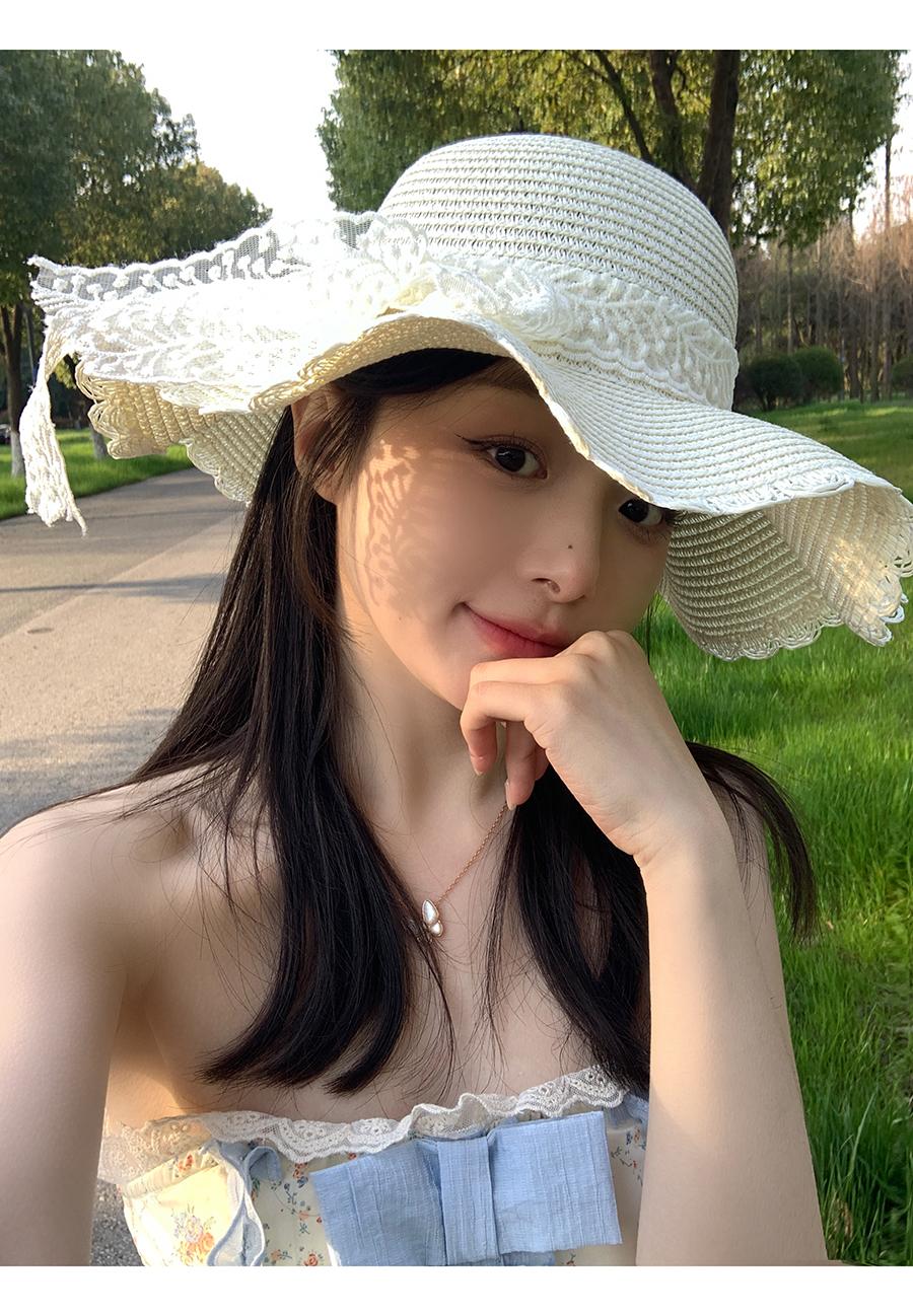 Sombrero de Paja para el Sol para Mujer Verano Dulce Lindo Sombrero de Pescador Sombrero de Paja de Ala Ancha Lazo de Encaje Borde Ondulado Sombrero Protector Solar