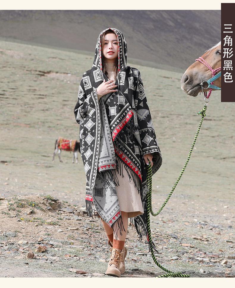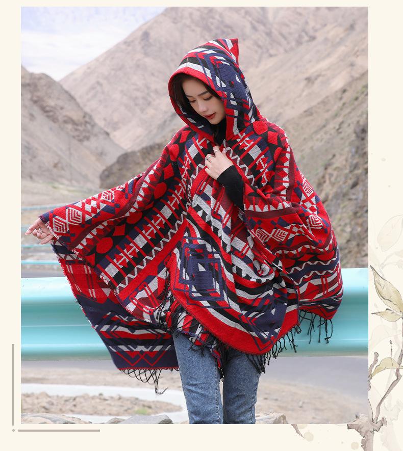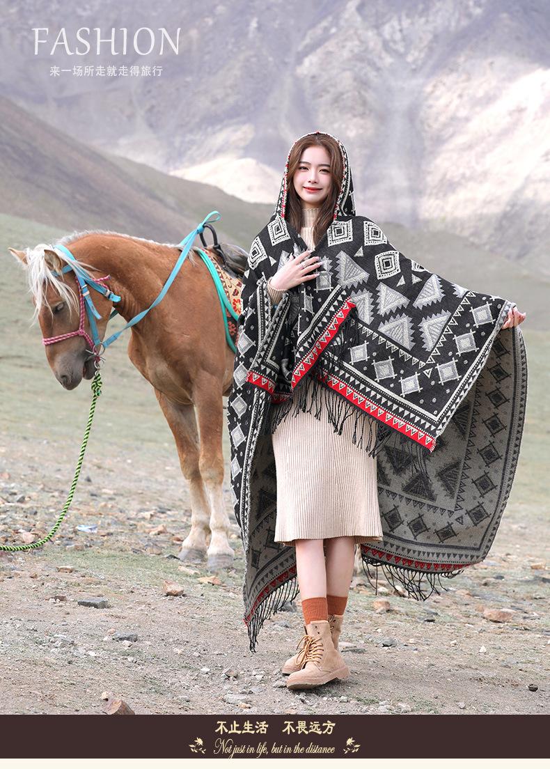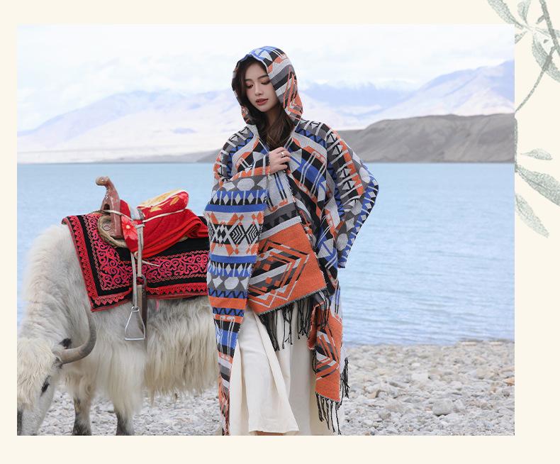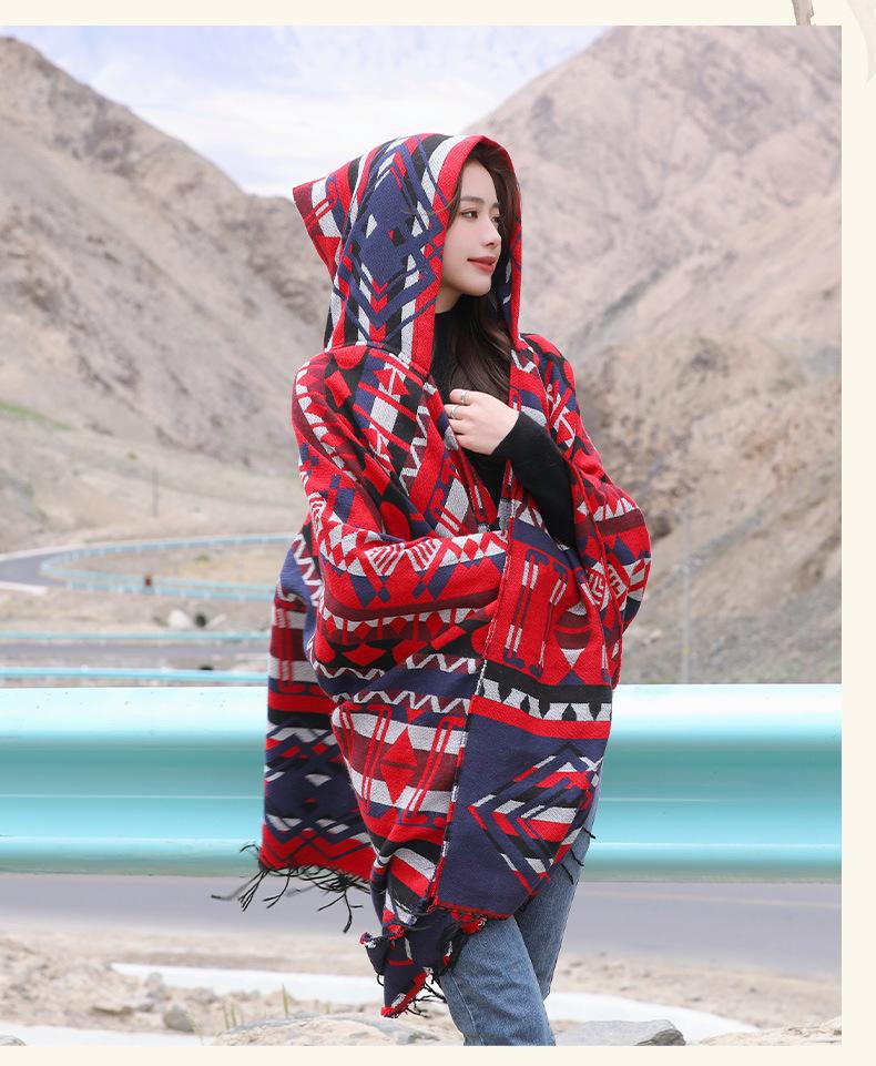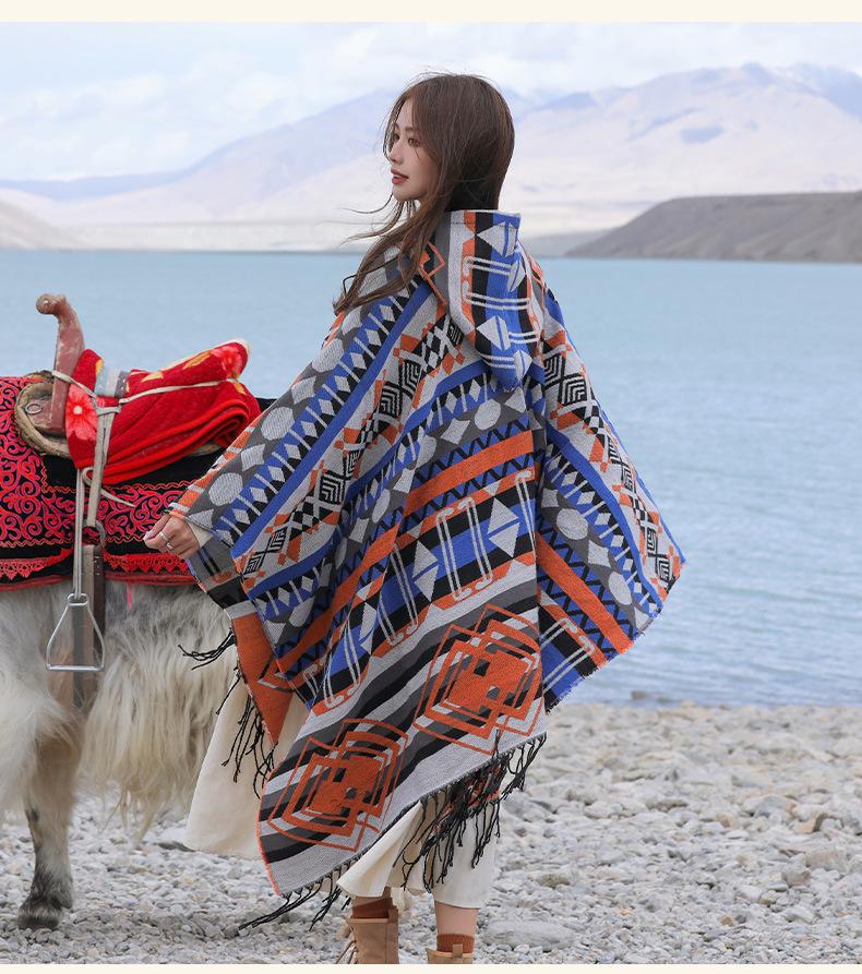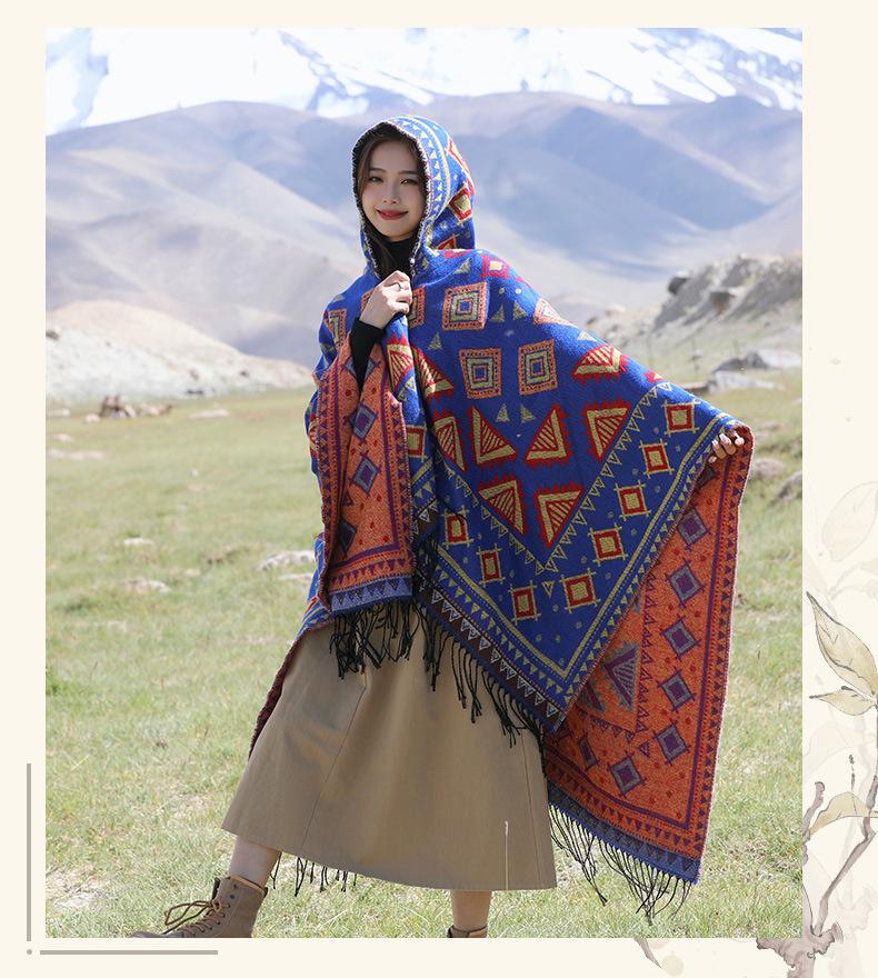 Nuevo Chal Exterior con Capucha Estilo Étnico Retro Xinjiang y Tíbet Fotografía de Viaje Exterior Cálido Capa Grande