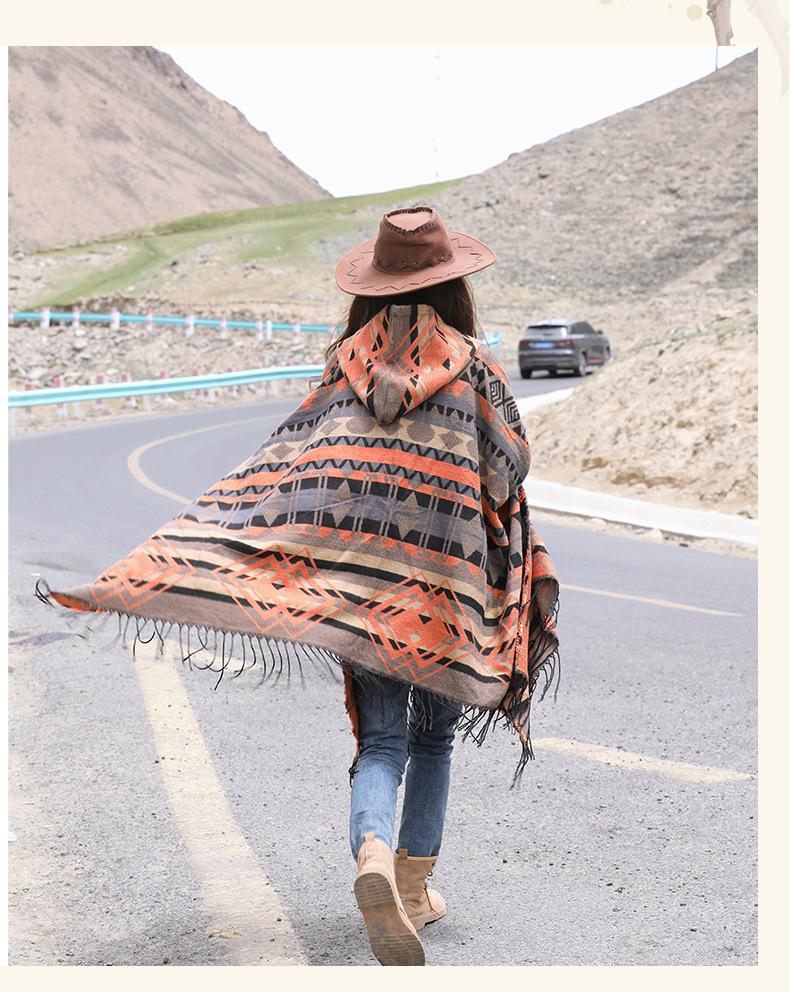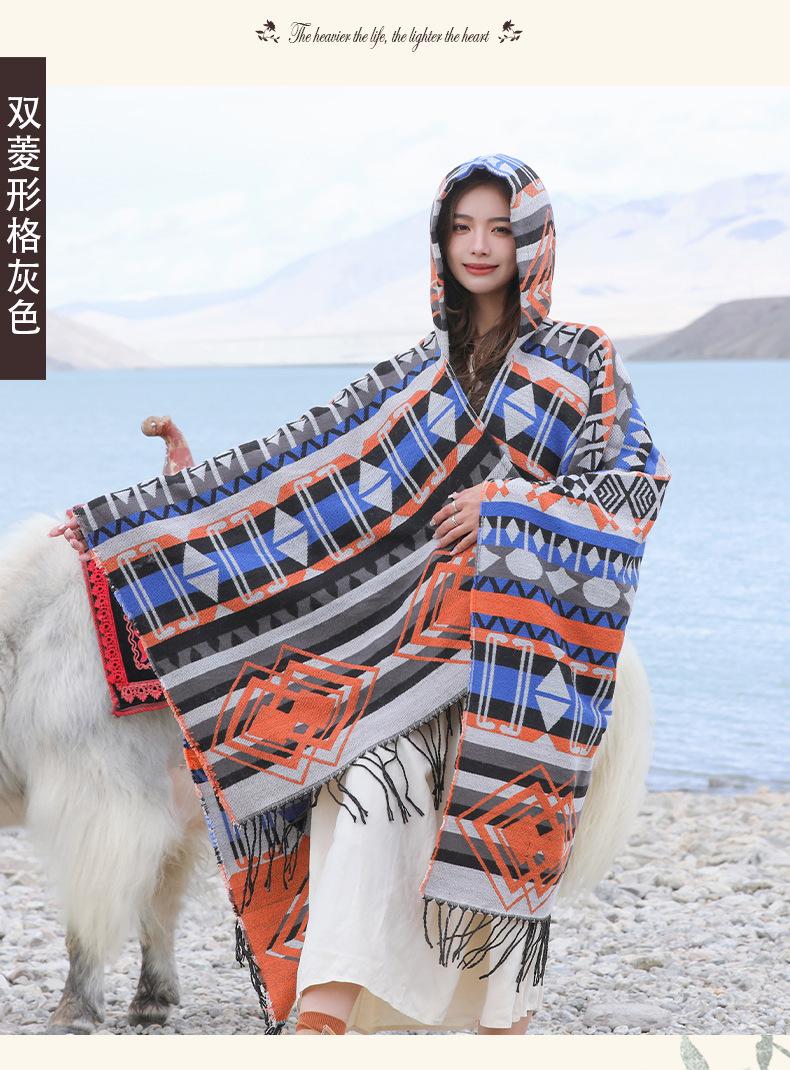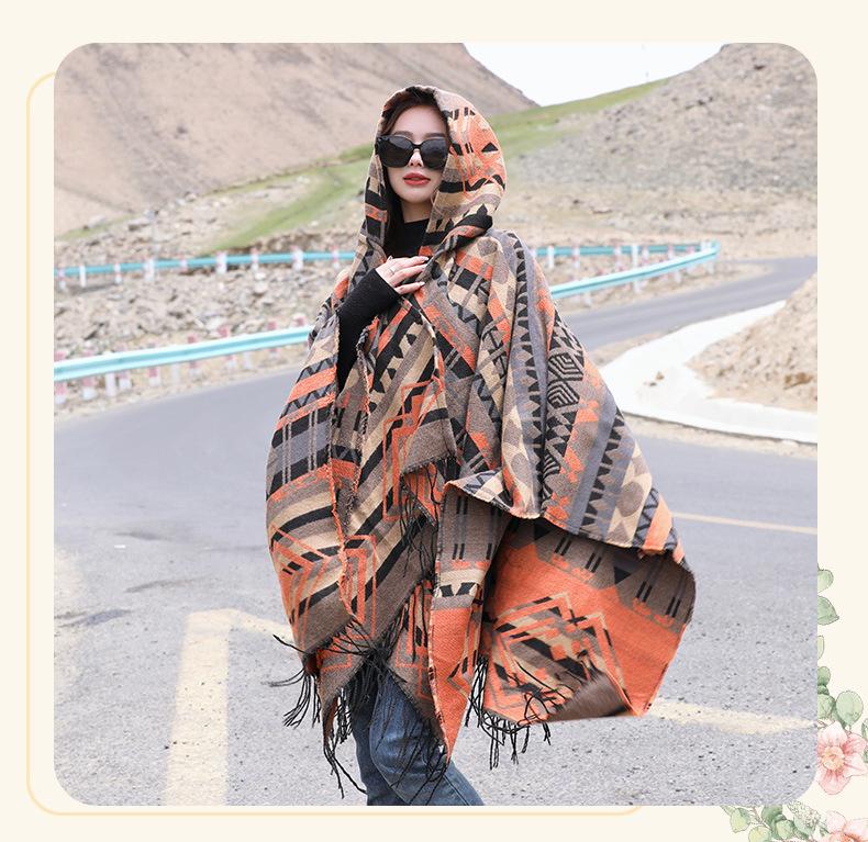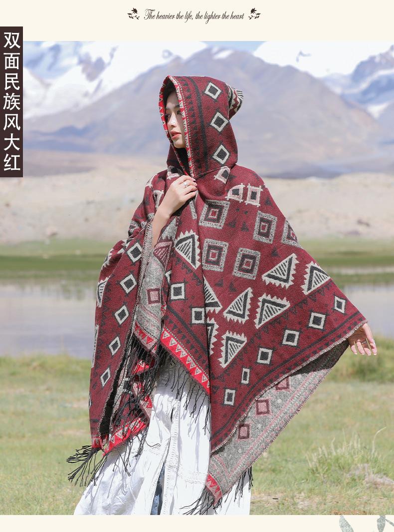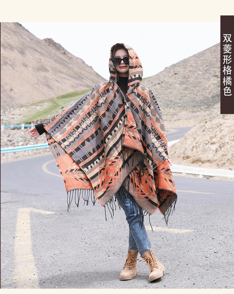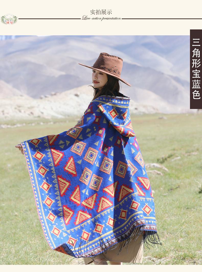Nuevo Chal Exterior con Capucha Estilo Étnico Retro Xinjiang y Tíbet Fotografía de Viaje Exterior Cálido Capa Grande
