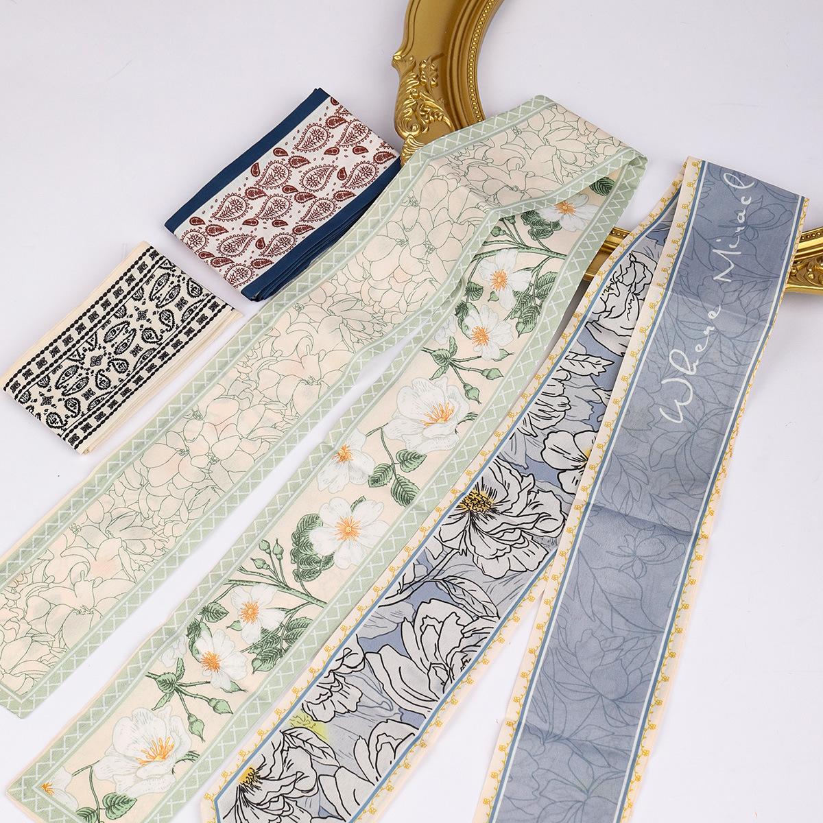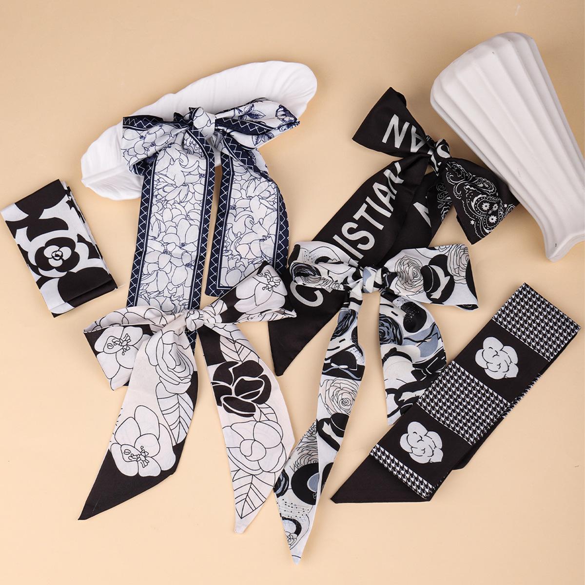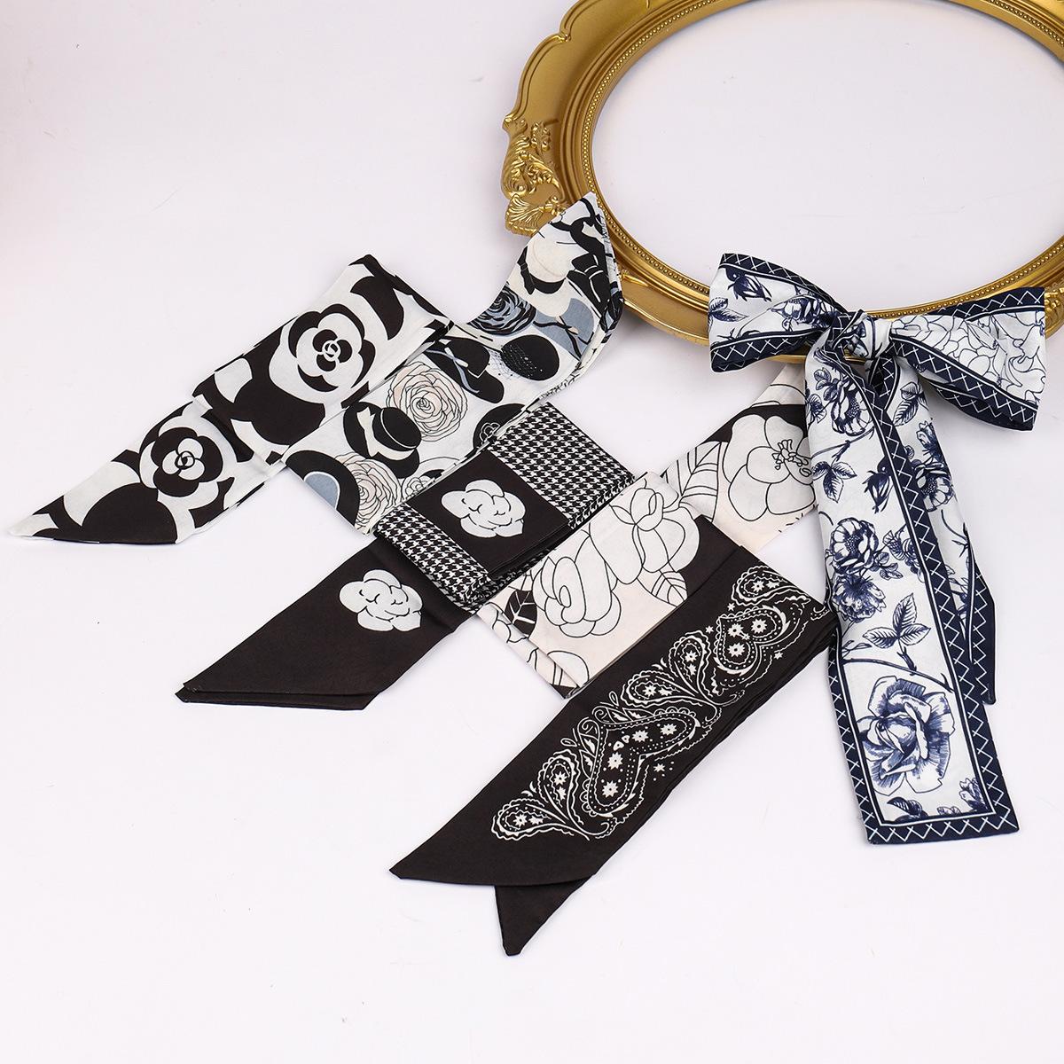 Banda para el cabello estilo viento Cinta para cola de caballo Bufanda larga de seda Elegante bolso Cinta delgada para envolver bolsa Camelia de flor pequeña