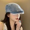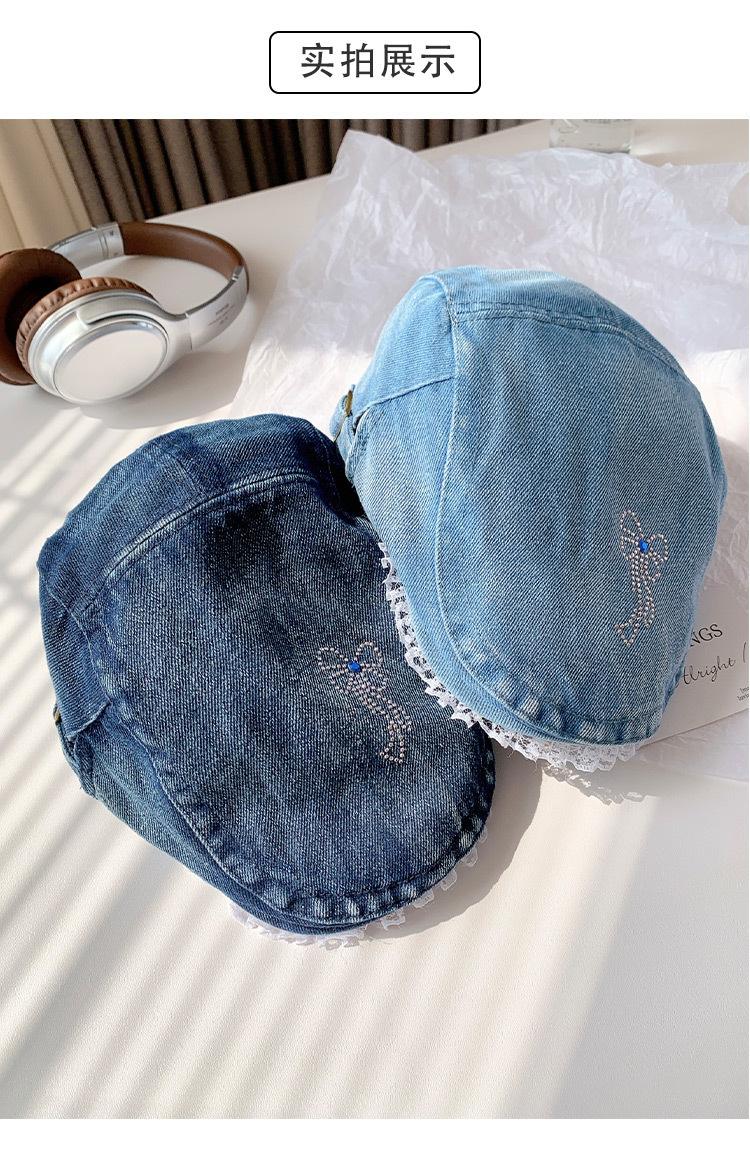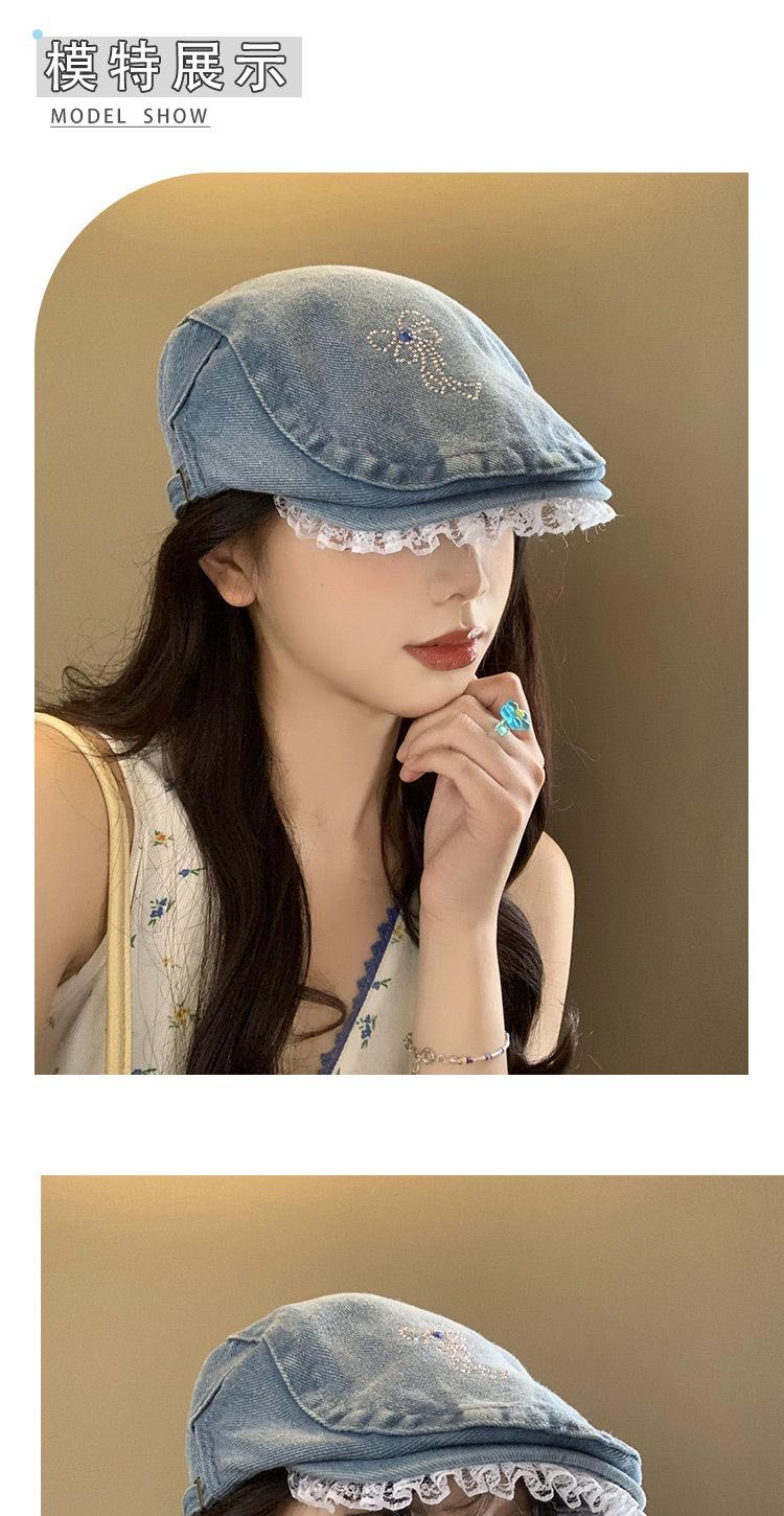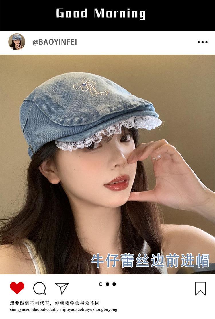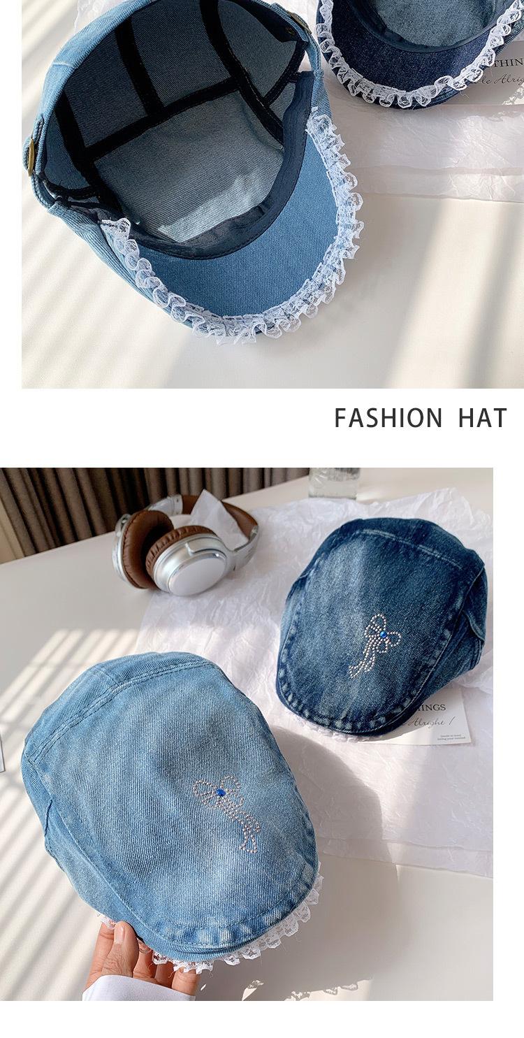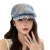 Boina de mezclilla pequeña con lazo, borde de encaje, para mujer, estilo coreano, gorra adelantada, circunferencia de cabeza grande, sombrero de pintor