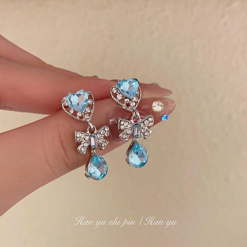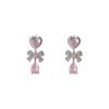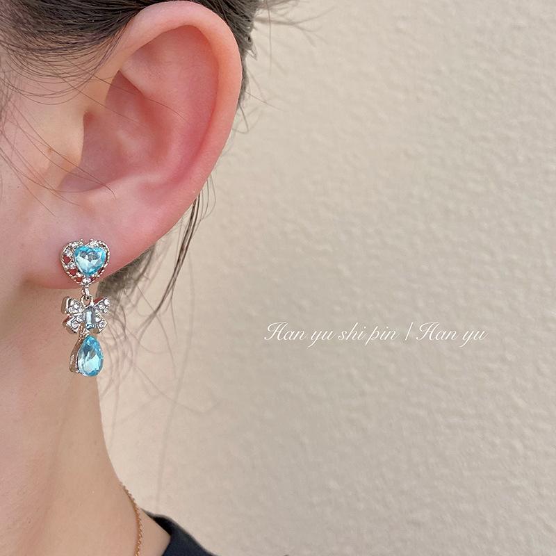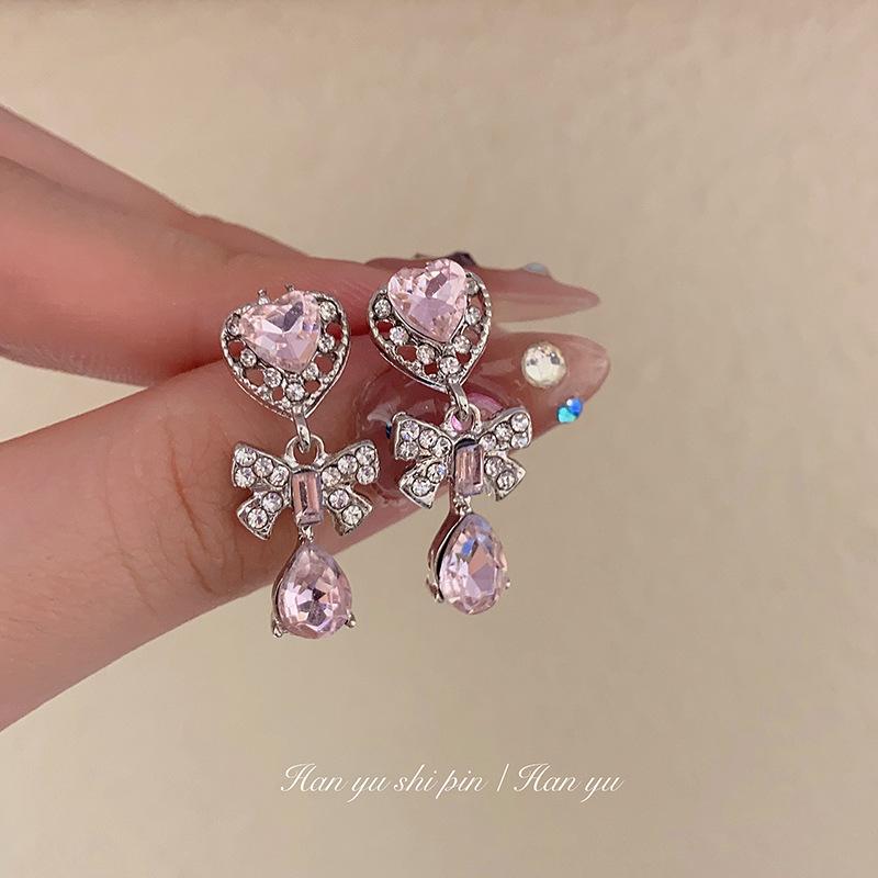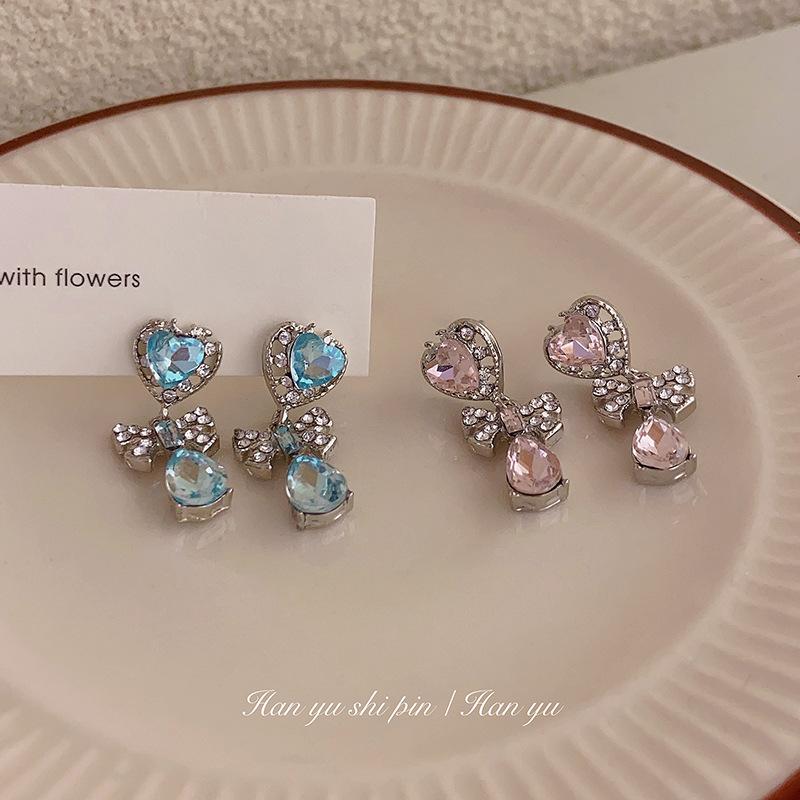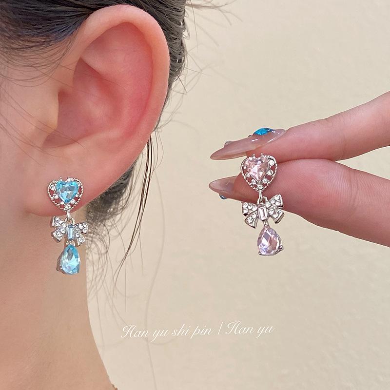 Pendientes de lazo de amor de Dongdaemun, Corea del Sur, con aguja de plata s925, estilo inmortal suave, con diamantes en forma de corazón y diseño de celebridades de Internet.