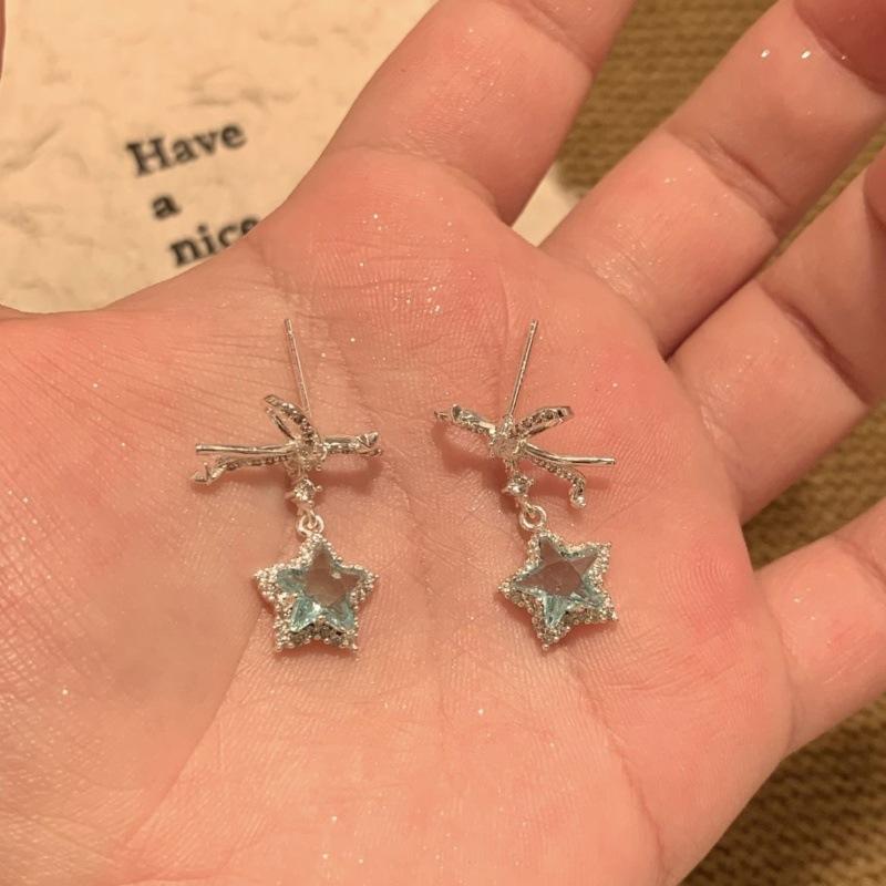 [Azul hielo menta] Pendientes de lazo con estrellas transparentes 2024, nuevos pendientes únicos y explosivos de nicho para mujer