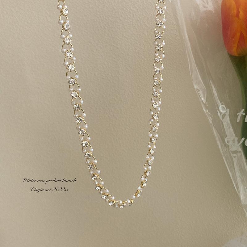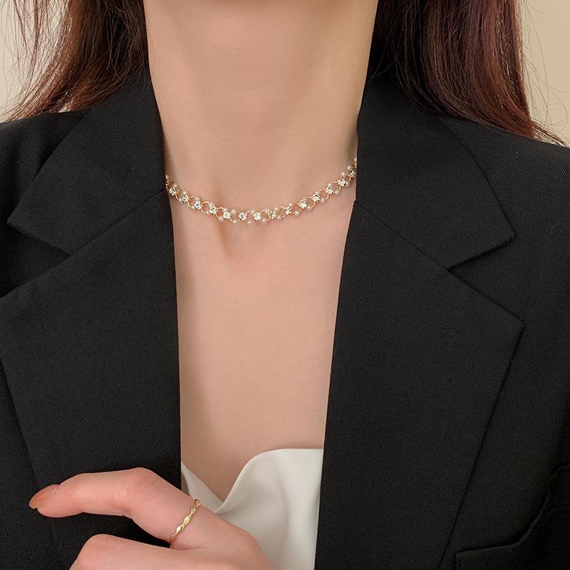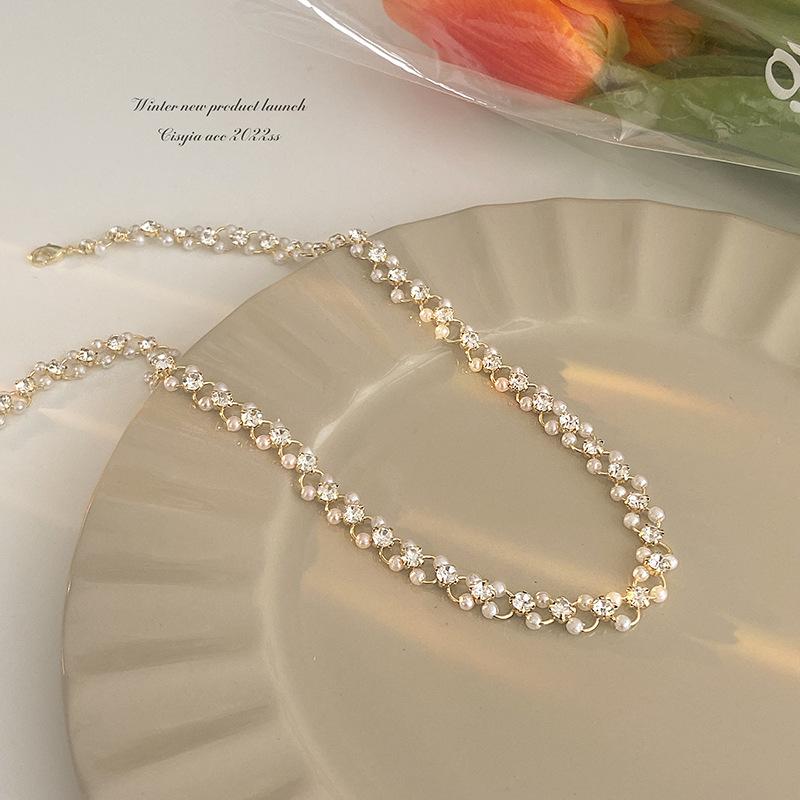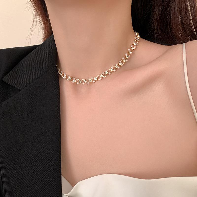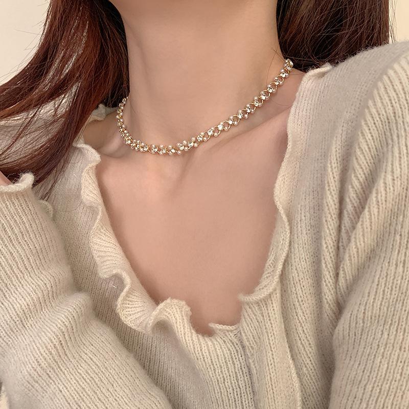 Collar de perlas pequeñas estilo francés con costura de diamantes de imitación, cadena de clavícula para mujer, estilo coreano, elegante collar con diseño de celebridad de Internet, gargantilla