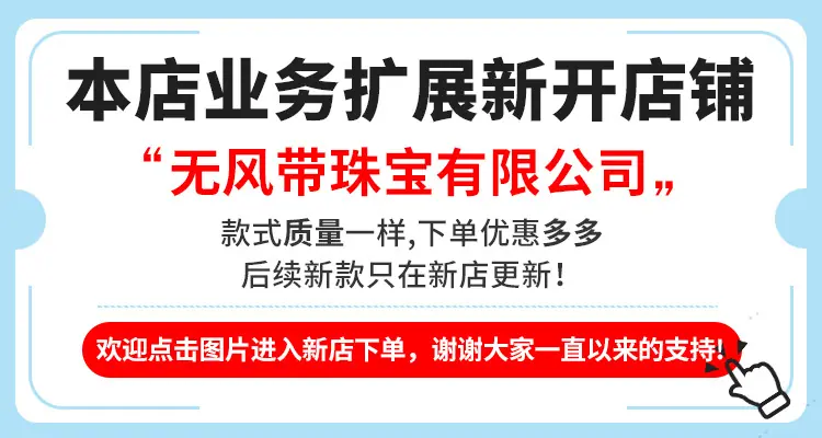 Nuestra empresa está expandiendo su negocio y abriendo una nueva tienda (No Wind Zone Jewelry Co., Ltd.), los estilos y la calidad son los mismos, y hay muchos descuentos por realizar pedidos.