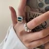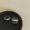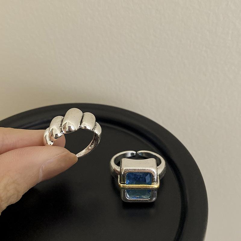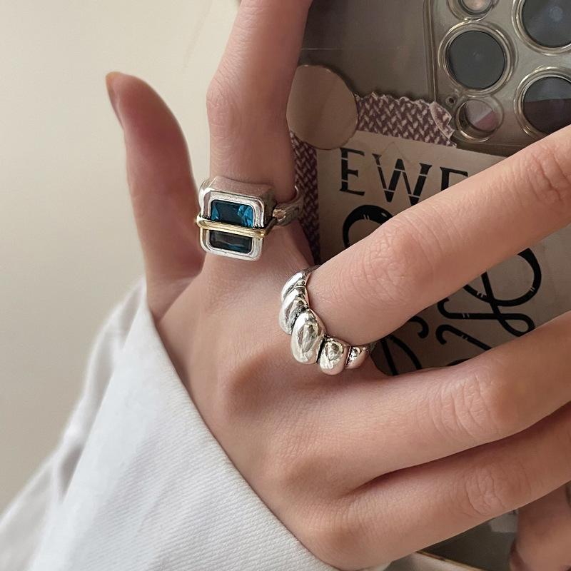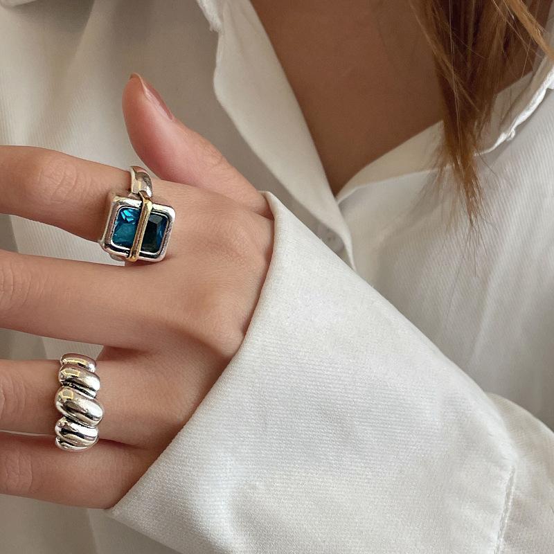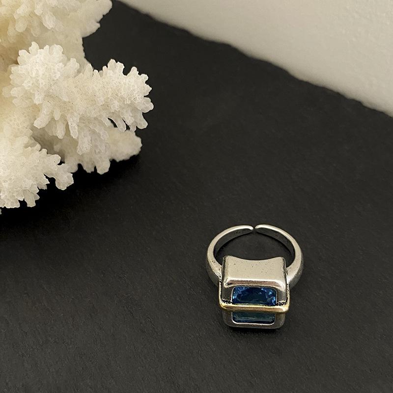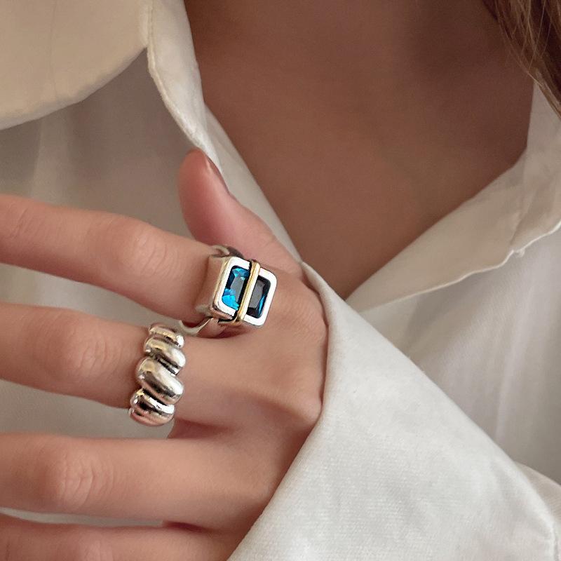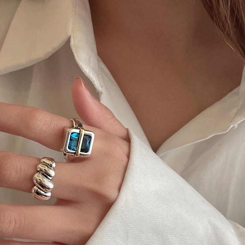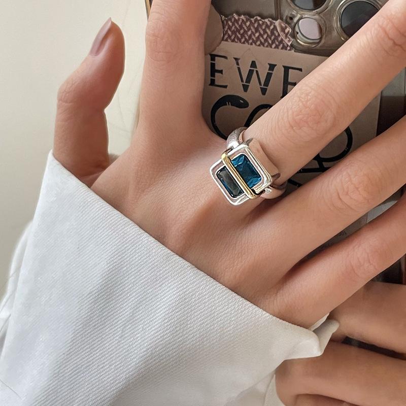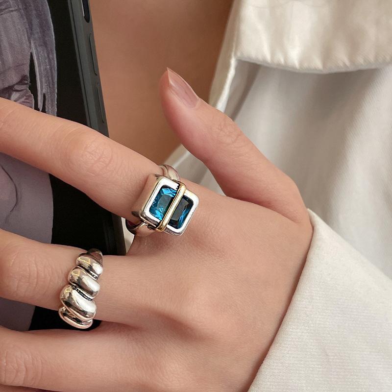 Anillo Simple de Zircón Azul para Mujer Moda Retro Plata S925 Geométrico Color Dividido Anillo Hip-Hop Anillo de Dedo Trendy