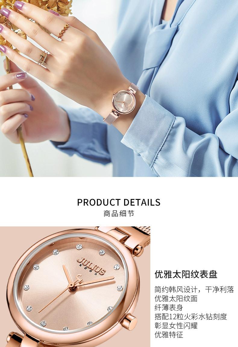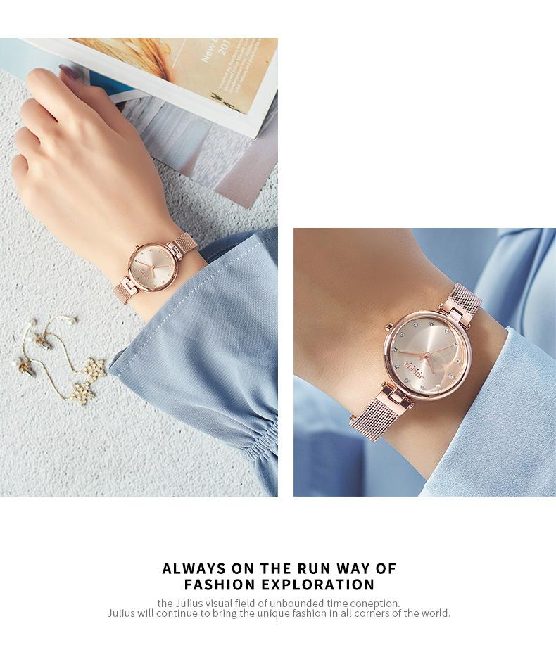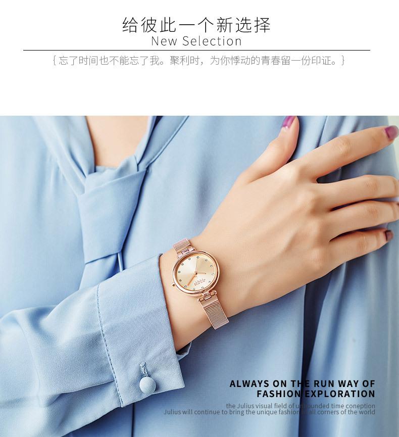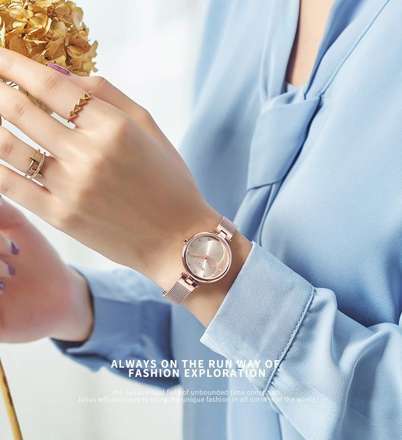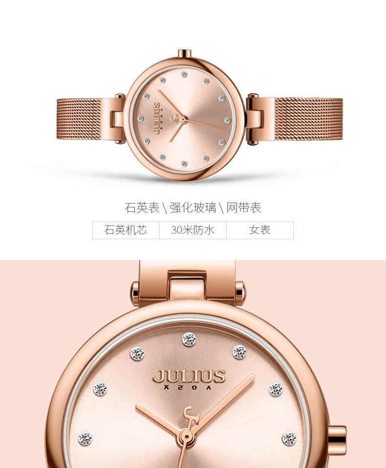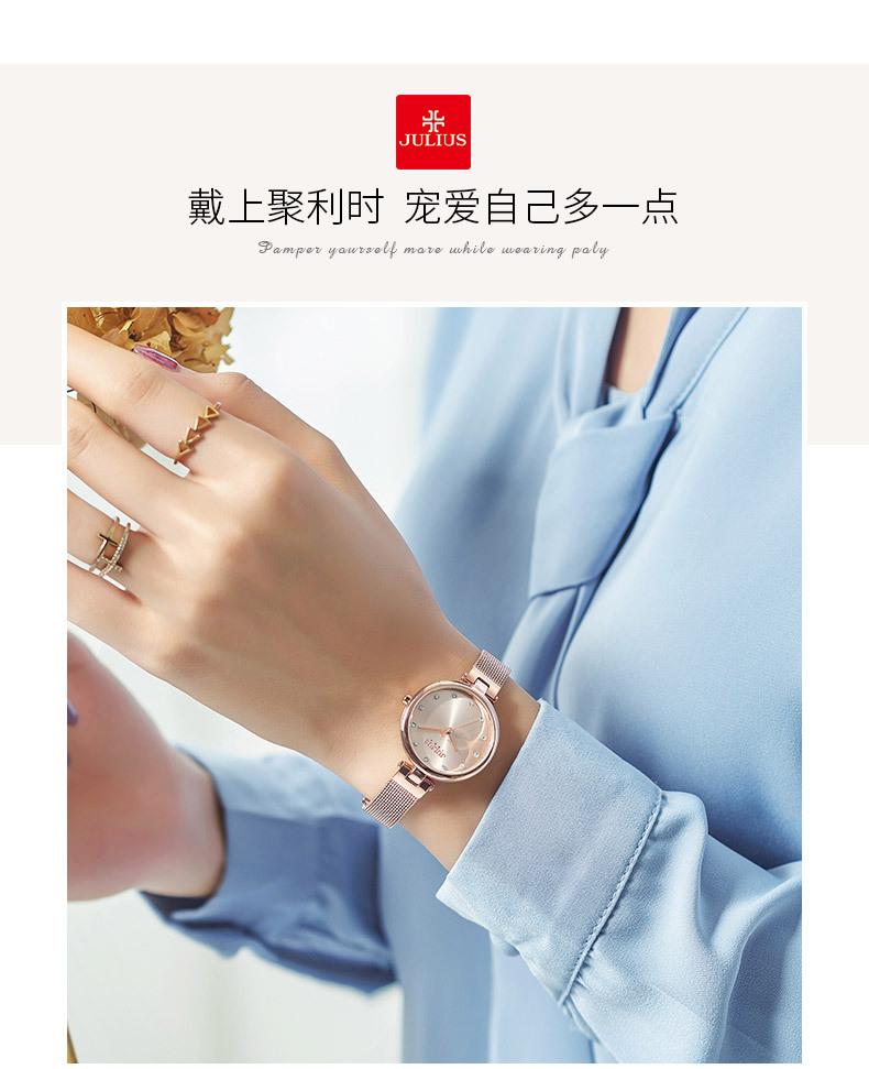 El significado de la marca JULIUS es alegre, único, amoroso, ideal, inusual y brillante. Es un reloj único que te enamorará a primera vista (Just You Will Love, un reloj único y especial). JULIUS toma este nombre y cuenta con siete series principales: Serie Clásica, Serie Emocionante, Serie Brazalete, Serie Exploración, Serie Pareja, Serie Hombre y Serie Edición Limitada.