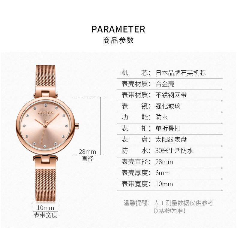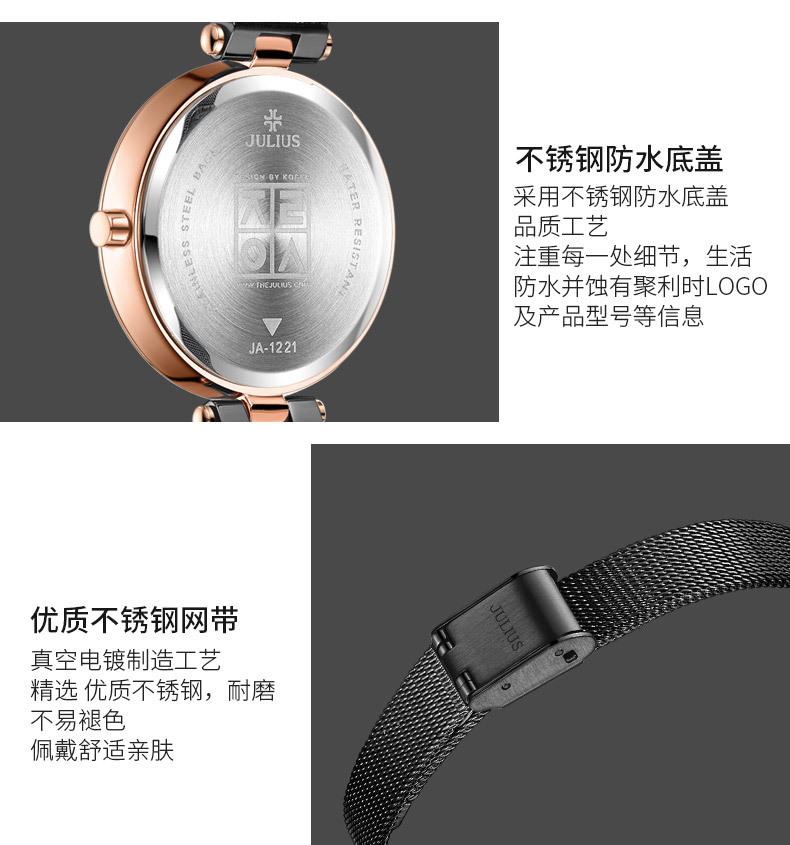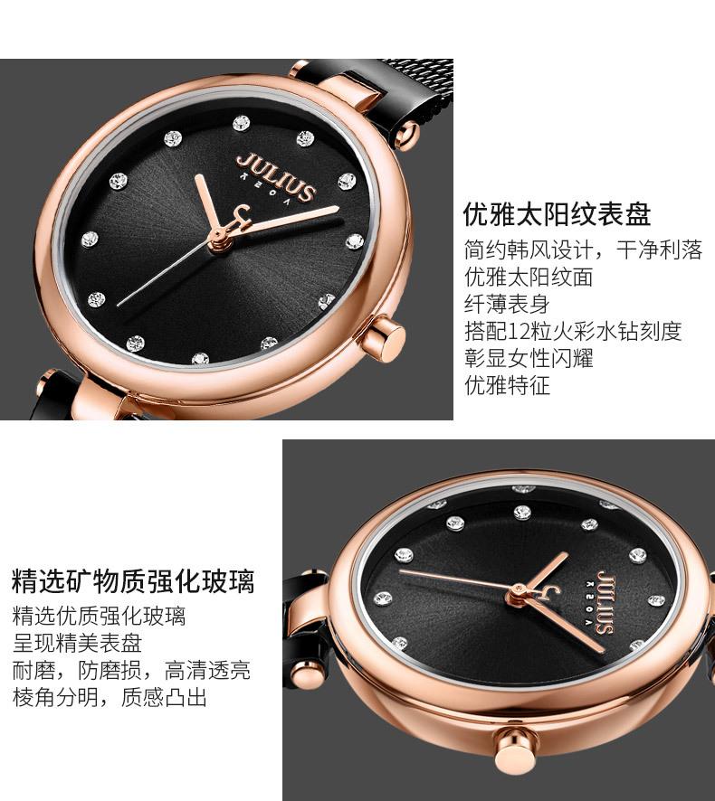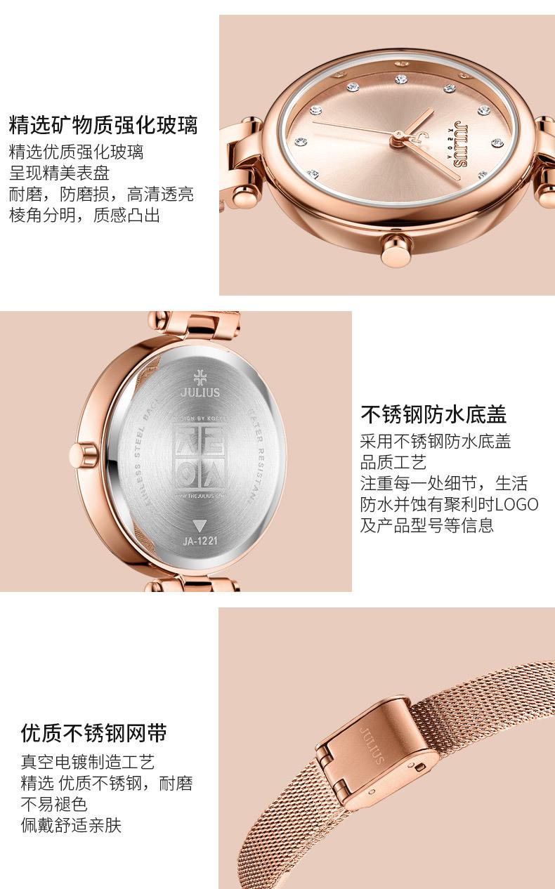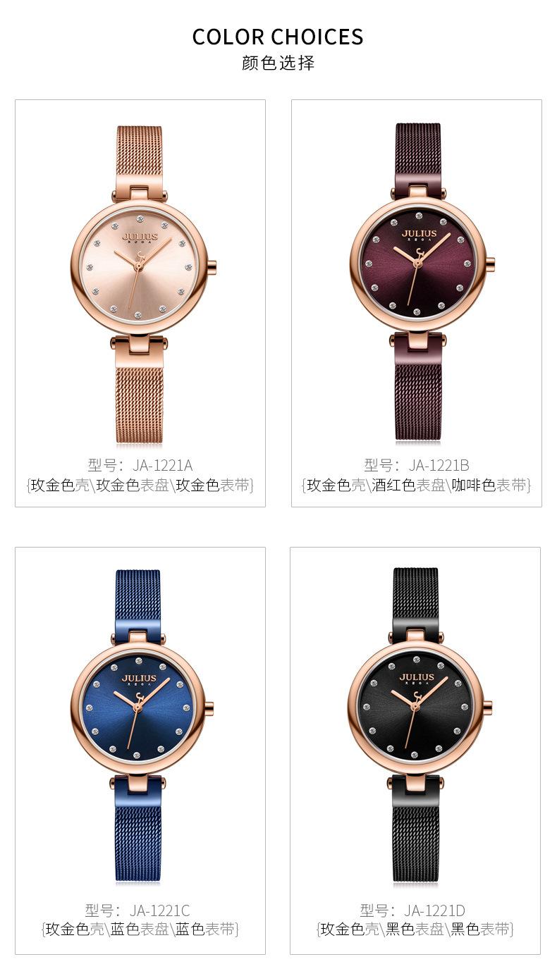 El significado de la marca JULIUS es alegre, único, amoroso, ideal, inusual y brillante. Es un reloj único que te enamorará a primera vista (Just You Will Love, un reloj único y especial). JULIUS toma este nombre y cuenta con siete series principales: Serie Clásica, Serie Emocionante, Serie Brazalete, Serie Exploración, Serie Pareja, Serie Hombre y Serie Edición Limitada.