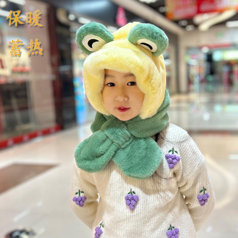 Gorro de rana cálido para niños, conjunto de dos piezas de gorro y bufanda de invierno para niños, gorro forrado de polar para niñas.