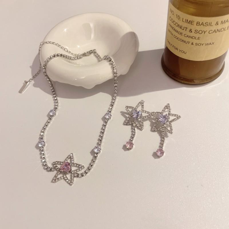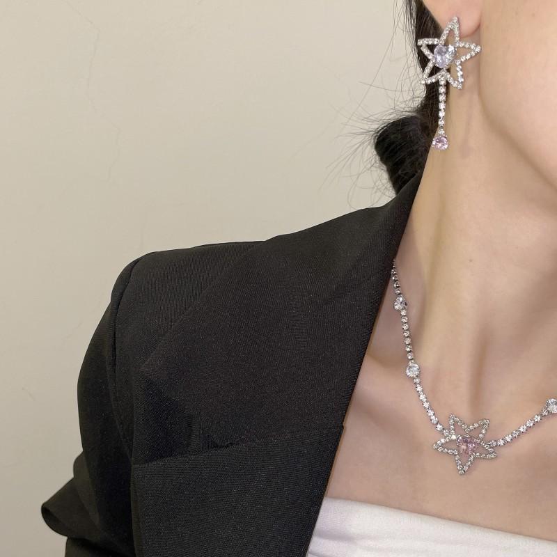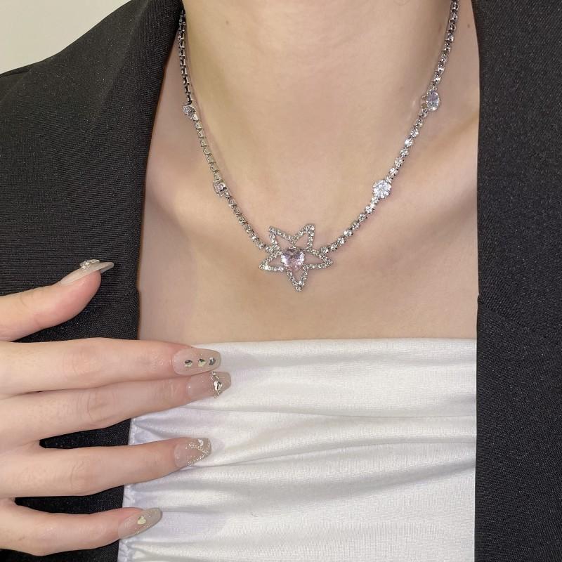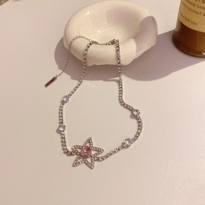 Collar de estrella de cinco puntas de lujo ligero para mujer, cadena de clavícula de diamante rosa con nicho de temperamento, estrellas brillantes, pendientes de estrella de cinco puntas