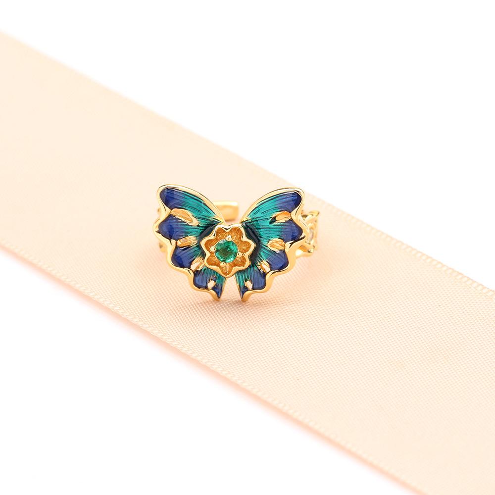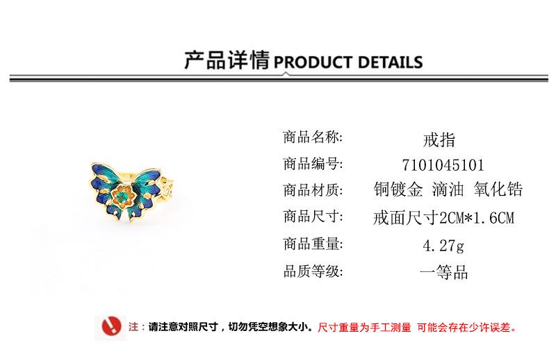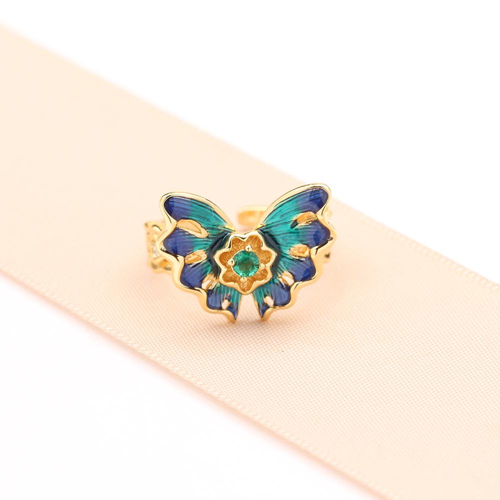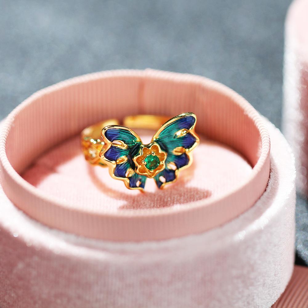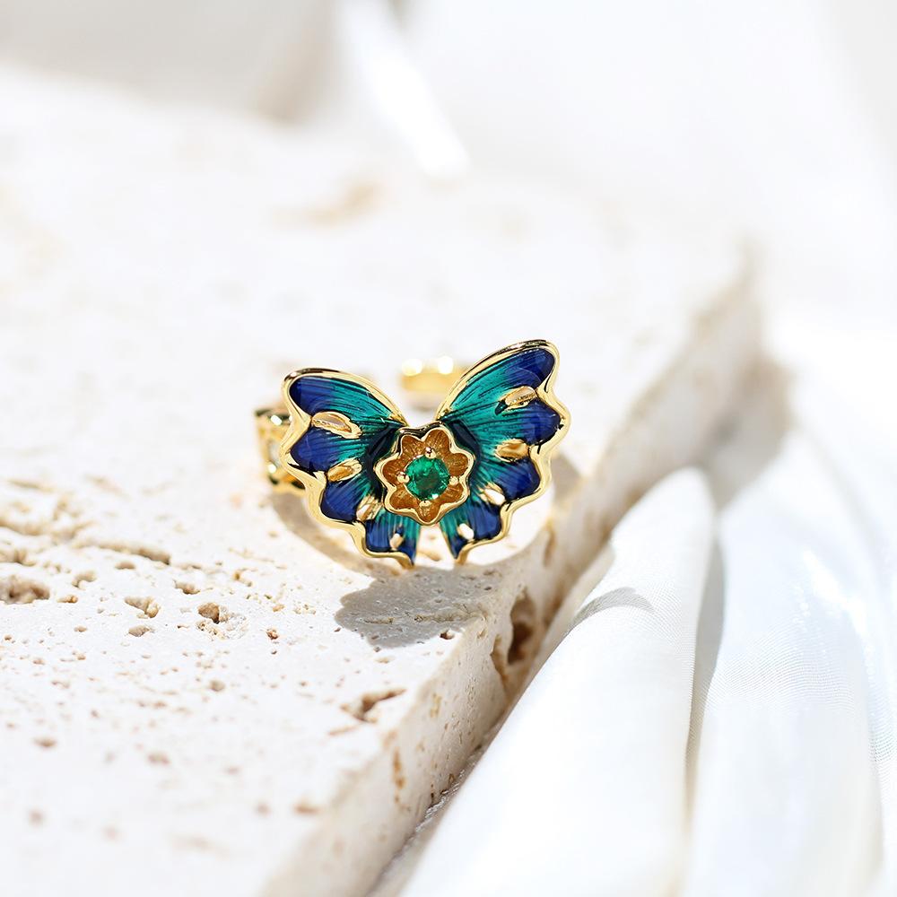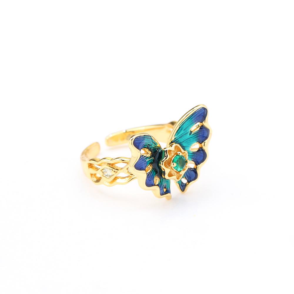 Nuevo anillo de mariposa azul elegante de alta gama con aceite goteado, anillo simple versátil chapado en oro abierto ajustable para el dedo índice