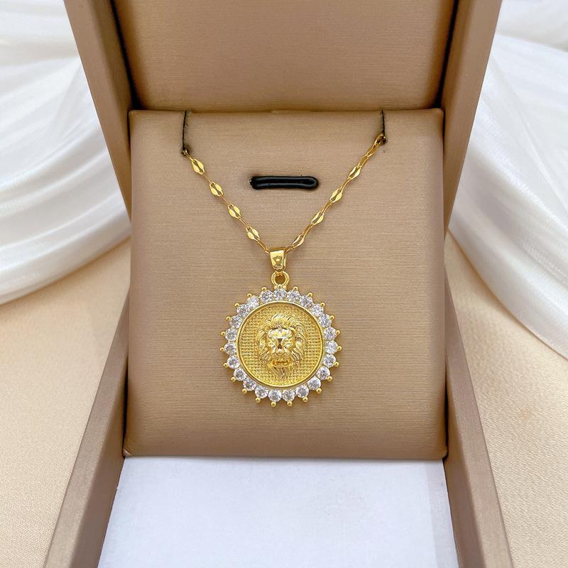 [Acero titanio] Collar de diamantes elegante y lujoso con cabeza de león redonda y cadena de clavícula para mujer, de acero titanio.