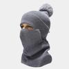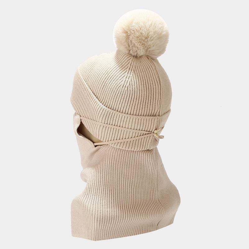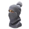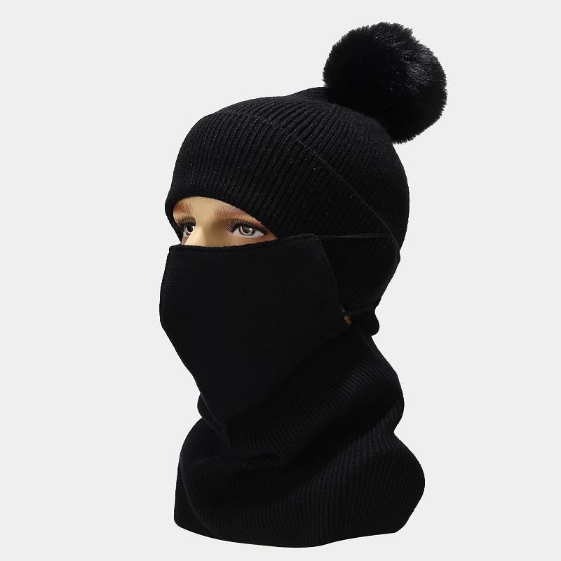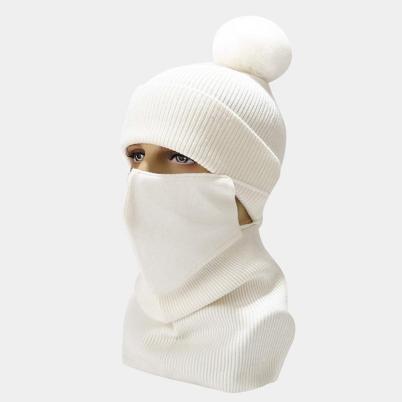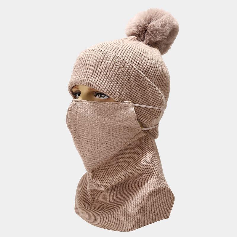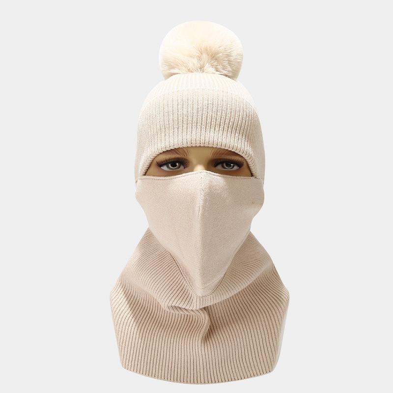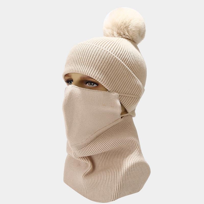 Conjunto de Tres Piezas de Gorro de Punto Protector de Otoño e Invierno, Bufanda y Máscara para Mujer con Pompon de Piel, Gorro para Montar a Prueba de Frío y Protección Facial, Gorro Cálido