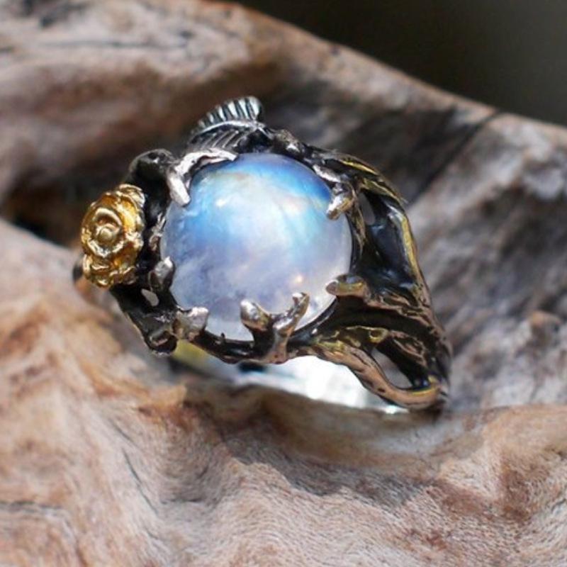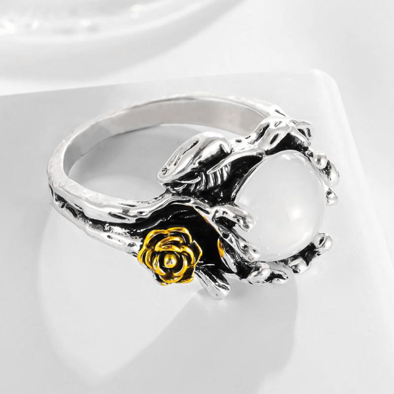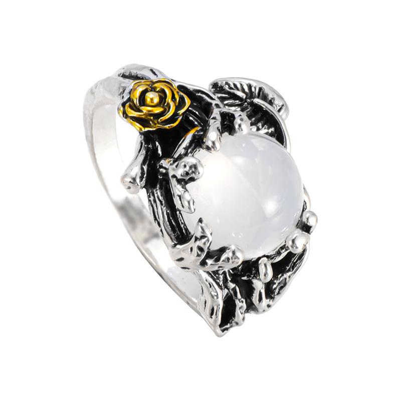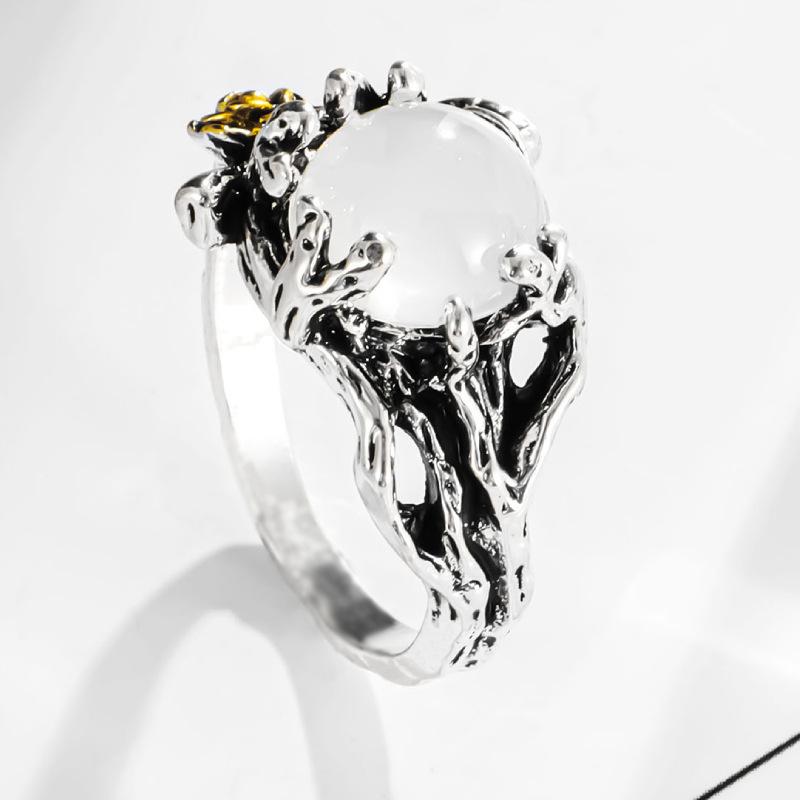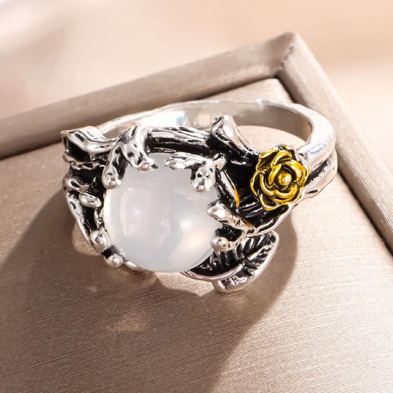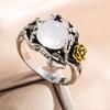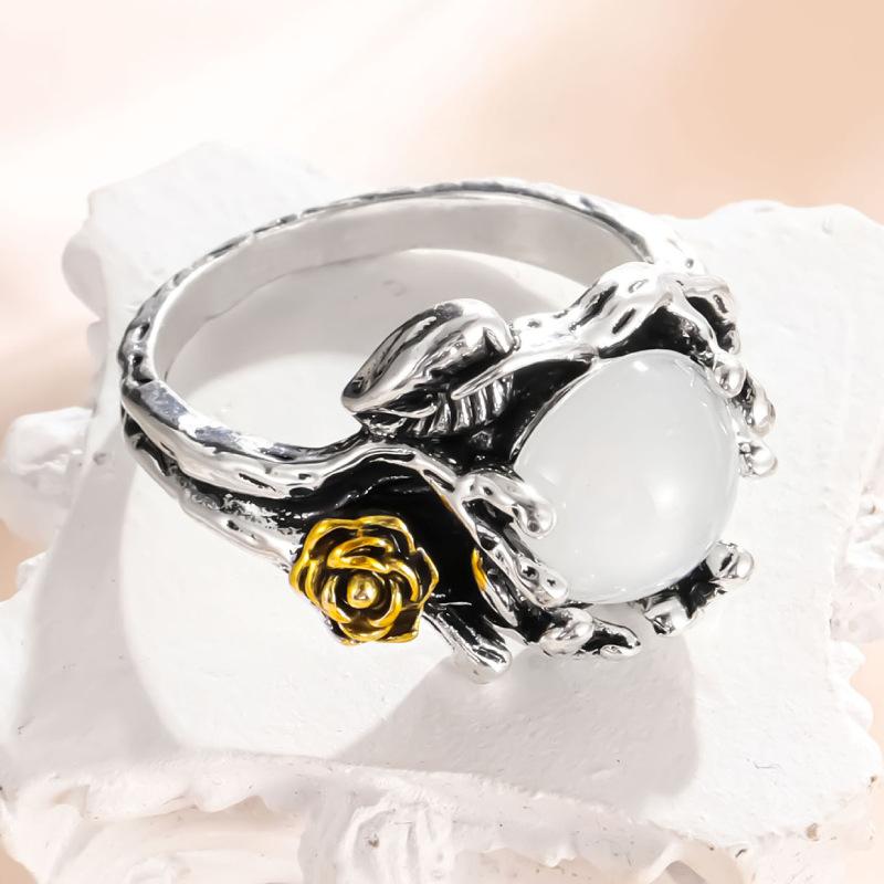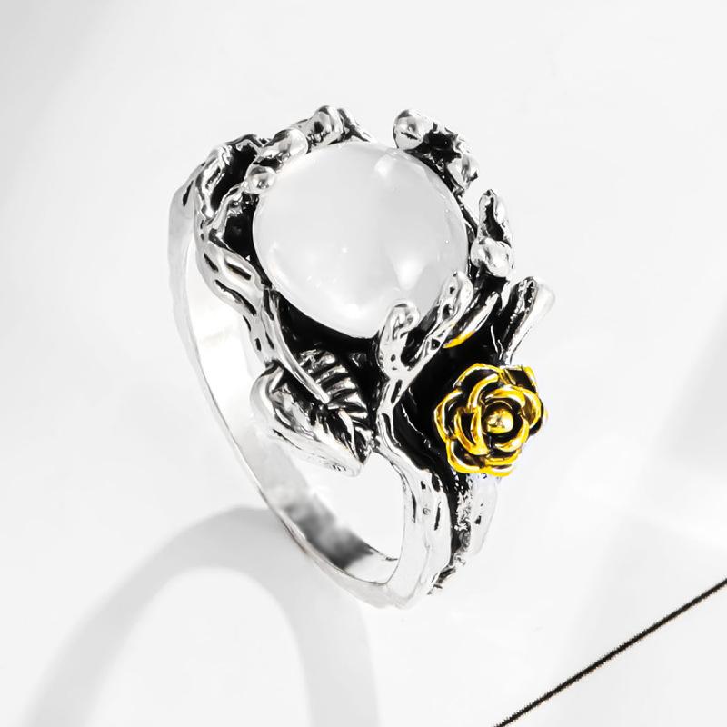 Ebay venta caliente color oro rosa separación árbol hoja anillo transfronterizo europeo y americano retro piedra lunar anillo femenino al por mayor