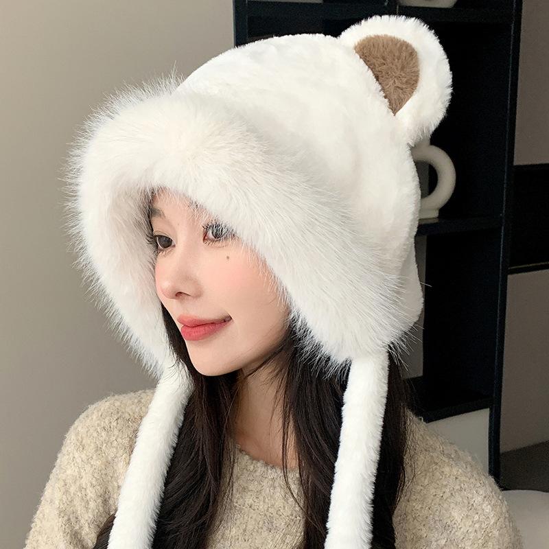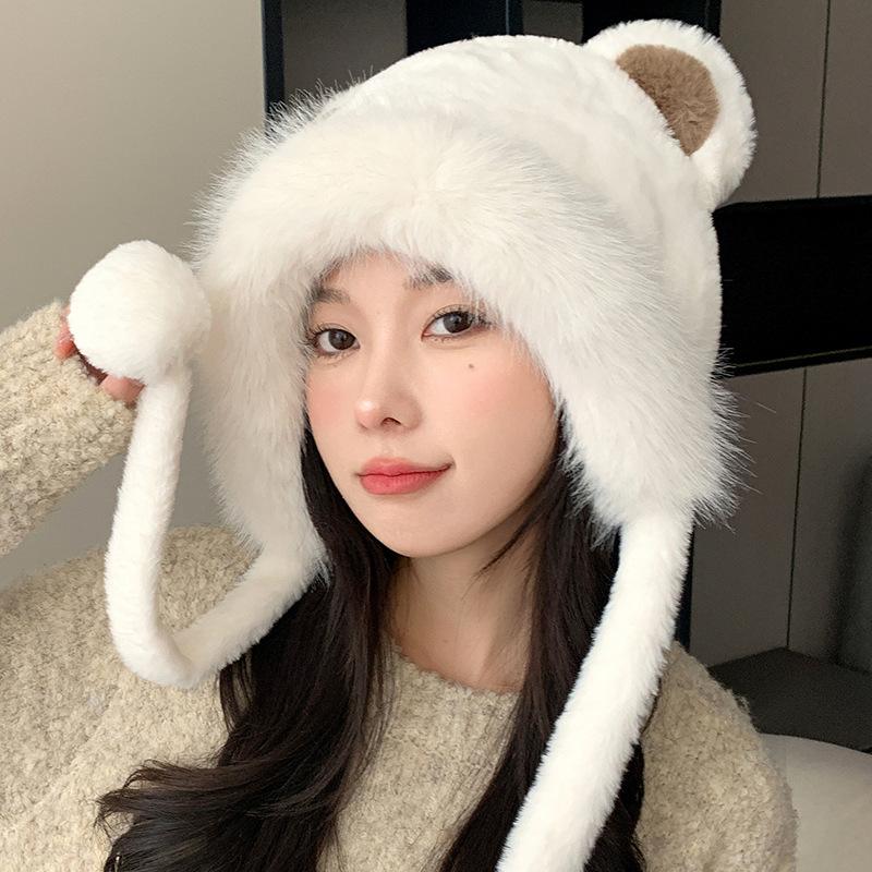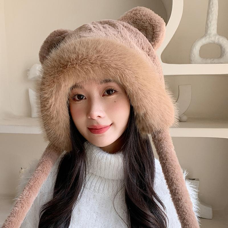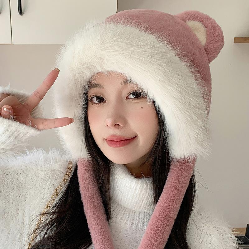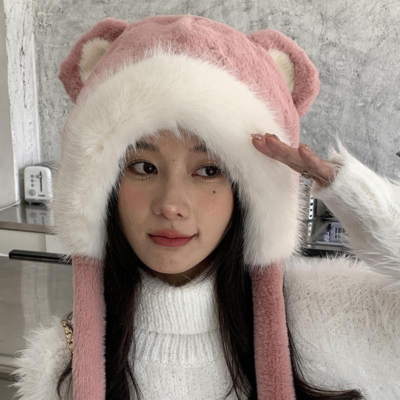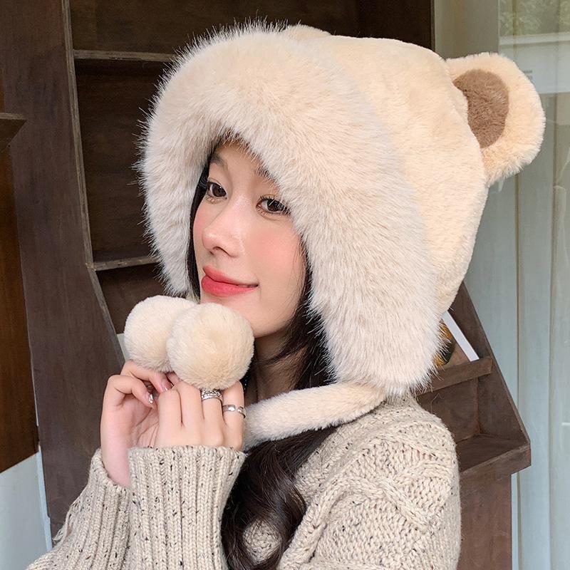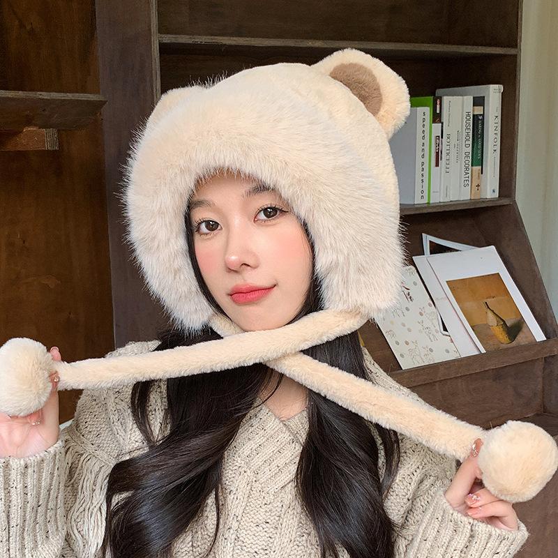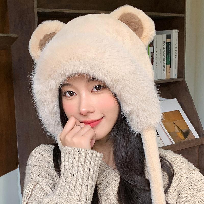 Gorro de peluche con orejas de oso para otoño e invierno, bonito gorro coreano para mujer, a prueba de frío, con orejeras forradas de vellón, para montar.