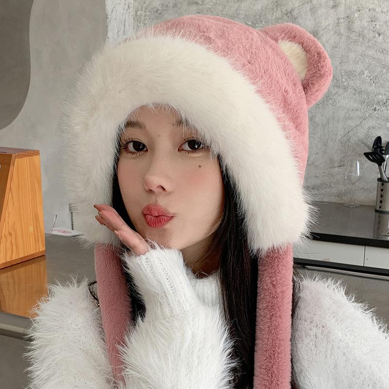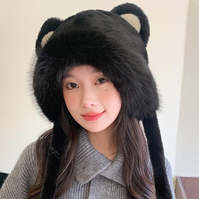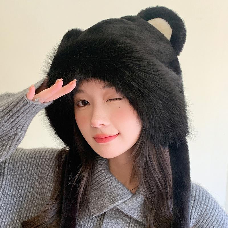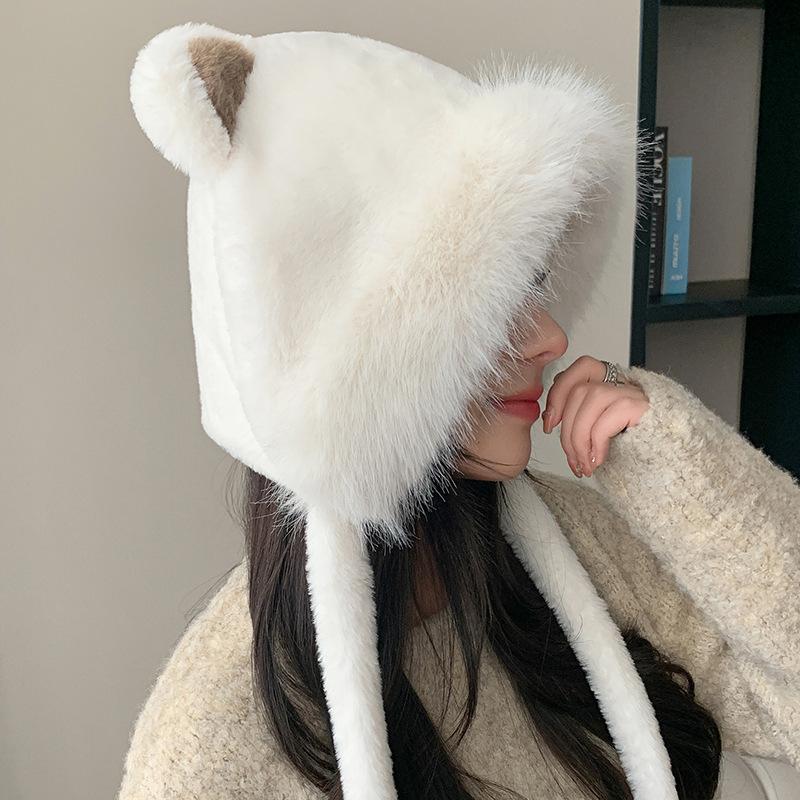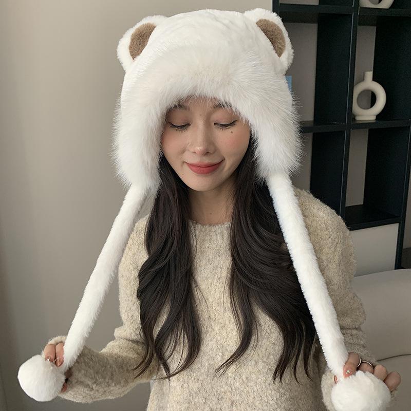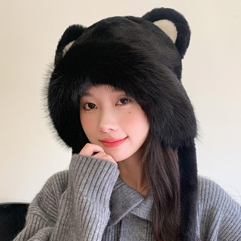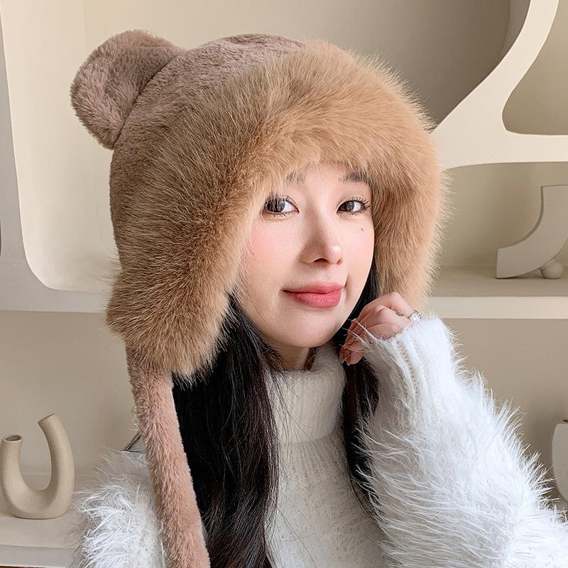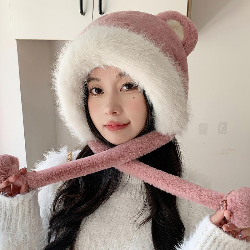 Gorro de peluche con orejas de oso para otoño e invierno, bonito gorro coreano para mujer, a prueba de frío, con orejeras forradas de vellón, para montar.