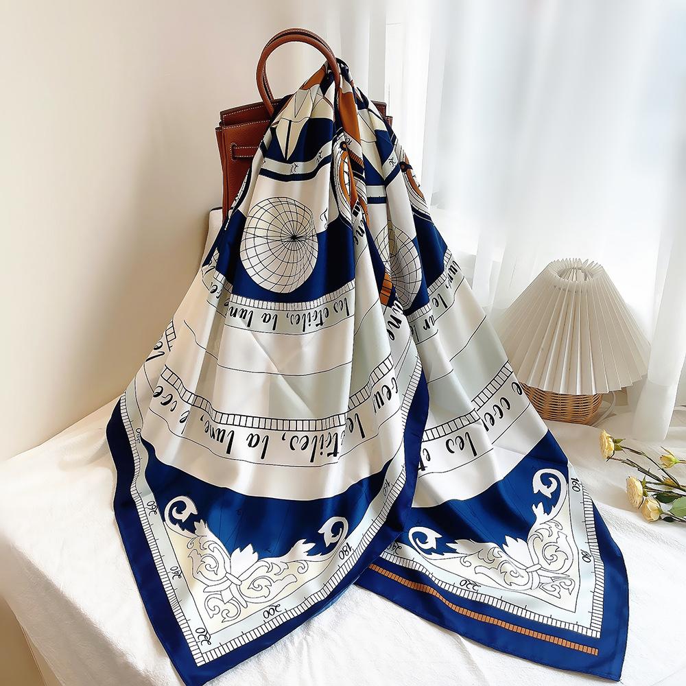 Nueva bufanda cuadrada grande con estampado de flores del lago del océano de sarga gruesa de seda de 130 cm x 130 cm para otoño e invierno