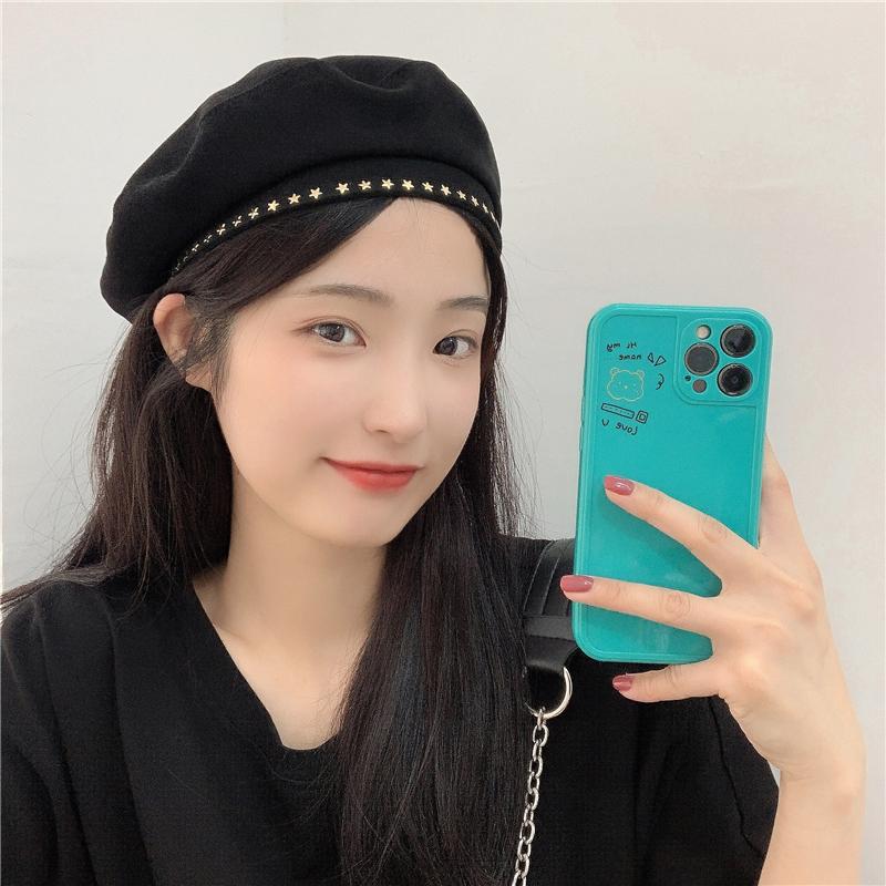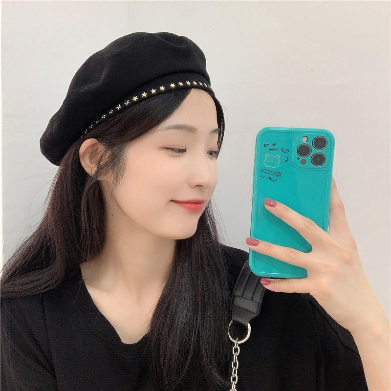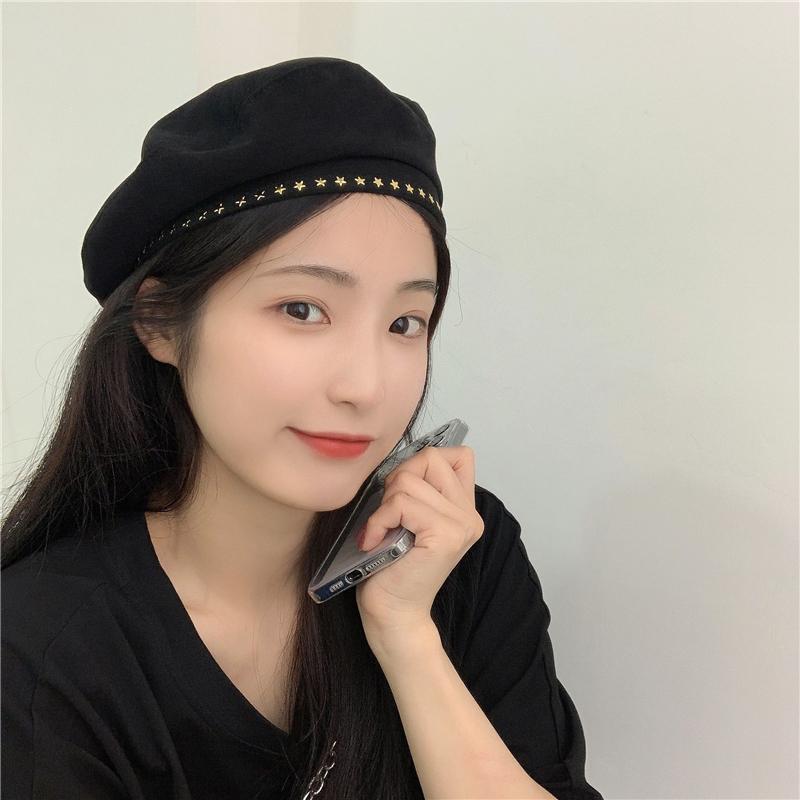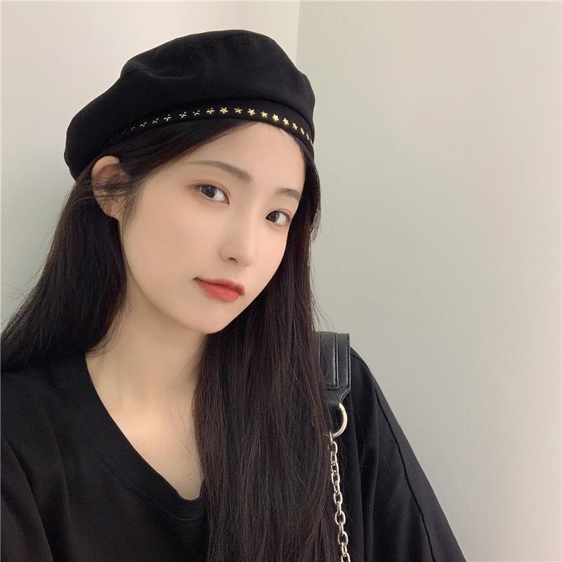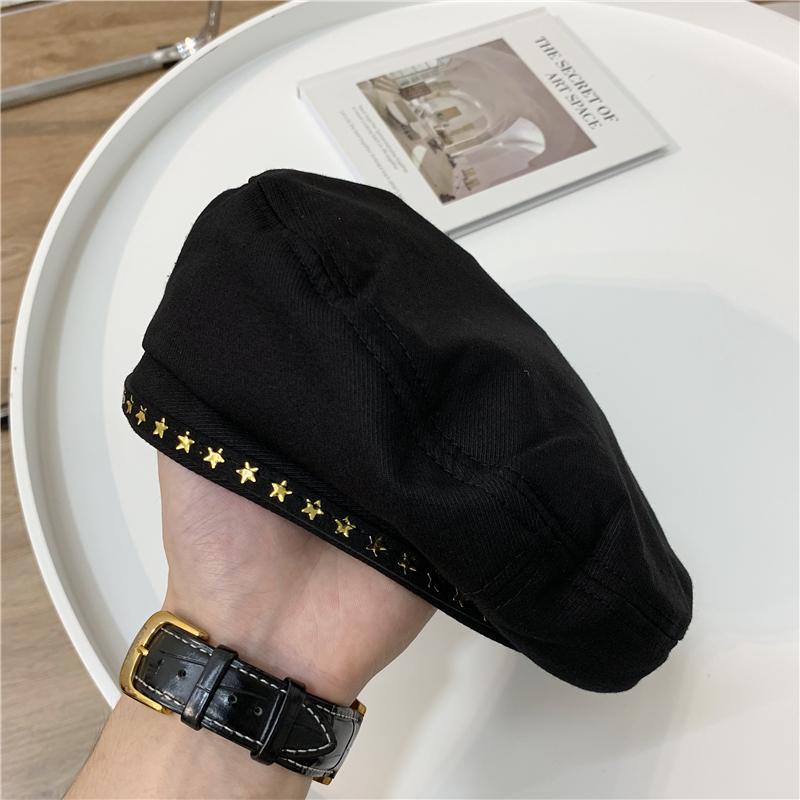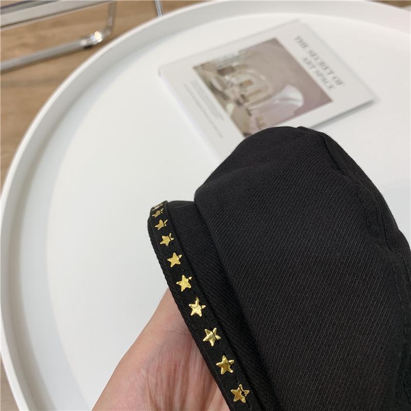 Dulce Estilo Cool ~ Boina Negra de Estrella de Metal para Mujer Verano Delgada Transpirable Sombrero de Pintor Elegante Moda Sombrero Octogonal