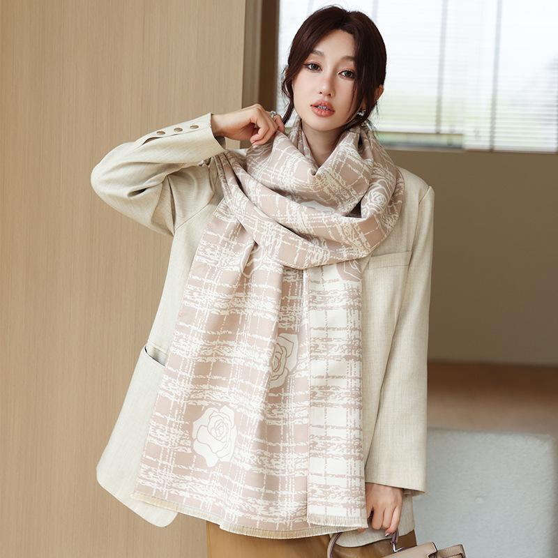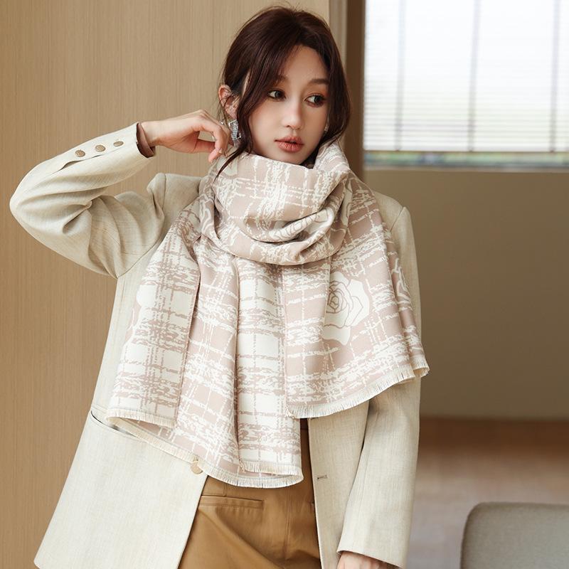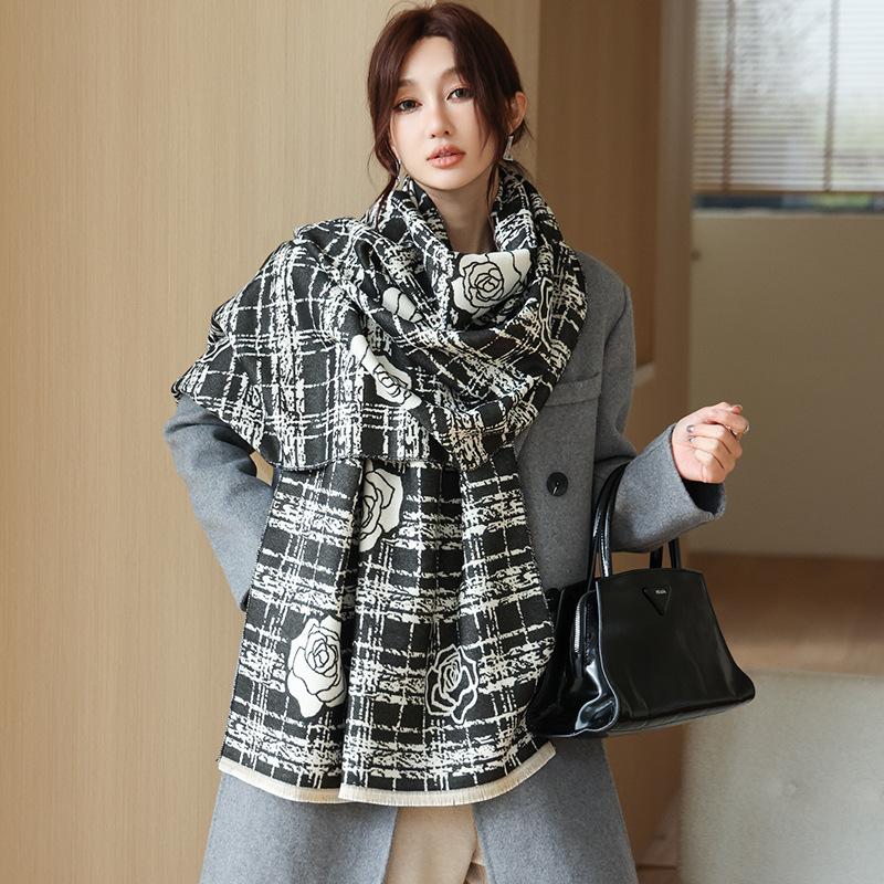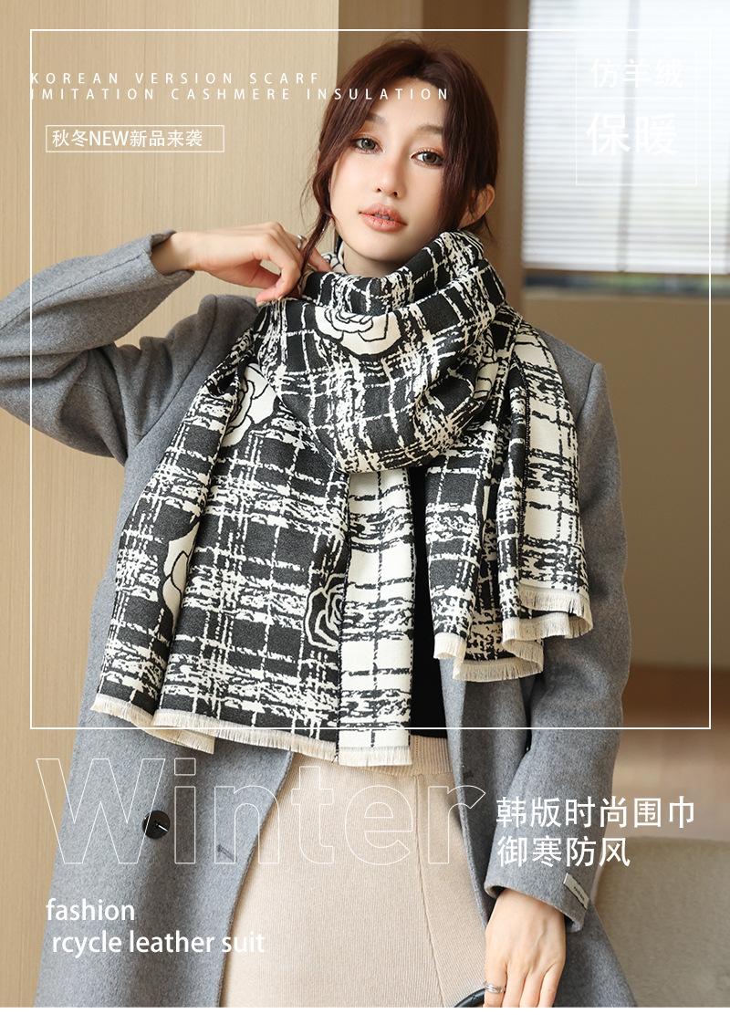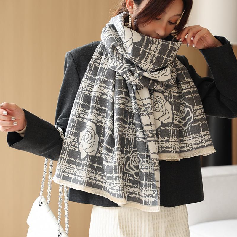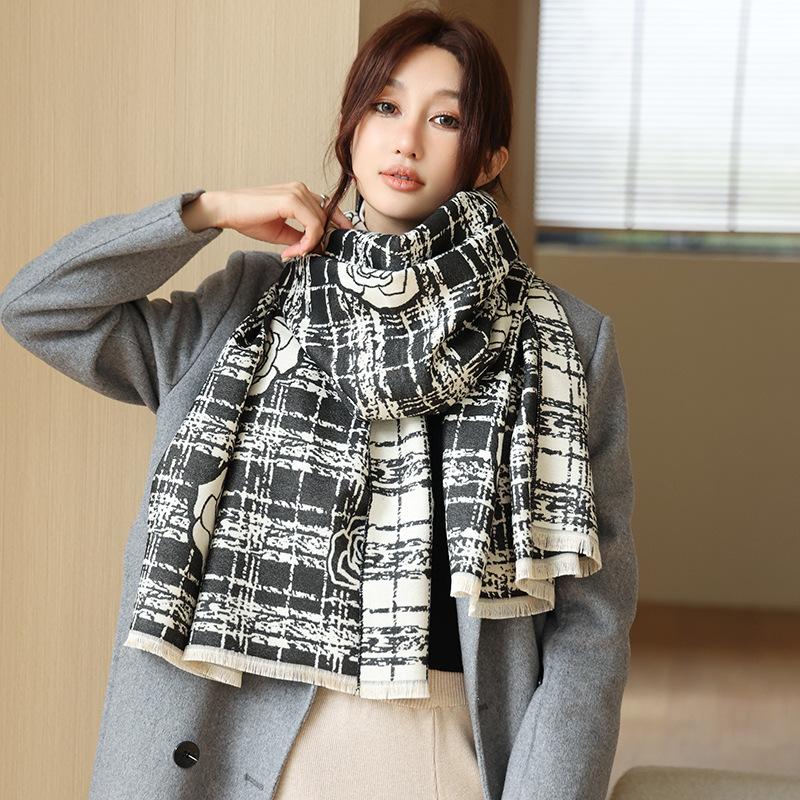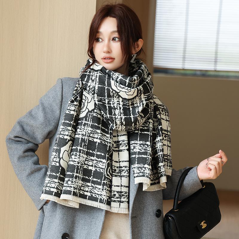 Bufanda de cachemira de imitación de camelia de estilo coreano para mujer, cálida y gruesa de invierno, bufanda de estudiante de doble cara, chal grande de doble cara para protegerse del frío.