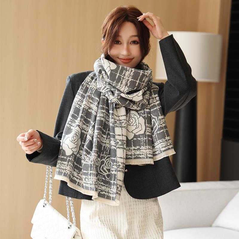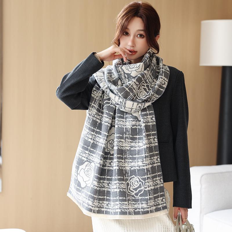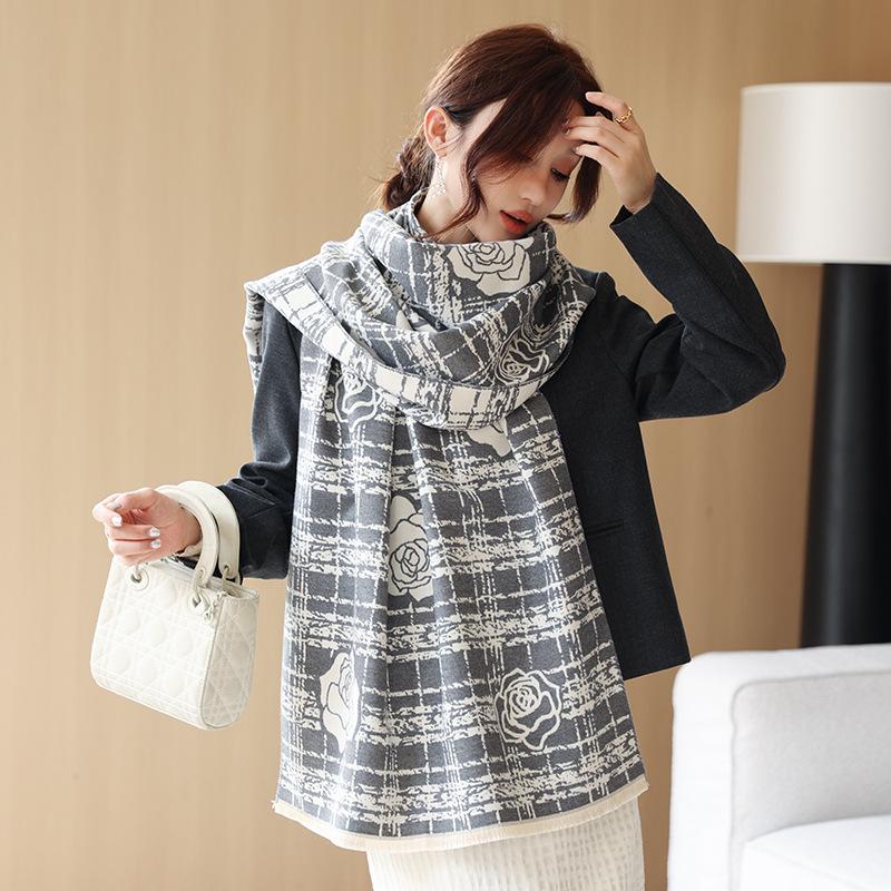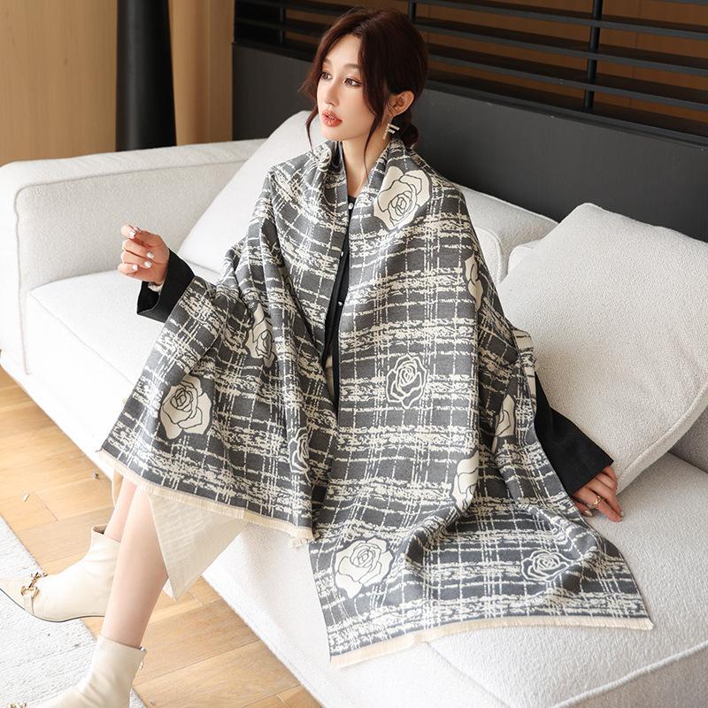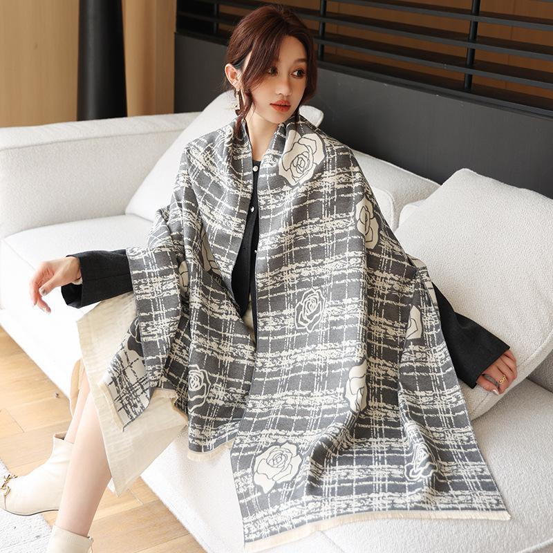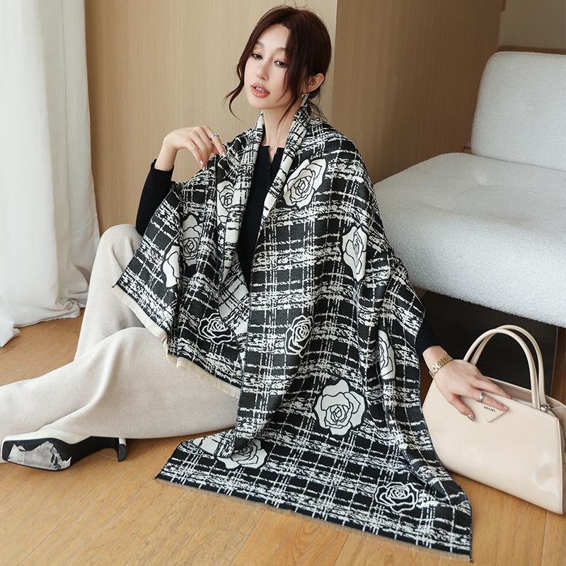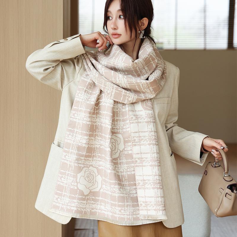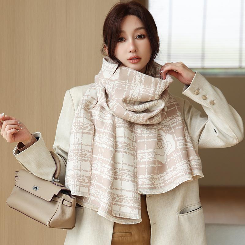 Bufanda de cachemira de imitación de camelia de estilo coreano para mujer, cálida y gruesa de invierno, bufanda de estudiante de doble cara, chal grande de doble cara para protegerse del frío.