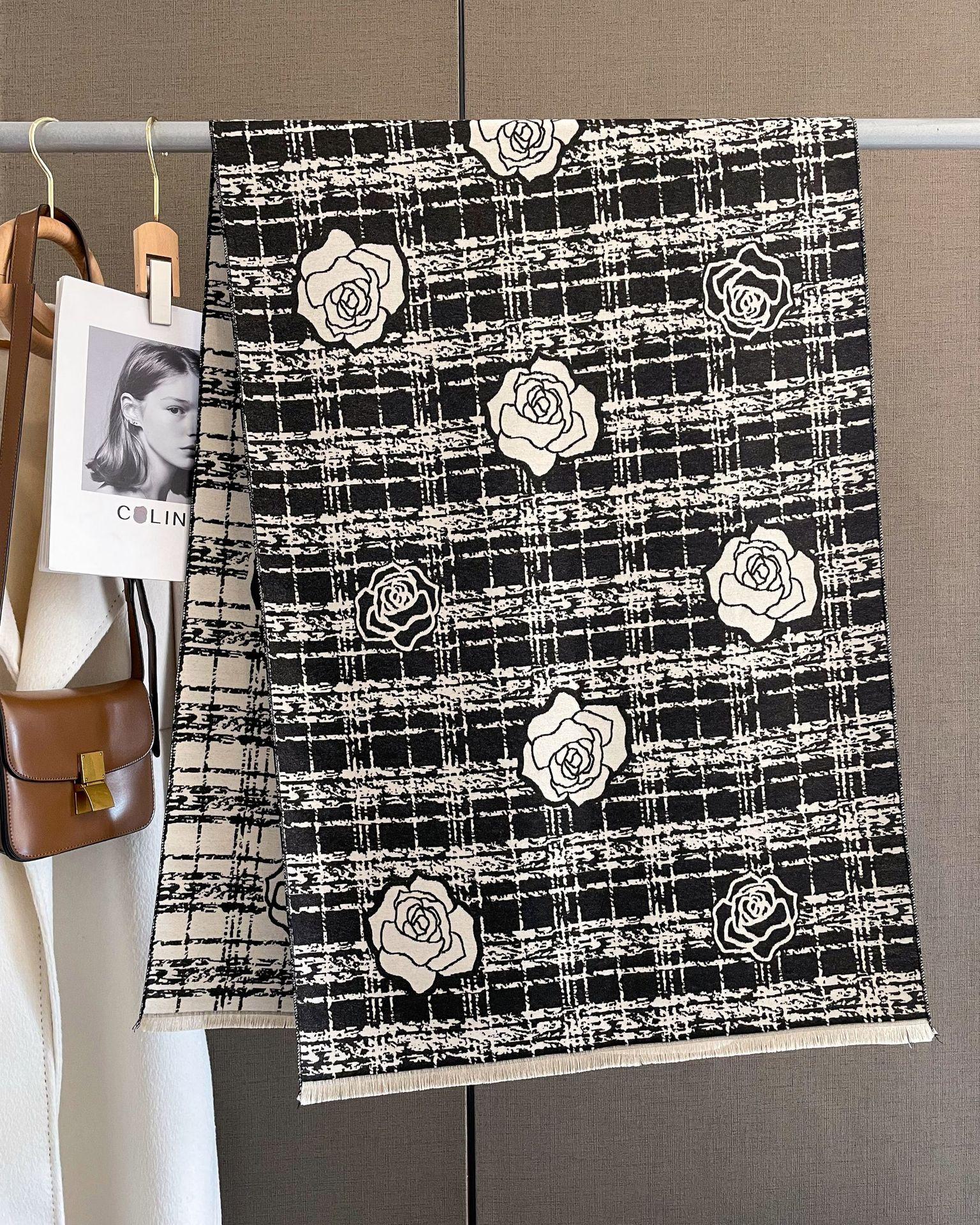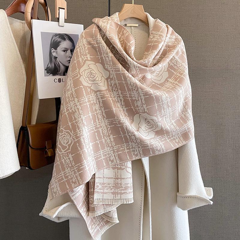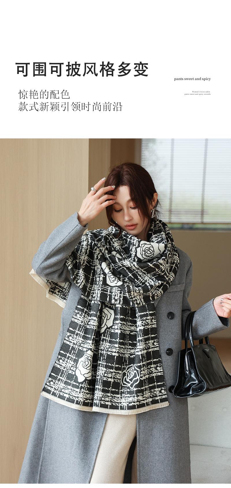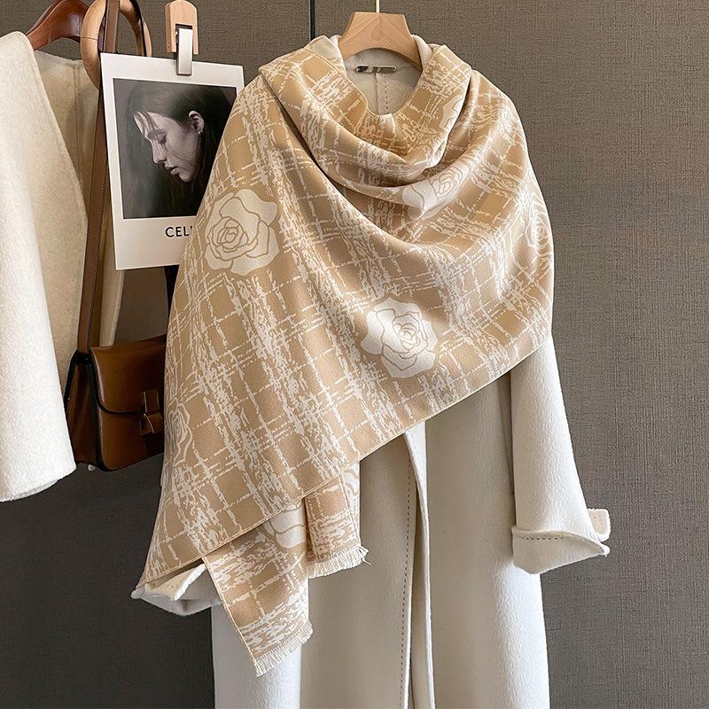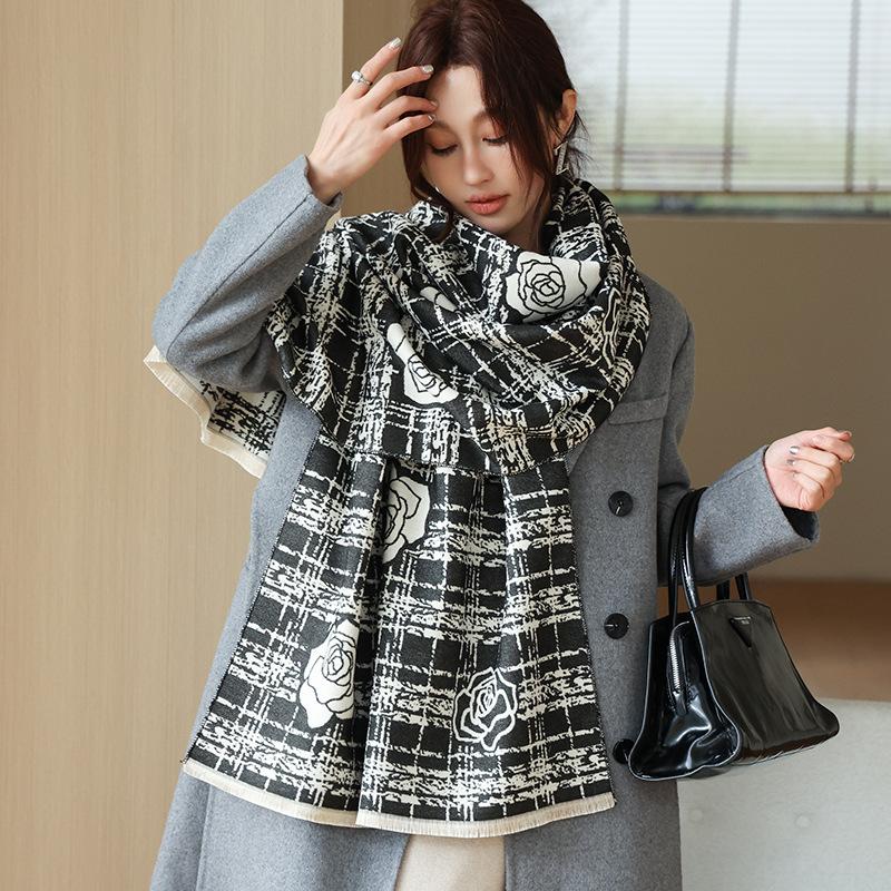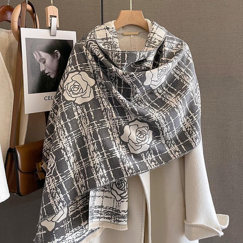 Bufanda de cachemira de imitación de camelia de estilo coreano para mujer, cálida y gruesa de invierno, bufanda de estudiante de doble cara, chal grande de doble cara para protegerse del frío.