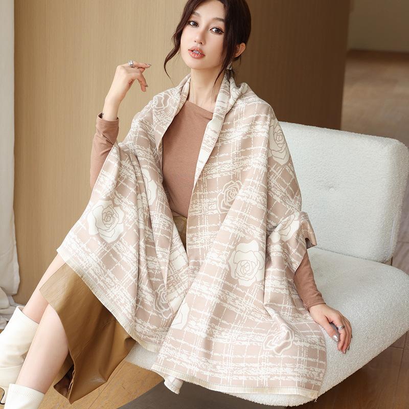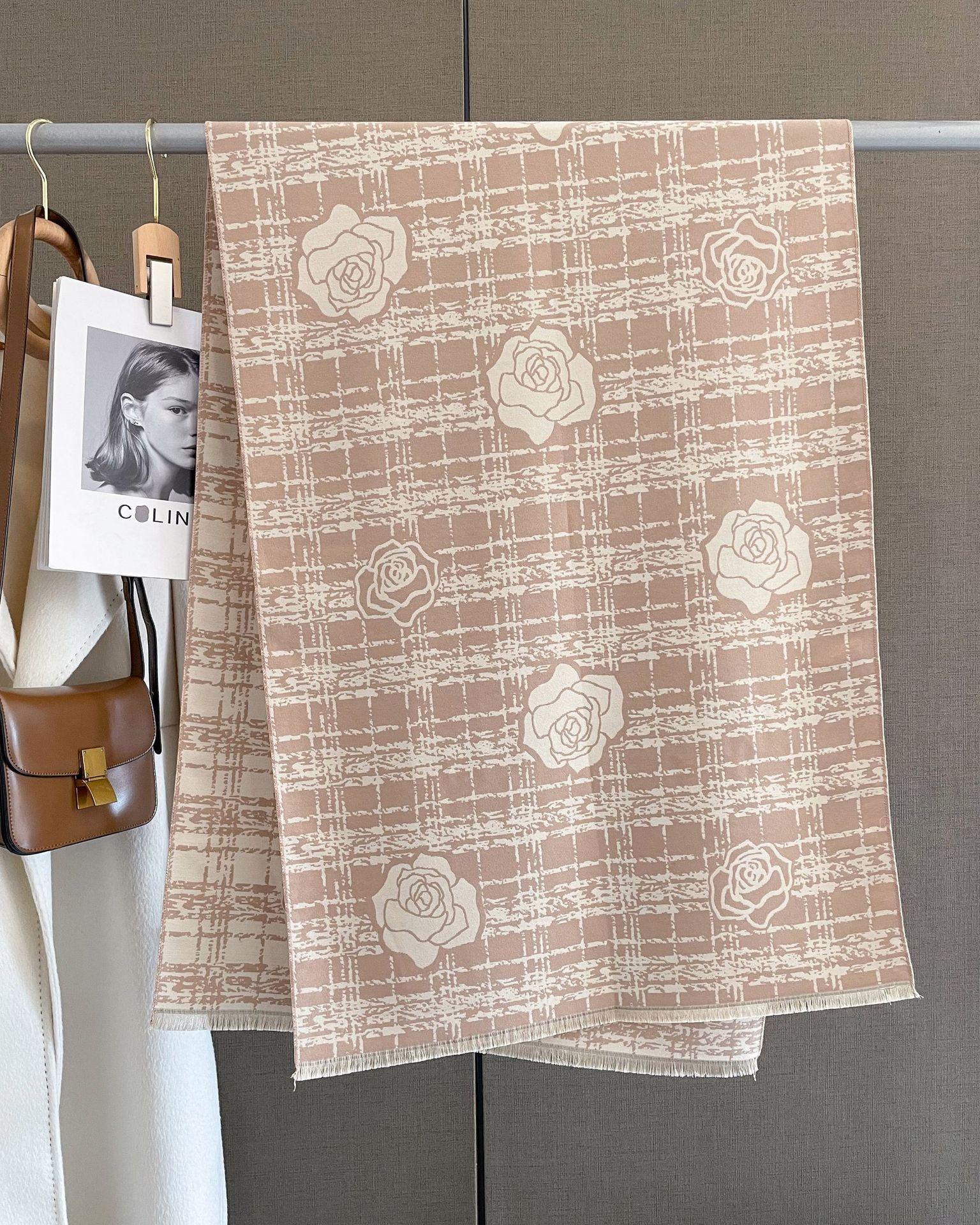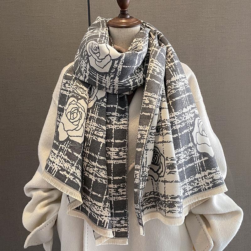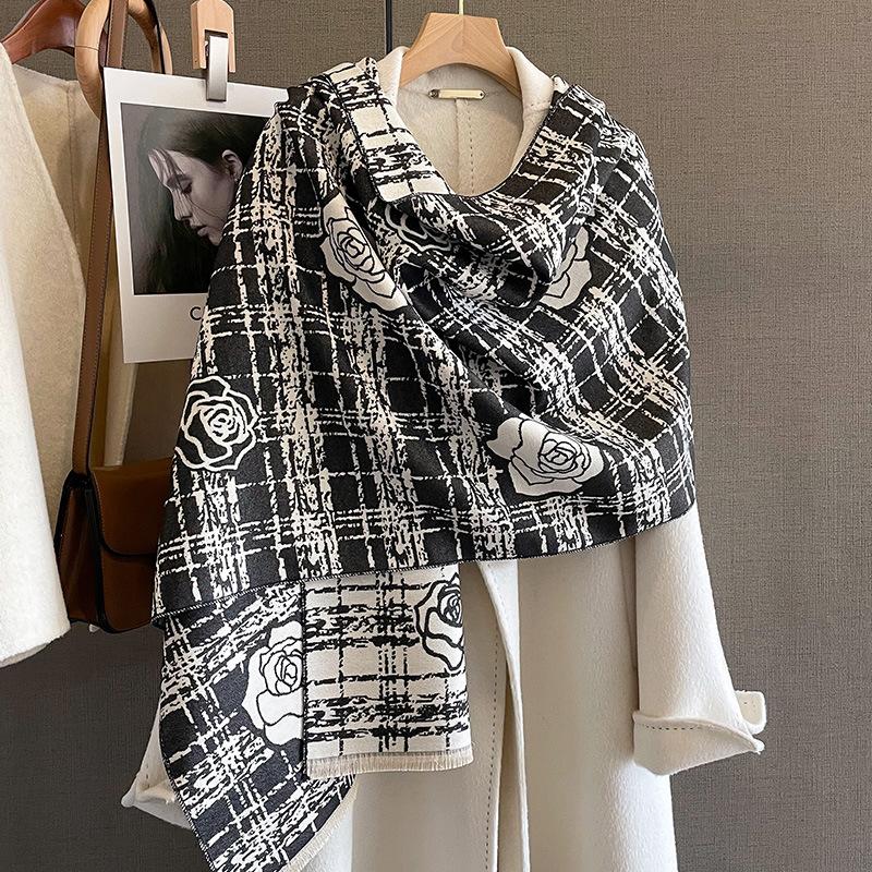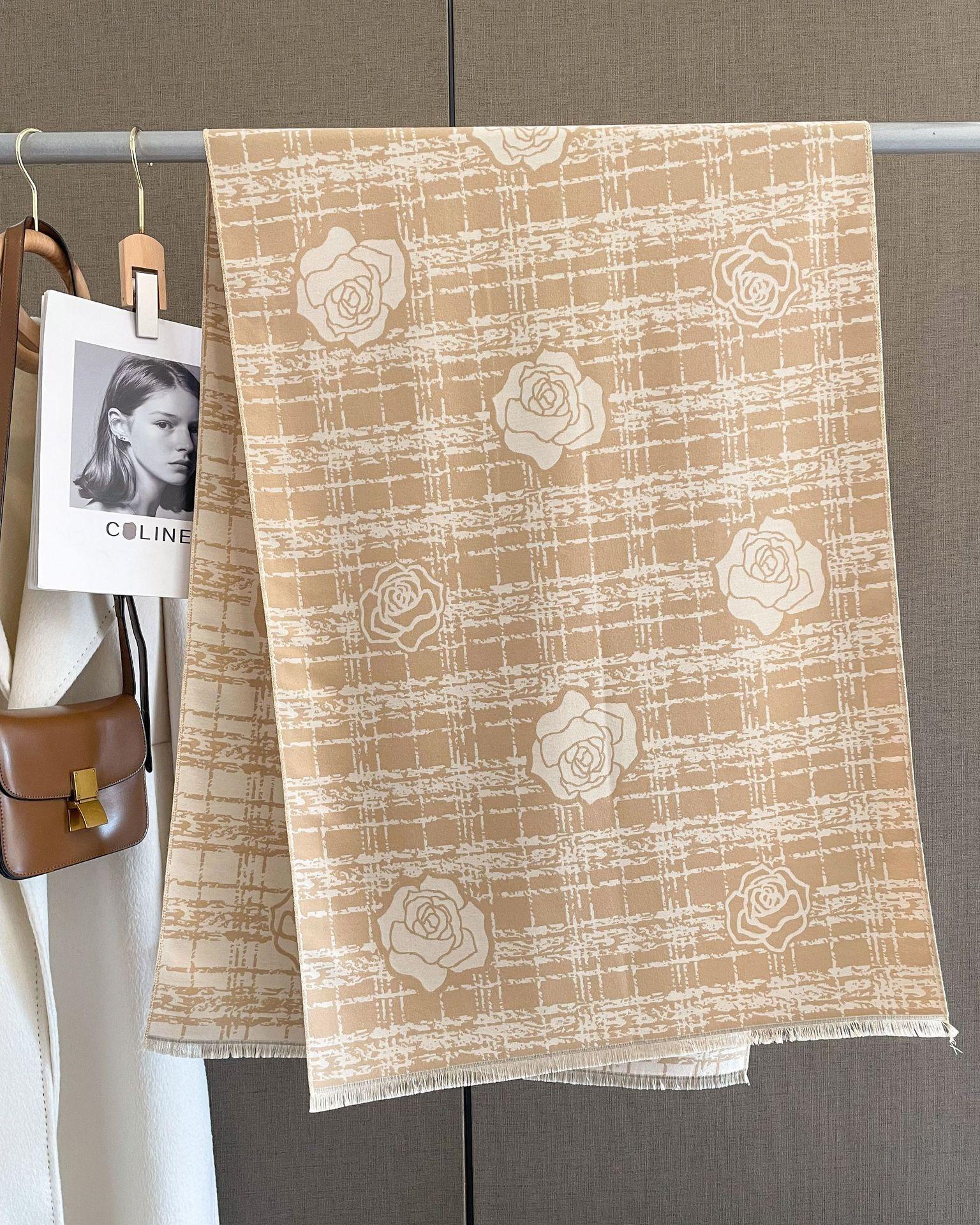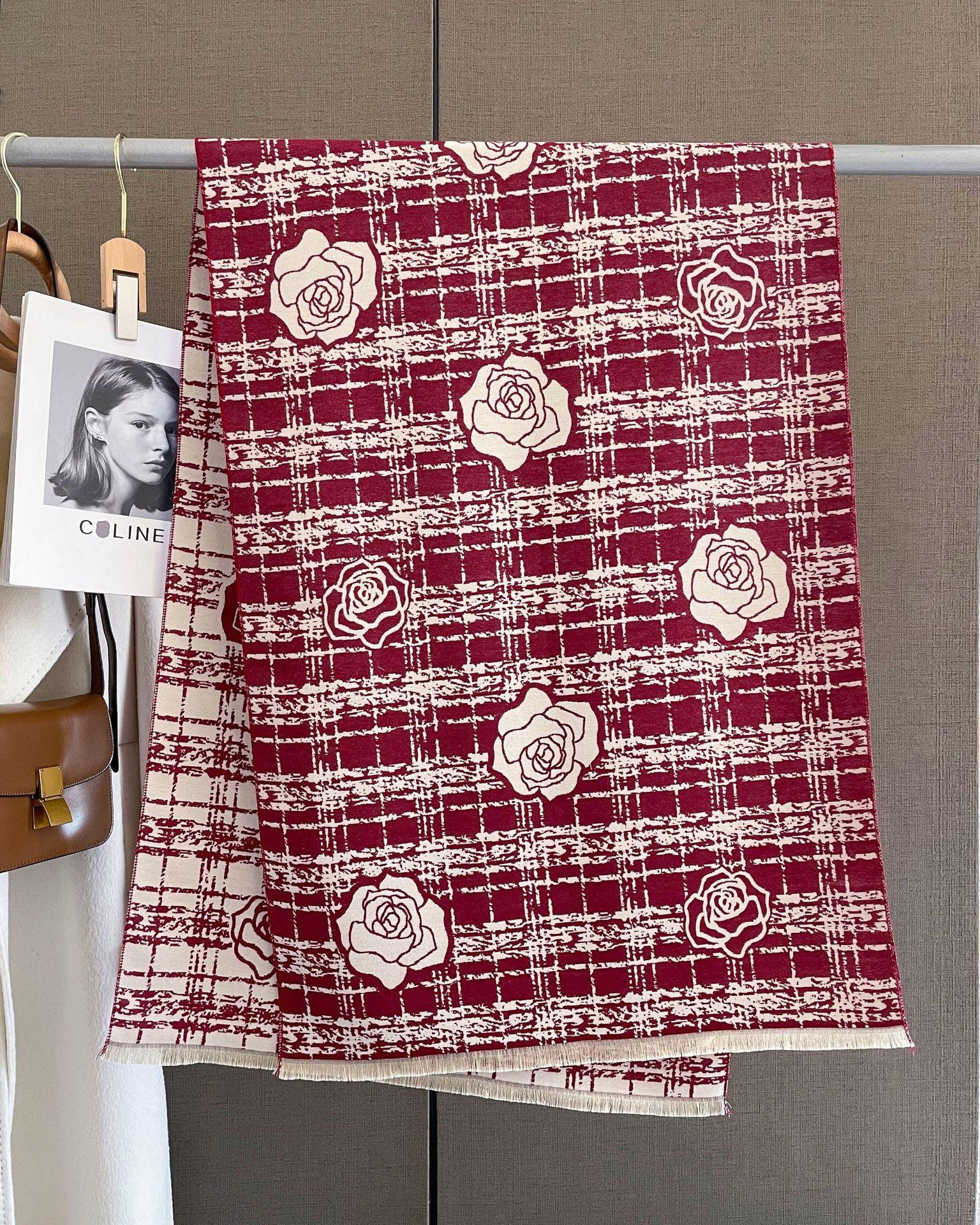 Bufanda de cachemira de imitación de camelia de estilo coreano para mujer, cálida y gruesa de invierno, bufanda de estudiante de doble cara, chal grande de doble cara para protegerse del frío.