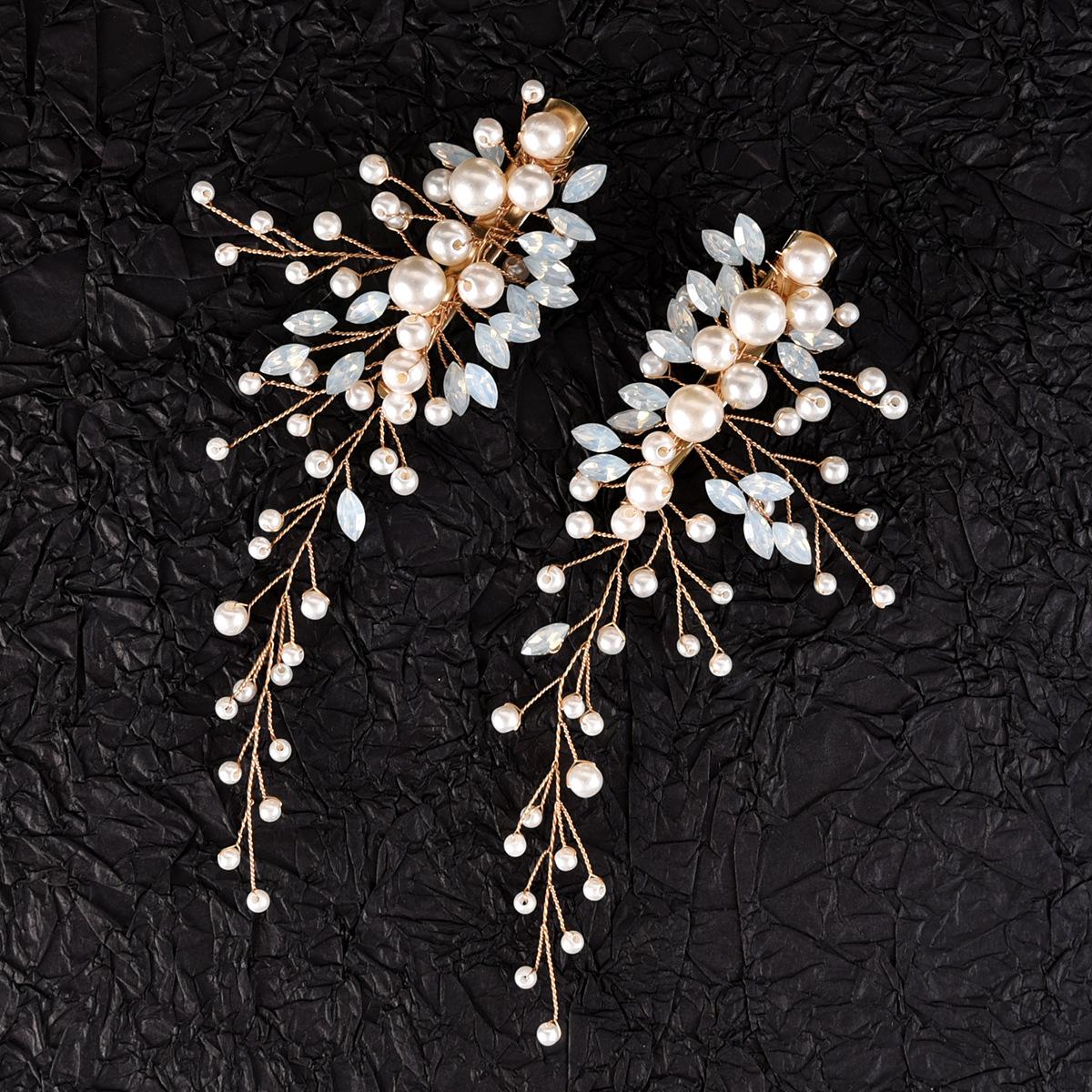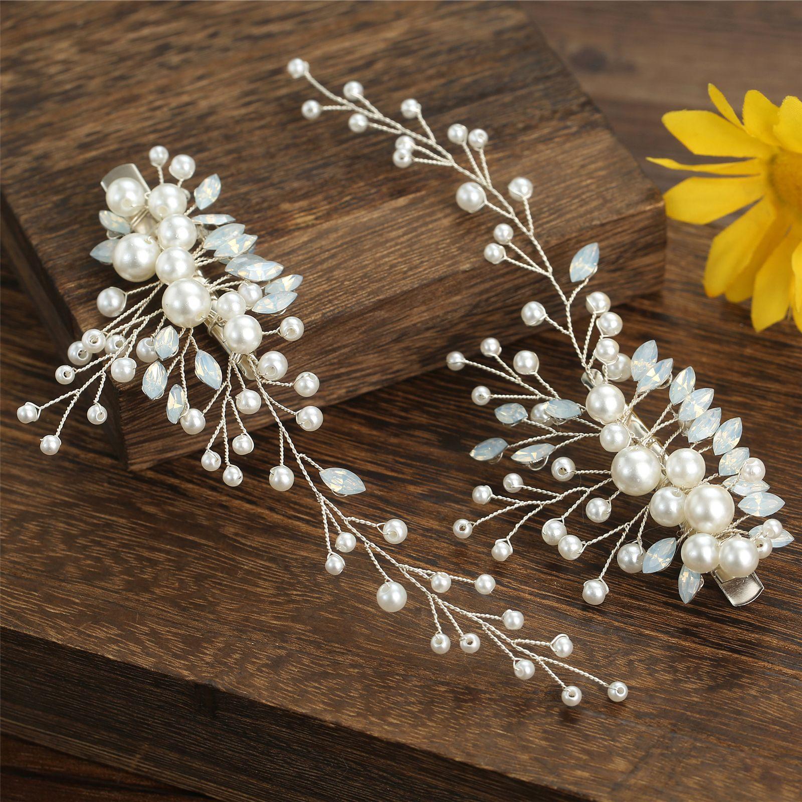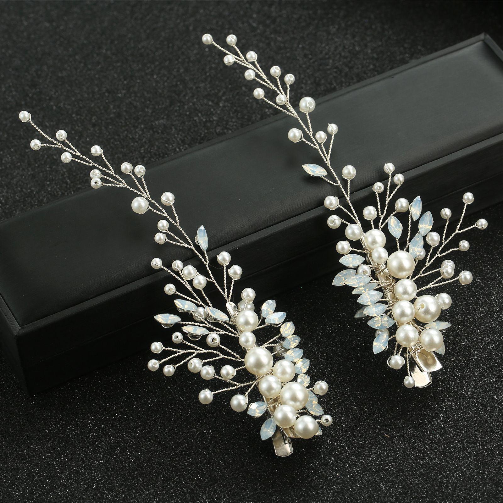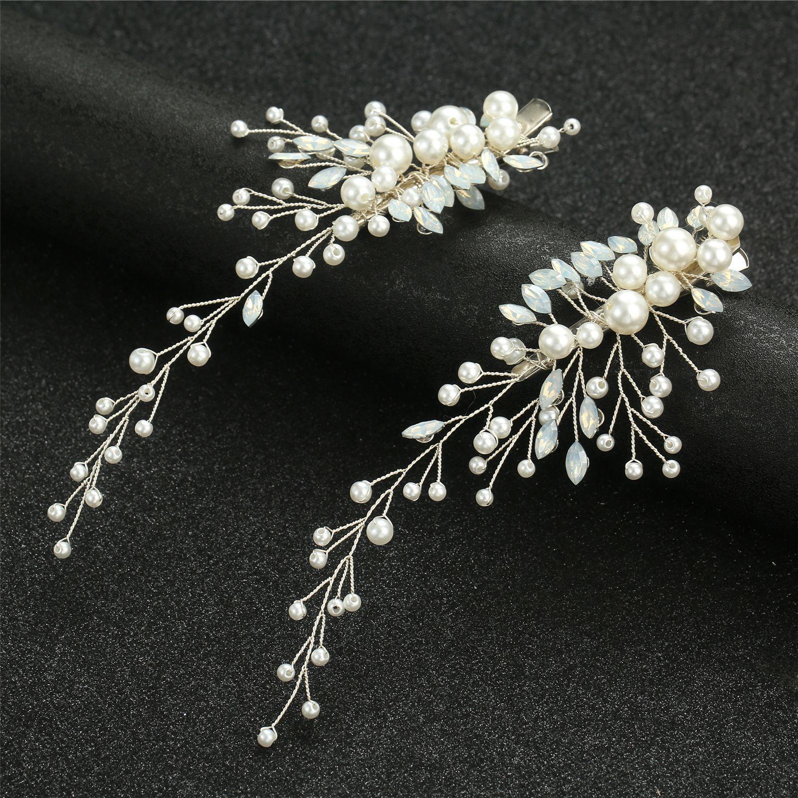 Un conjunto de 2 horquillas hechas a mano de proteína de perla ojo de caballo de cristal diamante par clip tocado de boda nupcial accesorios para el cabello
