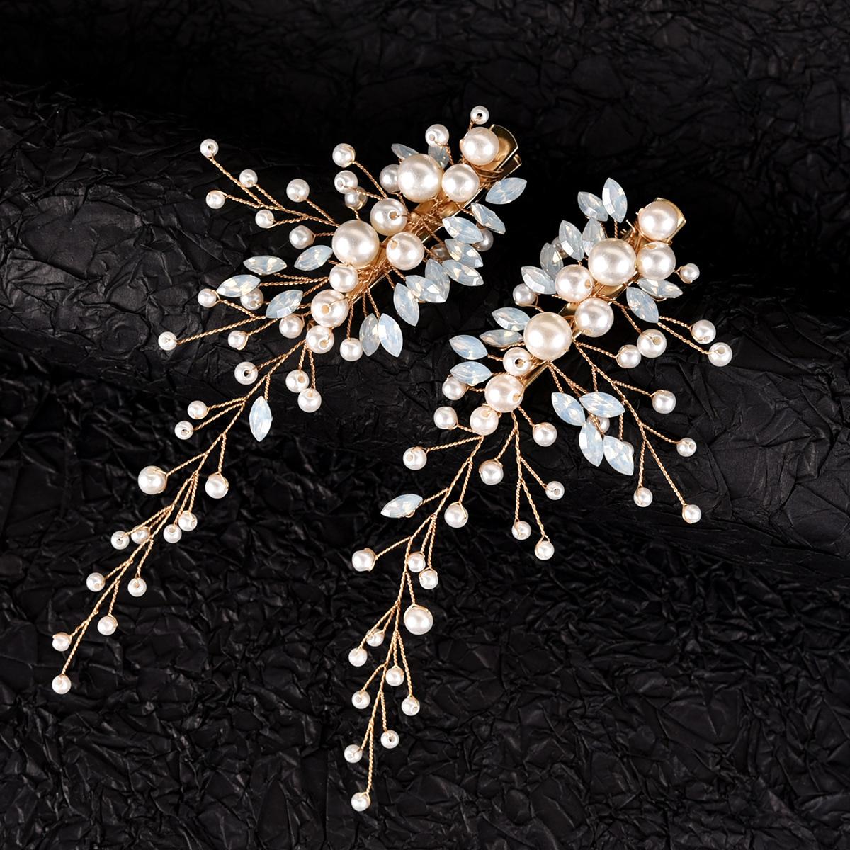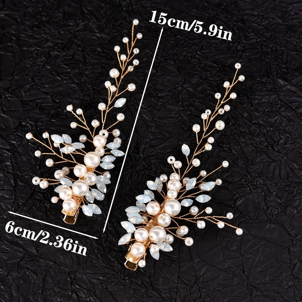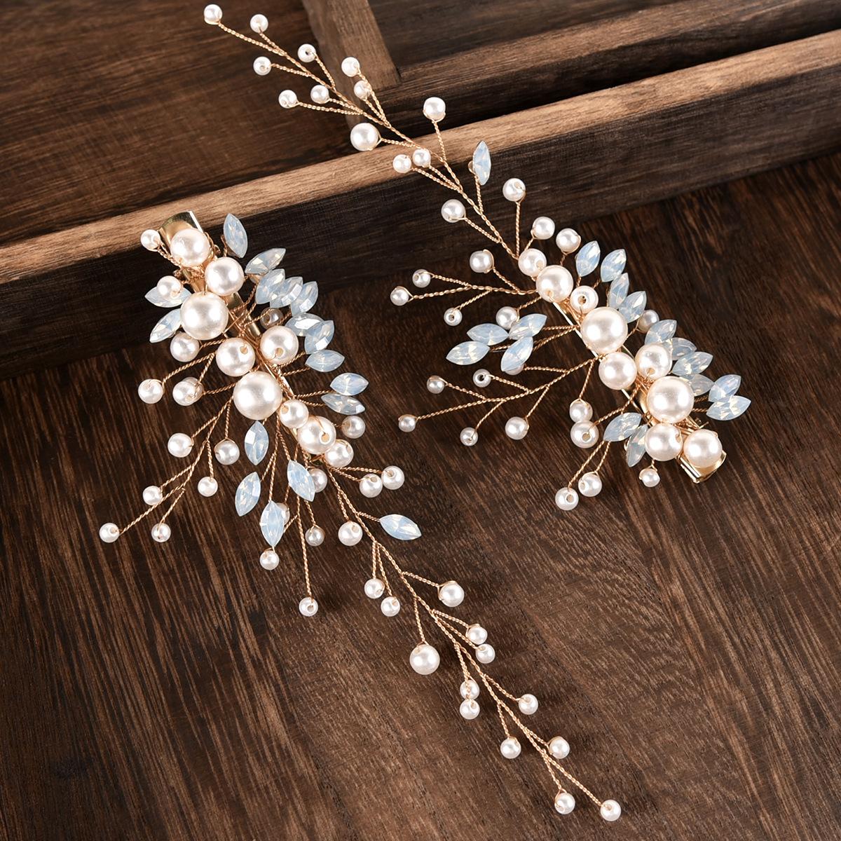 Un conjunto de 2 horquillas hechas a mano de proteína de perla ojo de caballo de cristal diamante par clip tocado de boda nupcial accesorios para el cabello