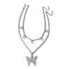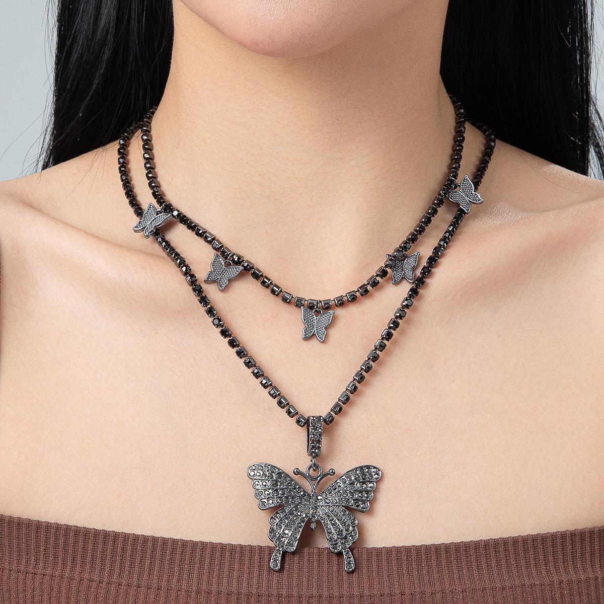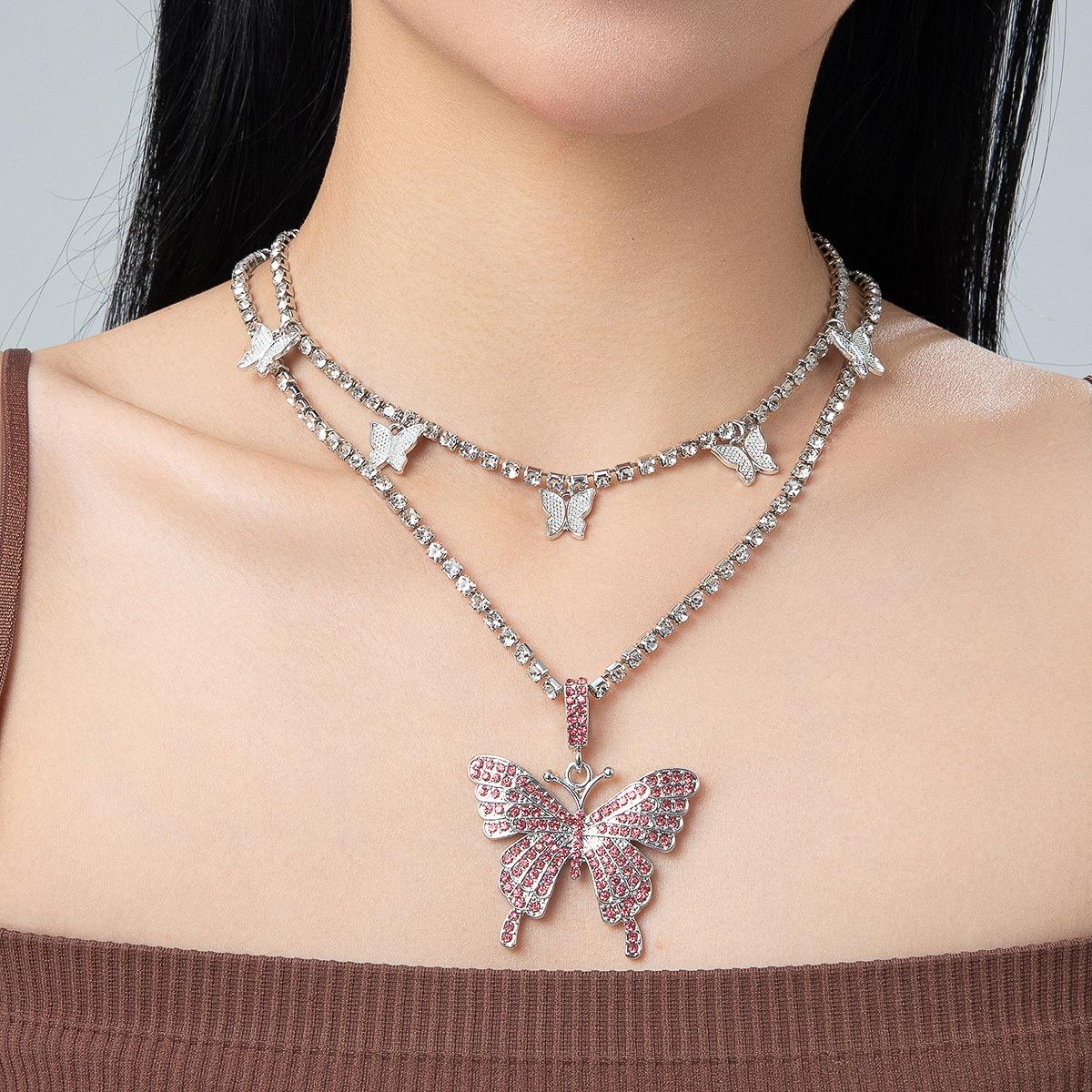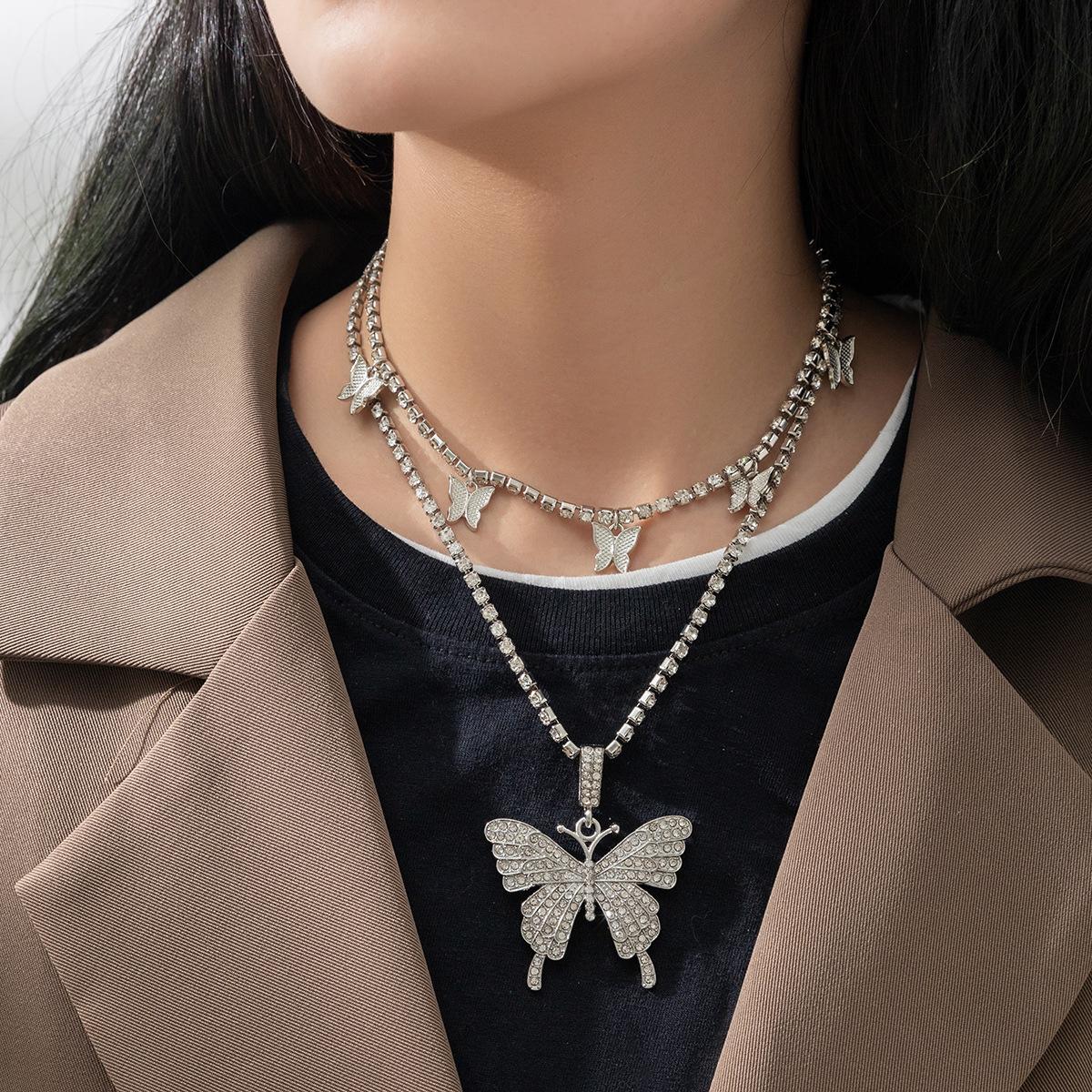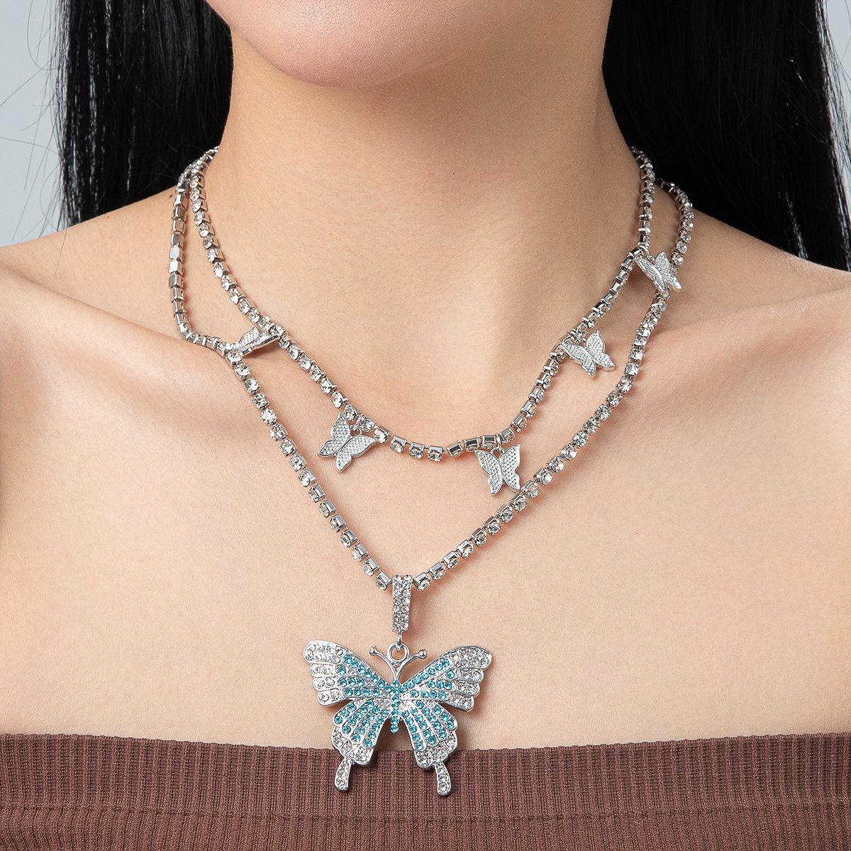 Collar de doble capa con colgante de mariposa de diamantes de imitación transfronterizos europeos y americanos, cadena de garra cubana de hip hop, joyería, gargantilla de tenis