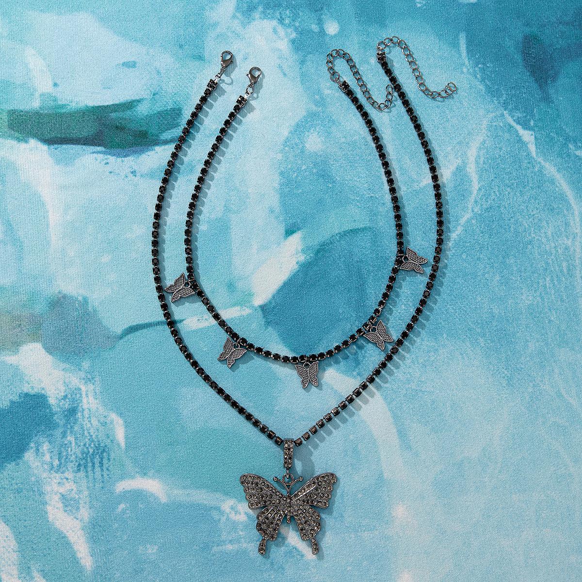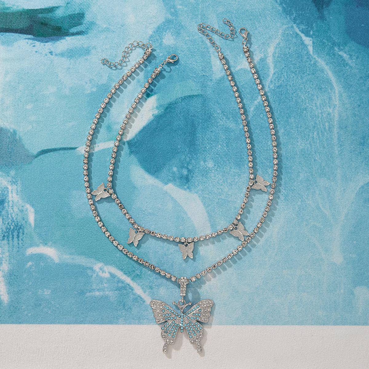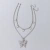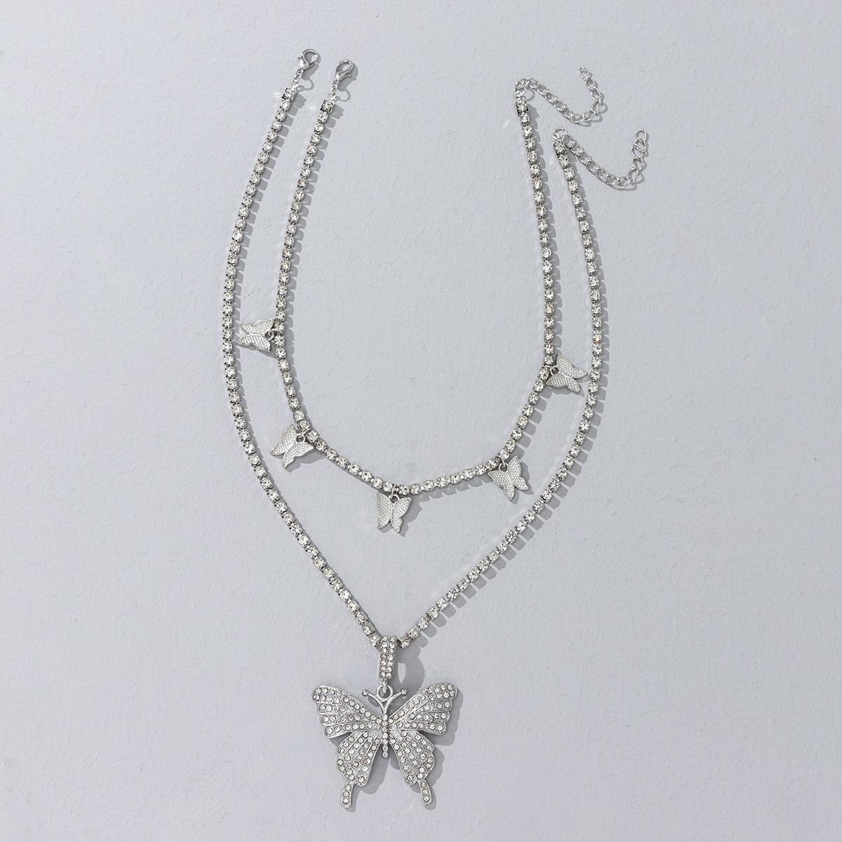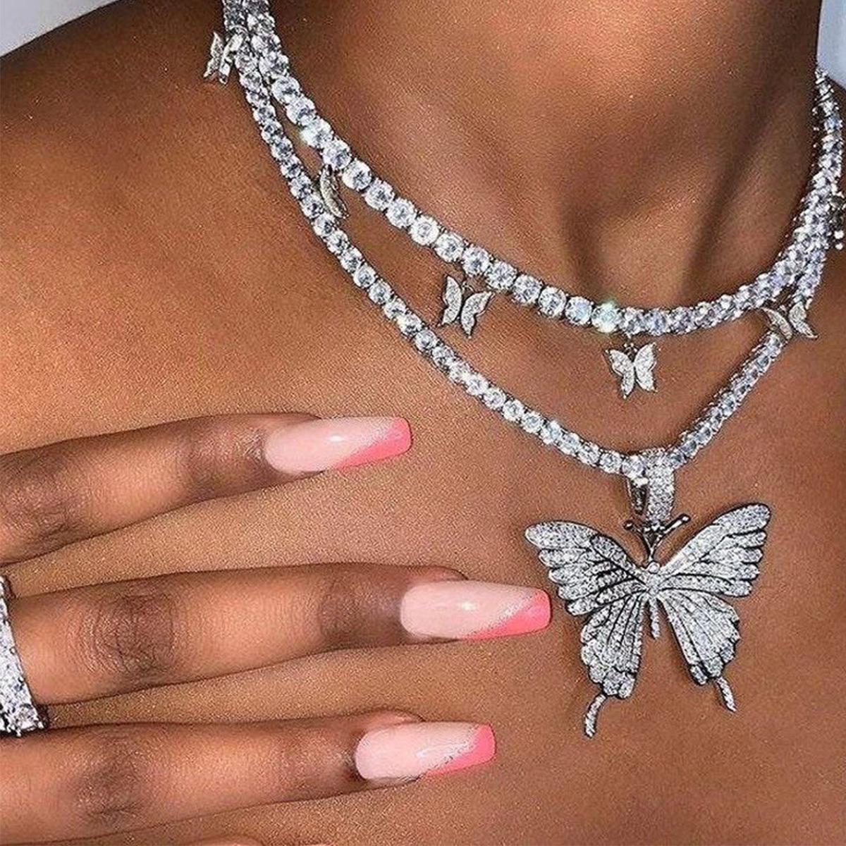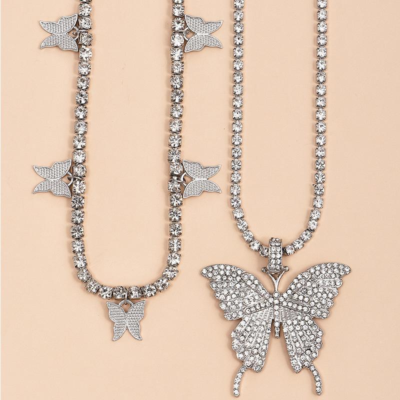 Collar de doble capa con colgante de mariposa de diamantes de imitación transfronterizos europeos y americanos, cadena de garra cubana de hip hop, joyería, gargantilla de tenis