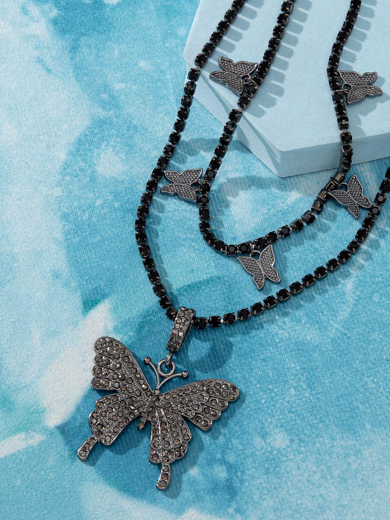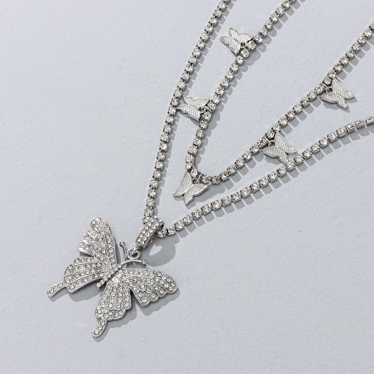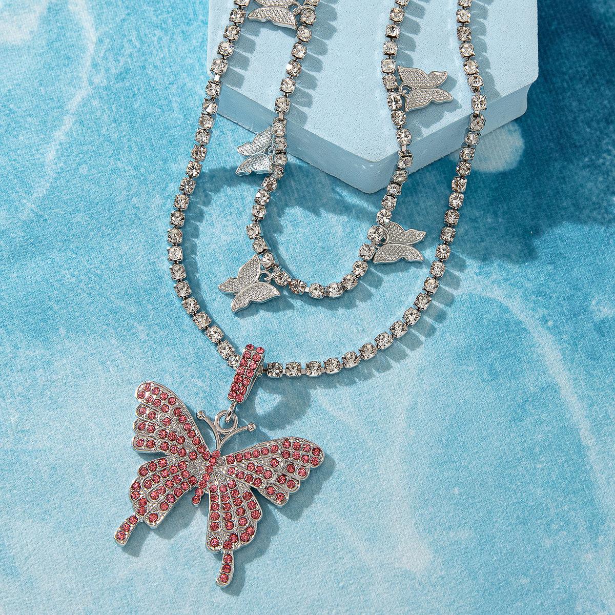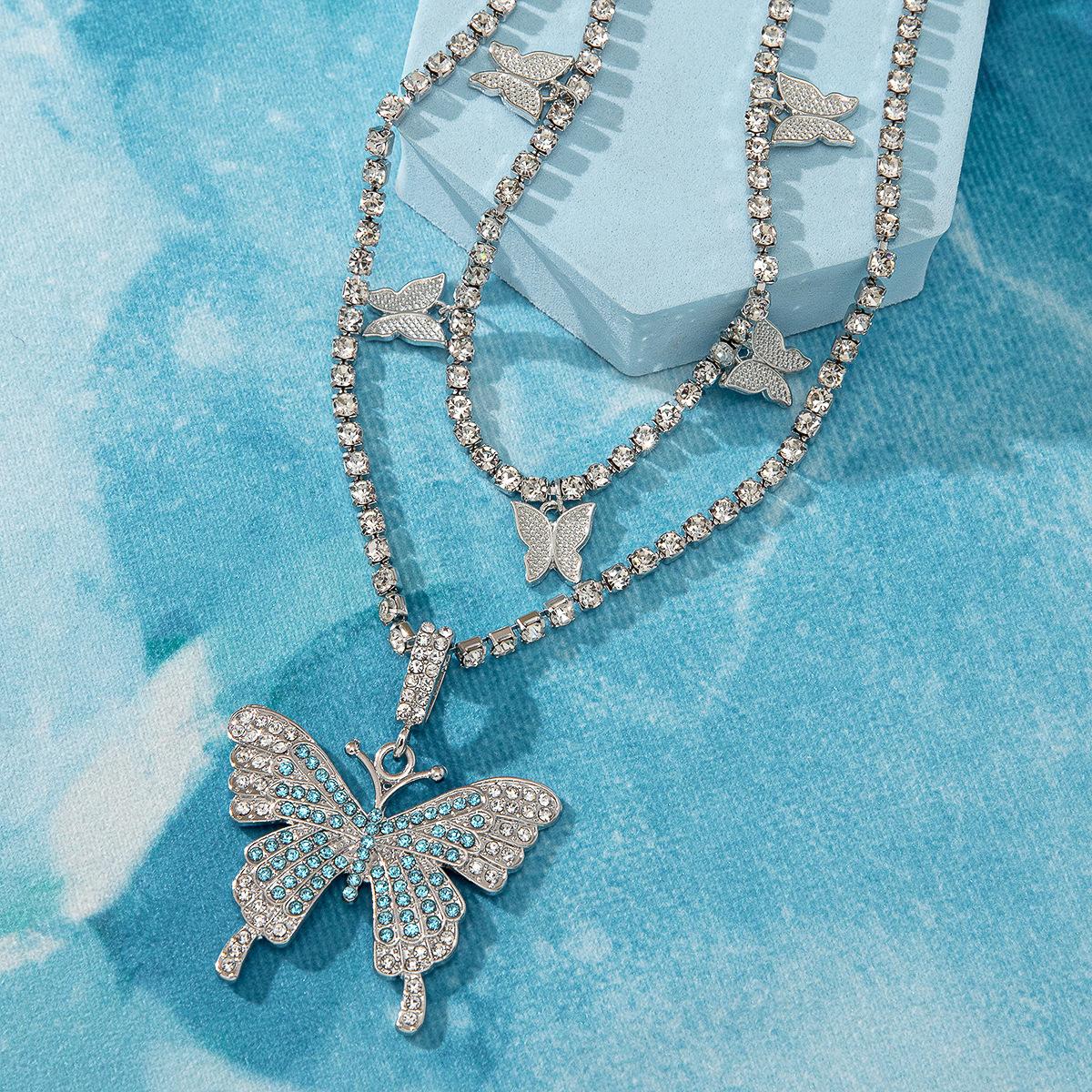 Collar de doble capa con colgante de mariposa de diamantes de imitación transfronterizos europeos y americanos, cadena de garra cubana de hip hop, joyería, gargantilla de tenis
