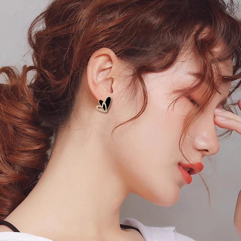 Pendientes de plata S925 con diseño de alta calidad, con un toque de color negro, sencillo, dulce y fresco, con un toque de amor y nicho de diamantes incrustados.