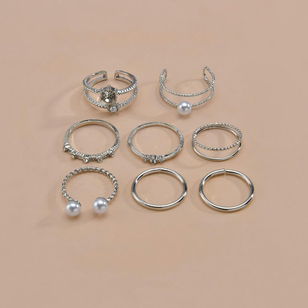 Anillo Abierto Ajustable de Perlas Exageradas de Personalidad Europea y Americana para Mujer, Set de Anillos Metálicos, Joyería, Set de Ocho Piezas