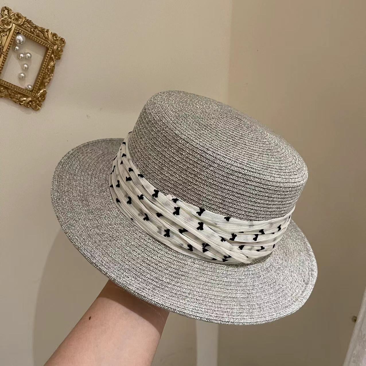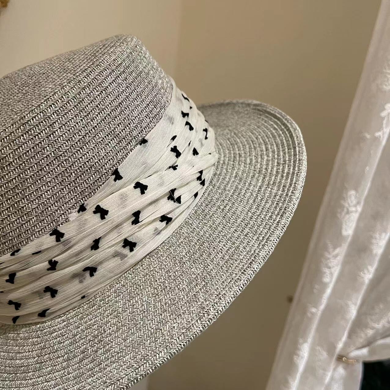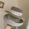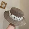Sombrero de paja con protección solar para viajes de verano para mujer, elegante sombrero de copa plana con lazo y ala plana, parasol que combina con todo.