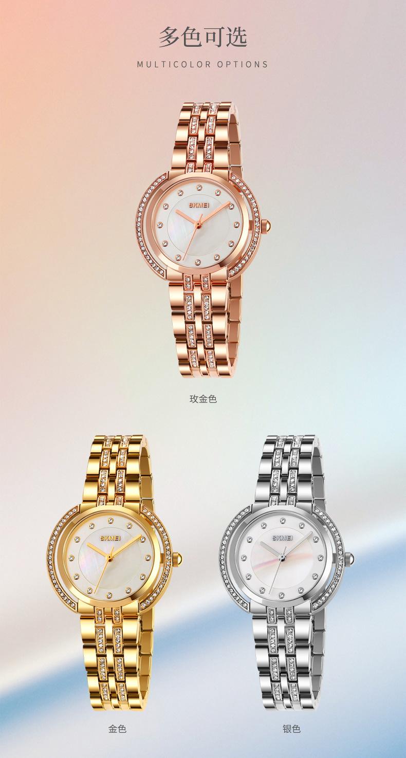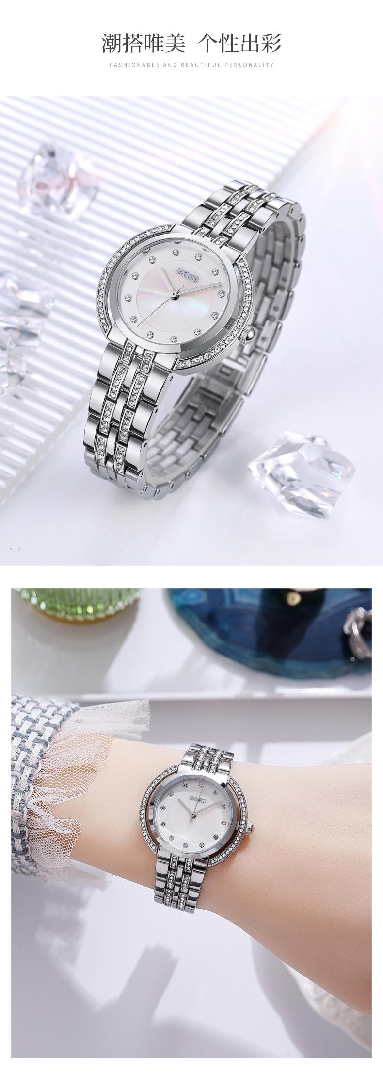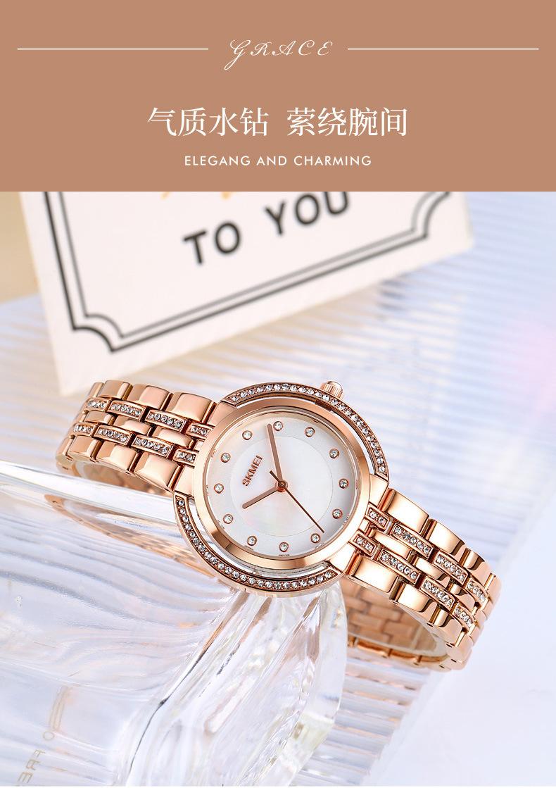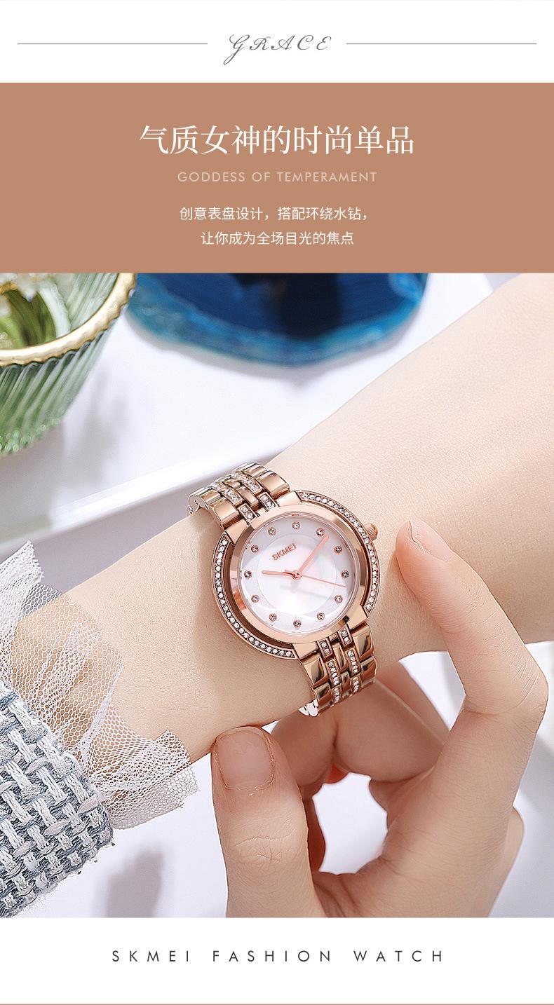 Hermoso reloj de cuarzo Skmei para mujer, elegante, con incrustaciones de diamantes, para estudiantes, con pulsera totalmente combinable.