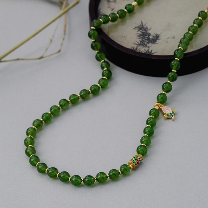 Nuevo collar de cuentas de estilo nacional chino con cuentas largas de ágata verde y calcedonia verde, cadena de esmaltado de alta calidad.