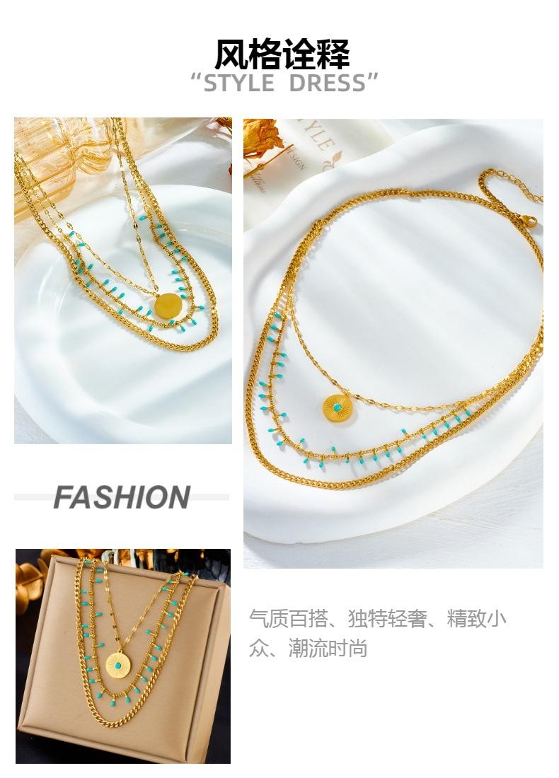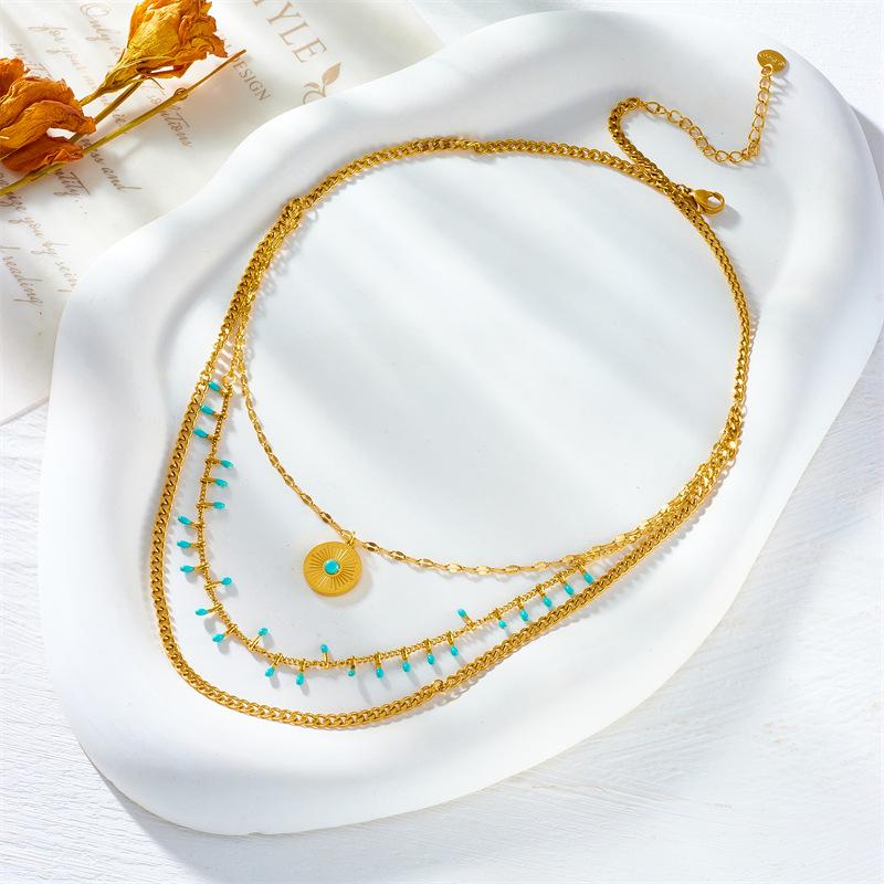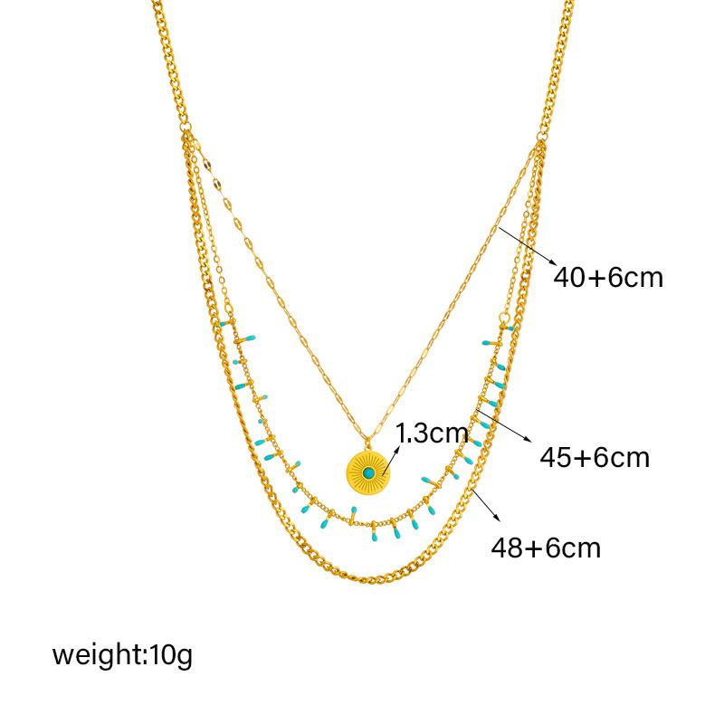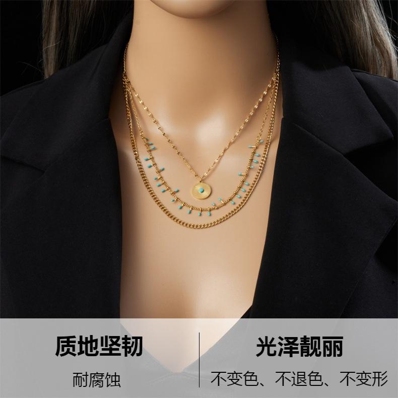 Moda europea y americana retro de alta gama estilo étnico multicapa apilado colgante redondo de turquesa azul joyería de metal collar de acero de titanio