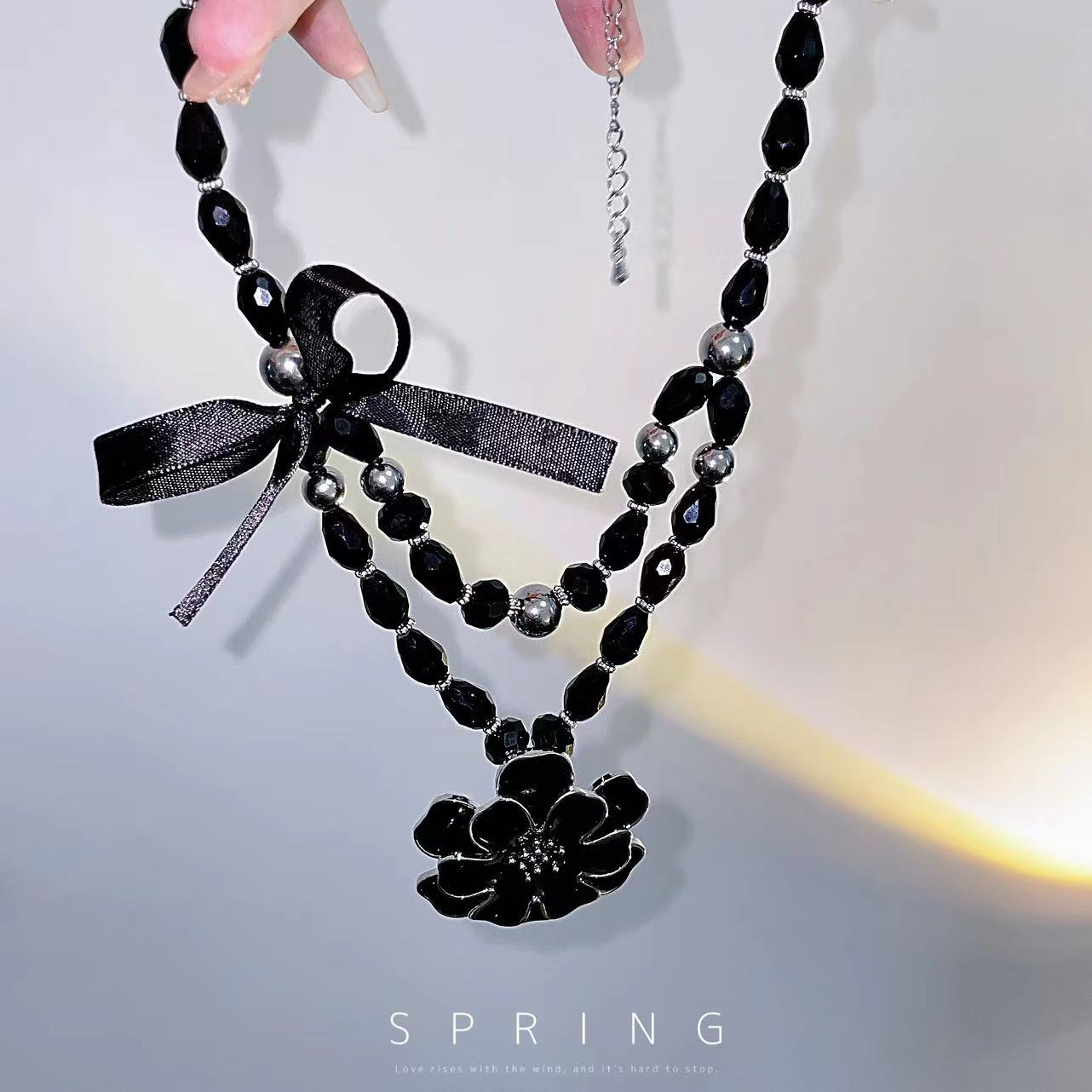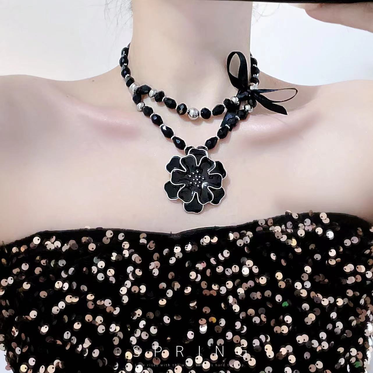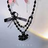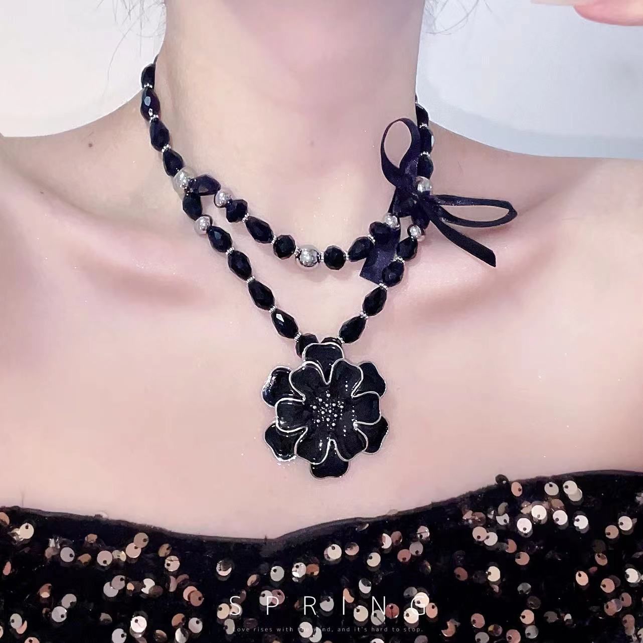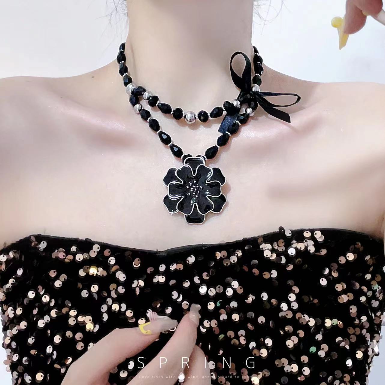 Elegante colgante de flor oscura con cuentas de doble capa de alta calidad, cadena de clavícula con lazo, estilo barroco de lujo.
