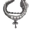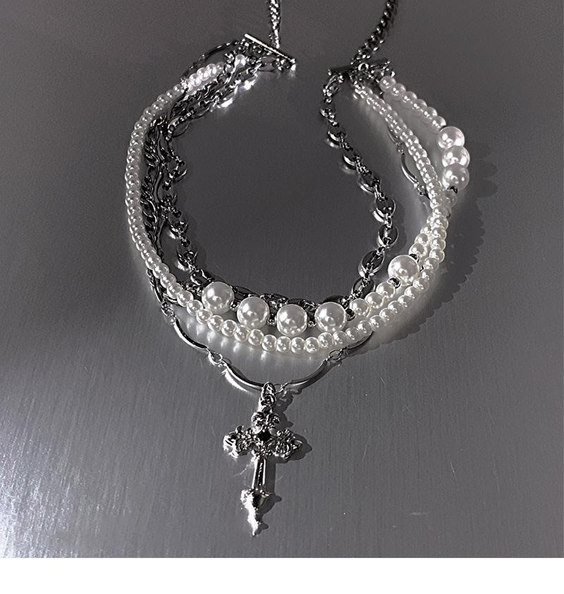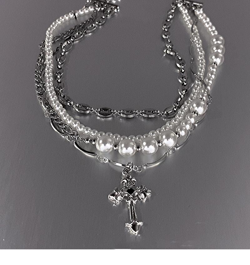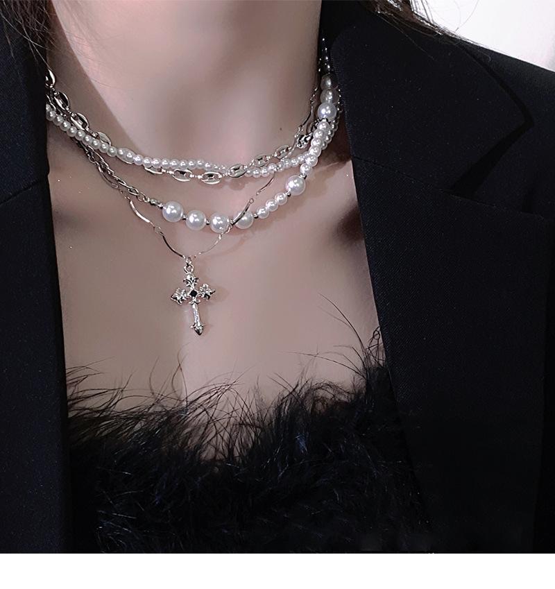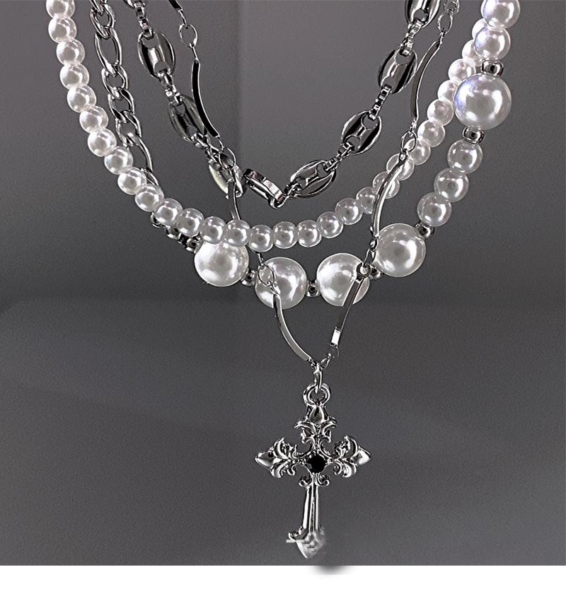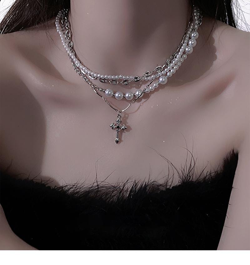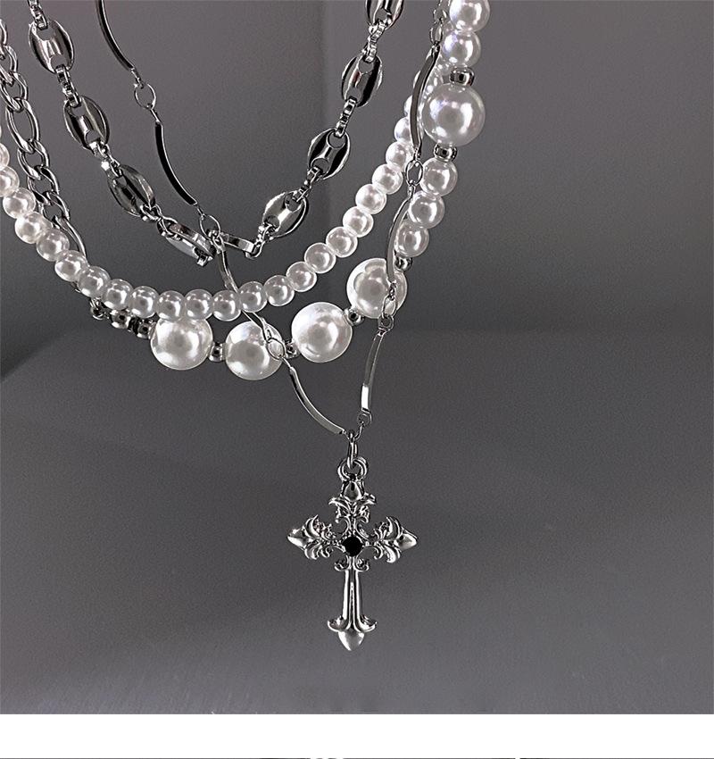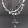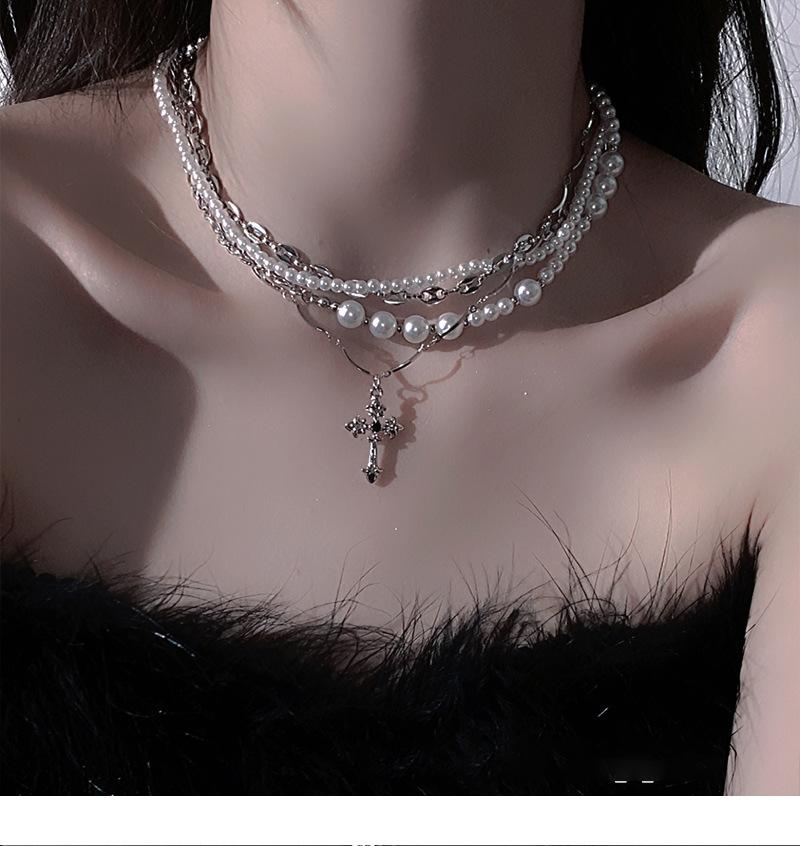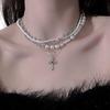 Collar multicapa con cruz de perlas con incrustaciones de diamantes, diseño de nicho de moda, cadena de clavícula ligera, collar elegante de lujo de alta calidad para mujeres