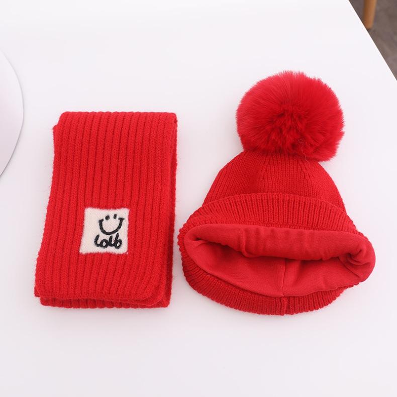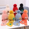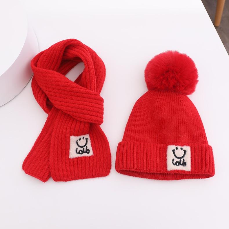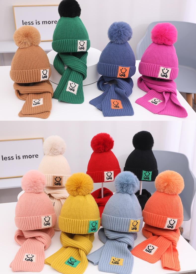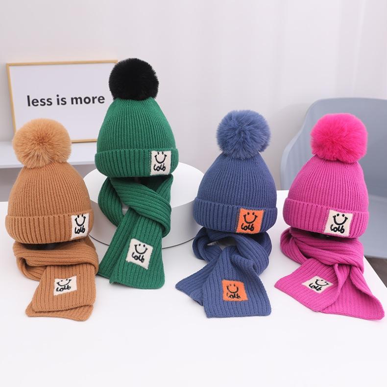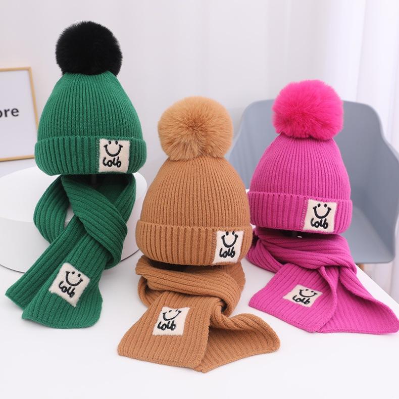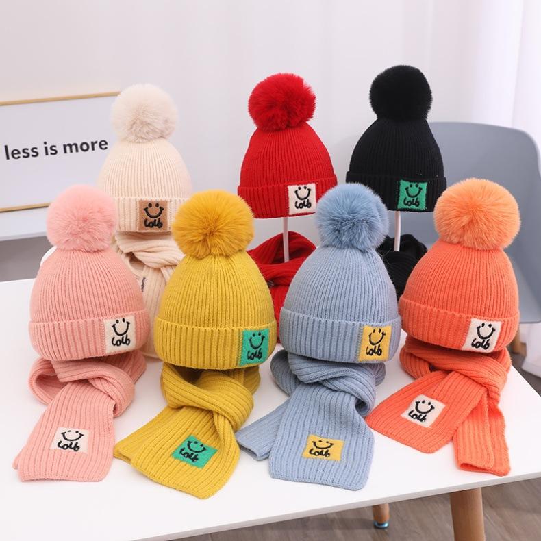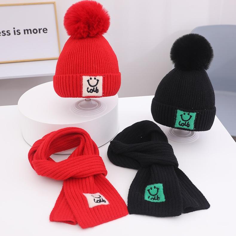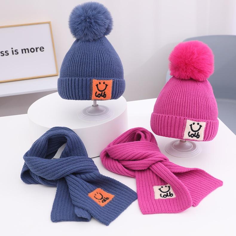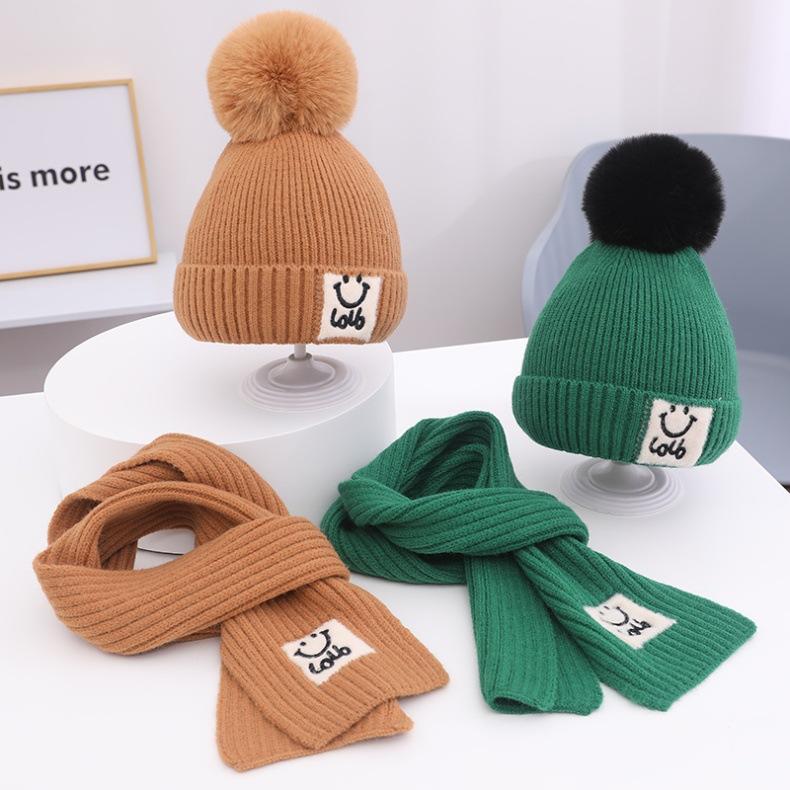 Gorro de punto de invierno para niños con algodón para mantener el calor, gorro para niño, bufanda, conjunto de dos piezas, gorro de lana sonriente para niña, moderno