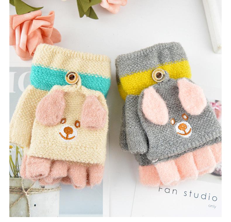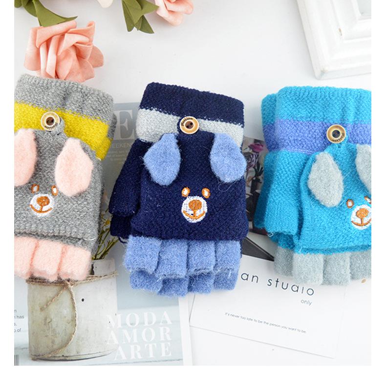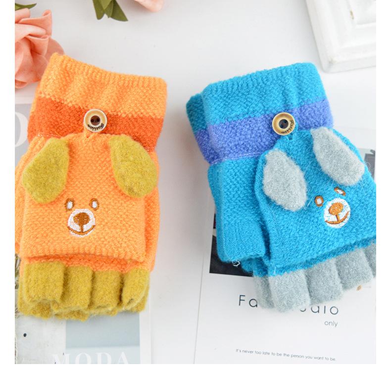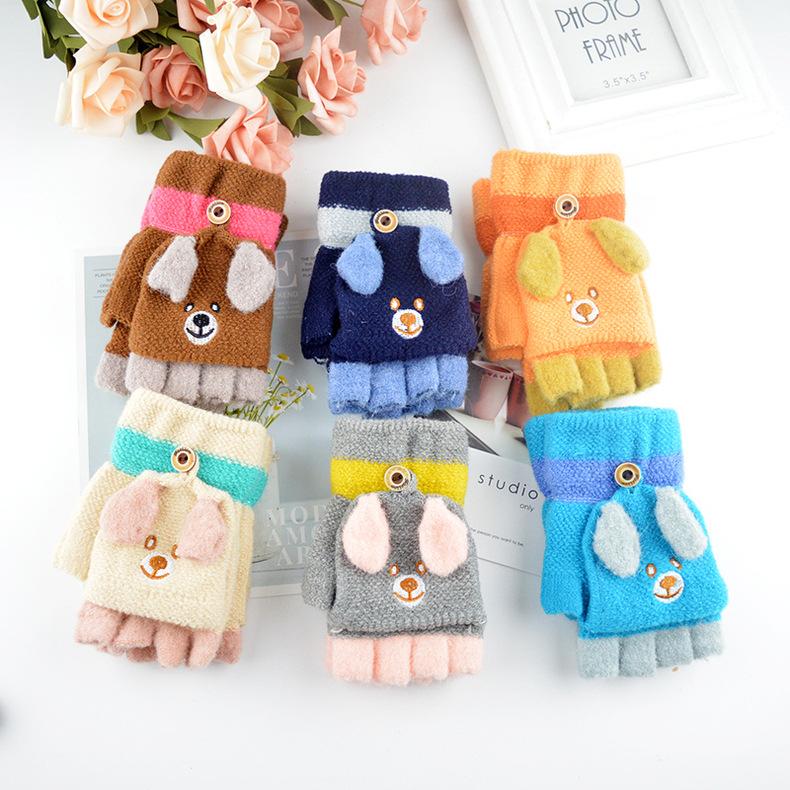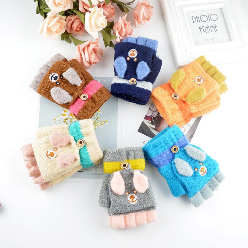 Guantes para niños otoño e invierno con medio dedo abatible para niños y niñas, bonitos guantes de dibujos animados con forma de oso y dedos abiertos de lana de punto grueso y cálido