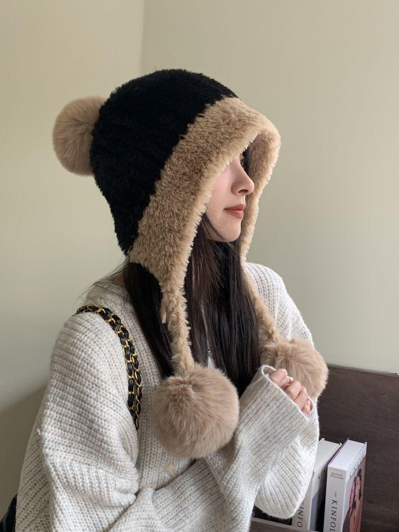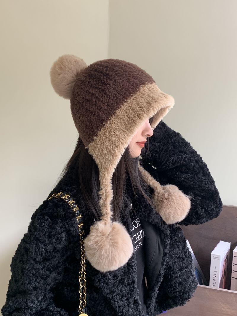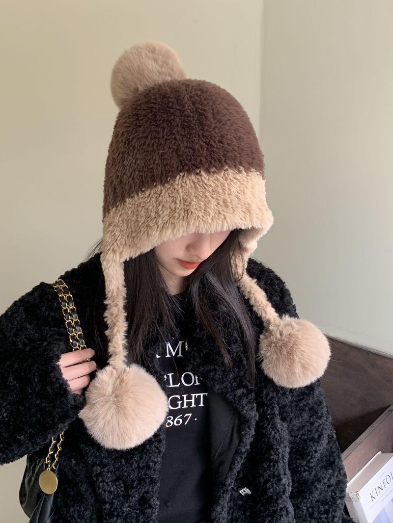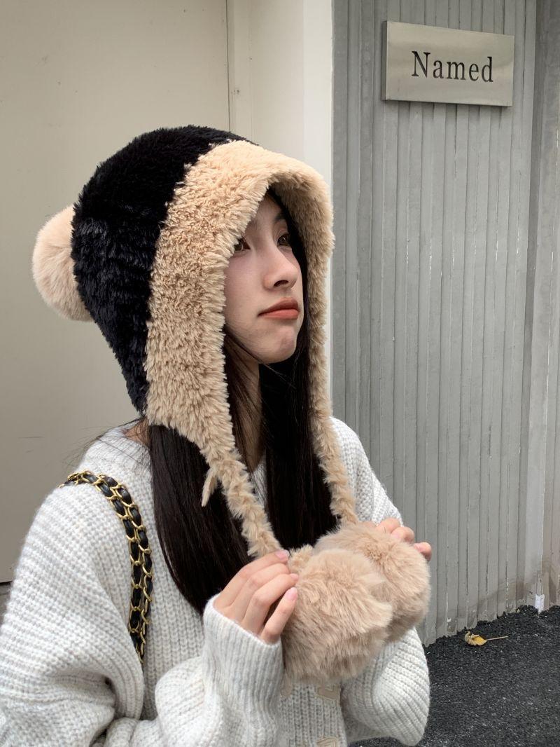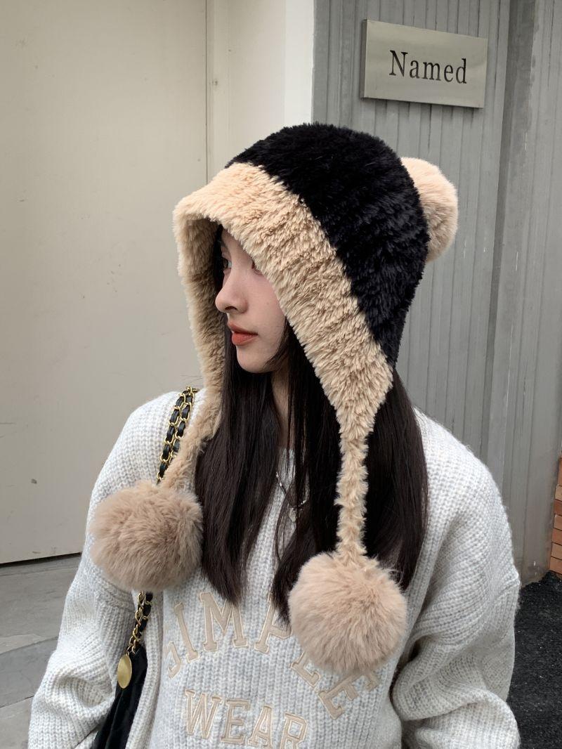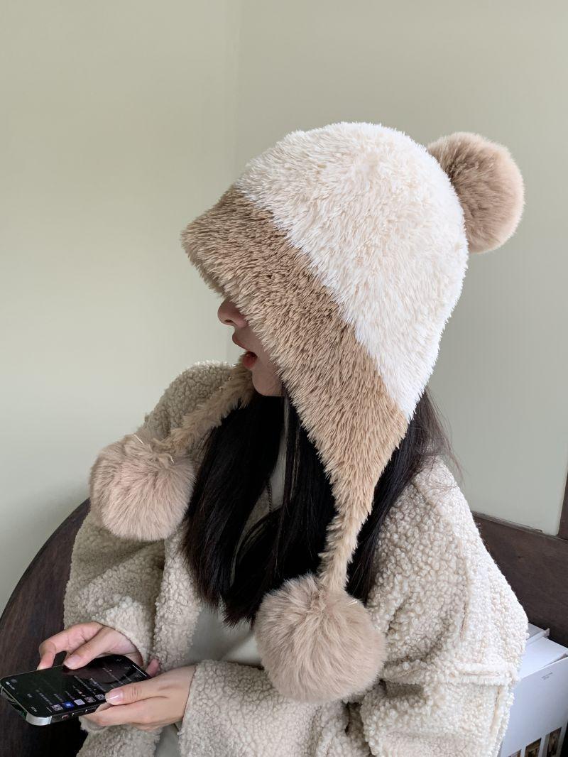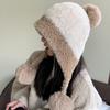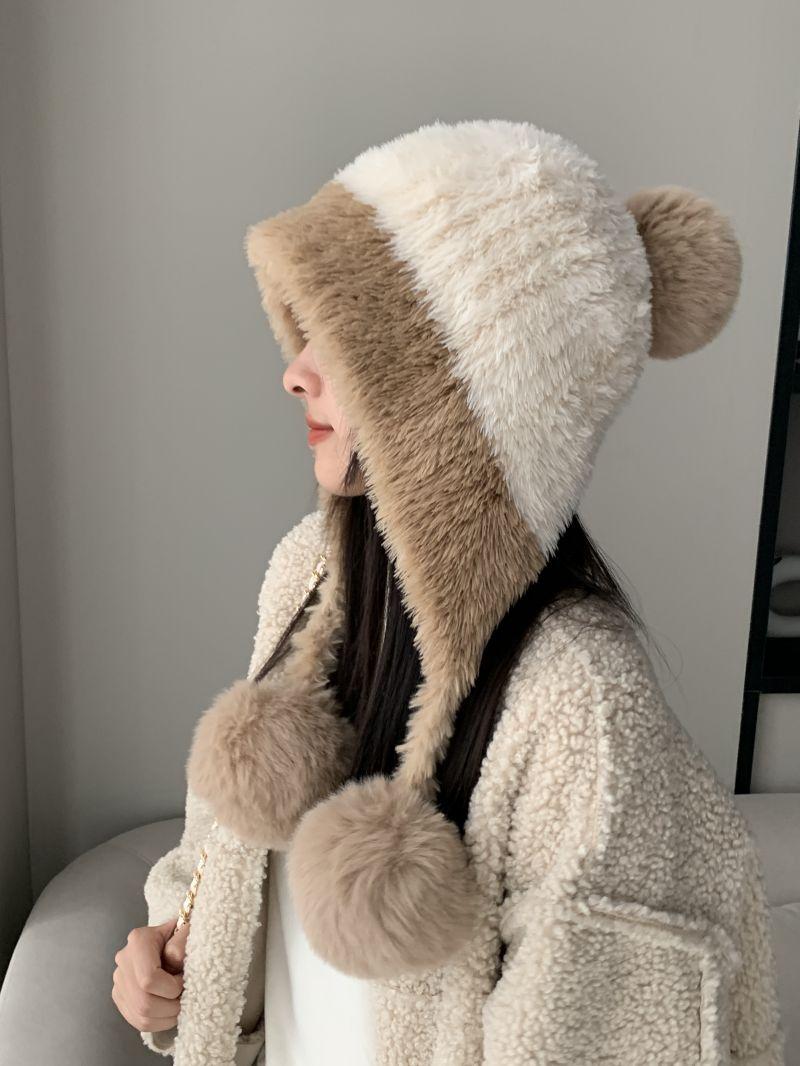 Gorro de felpa de oso para mujer, invierno, tejido de lana con costuras, para exteriores, para montar, protección para las orejas, gorro de punta, sombrero Lei Feng, sombrero cálido