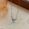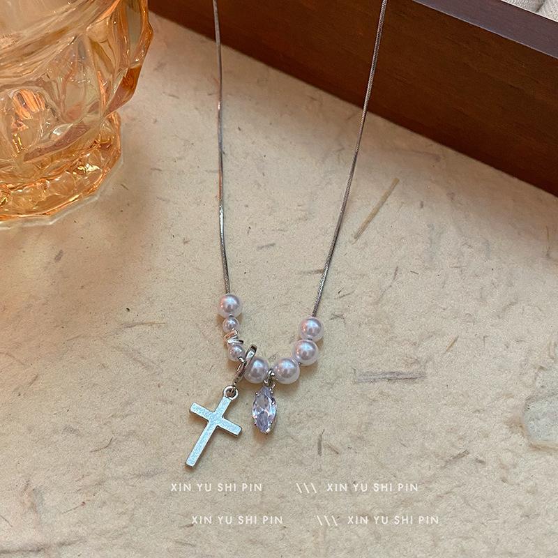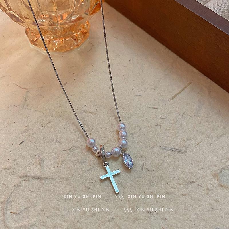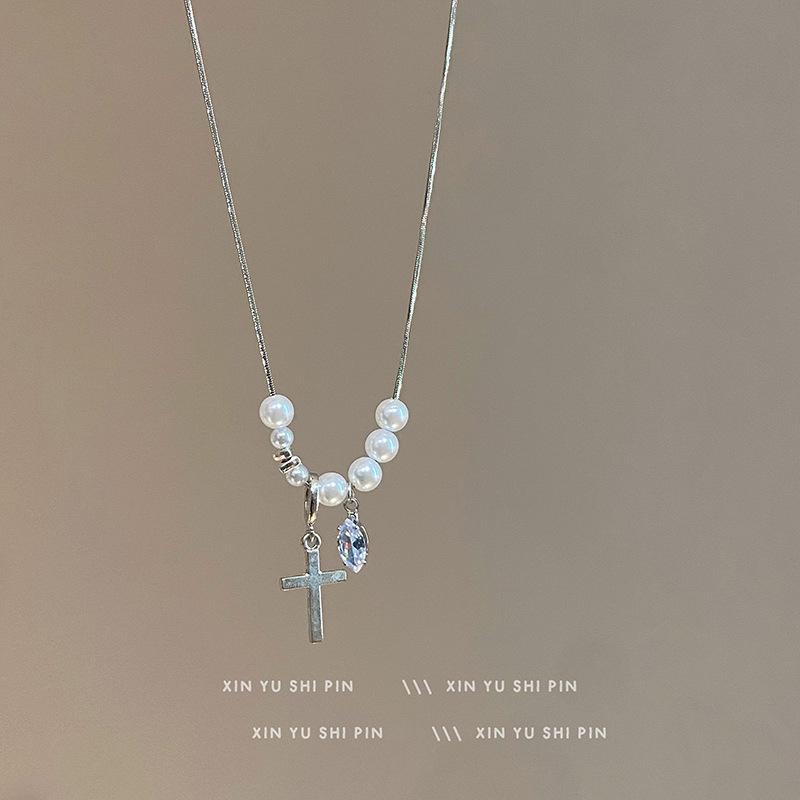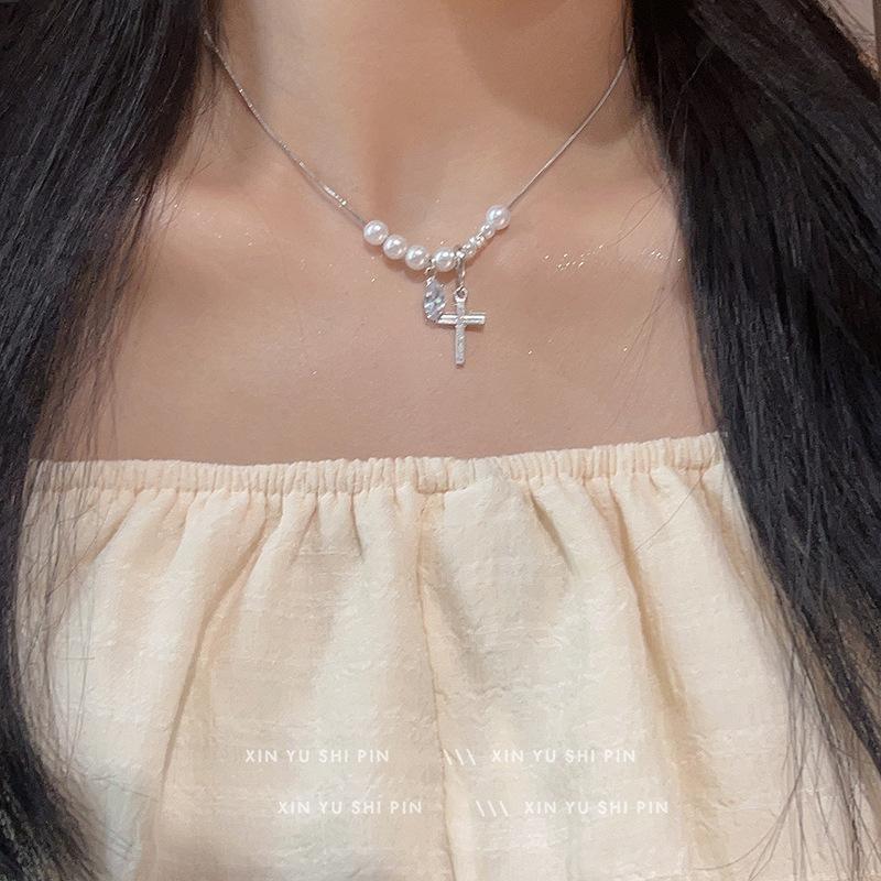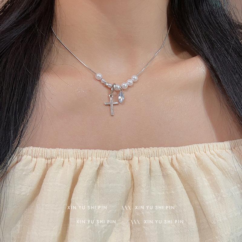 Collar de perlas con colgante de cruz de diseño de nicho para mujer 2024, nueva moda, personalidad, exquisita cadena de clavícula que combina con todo.
