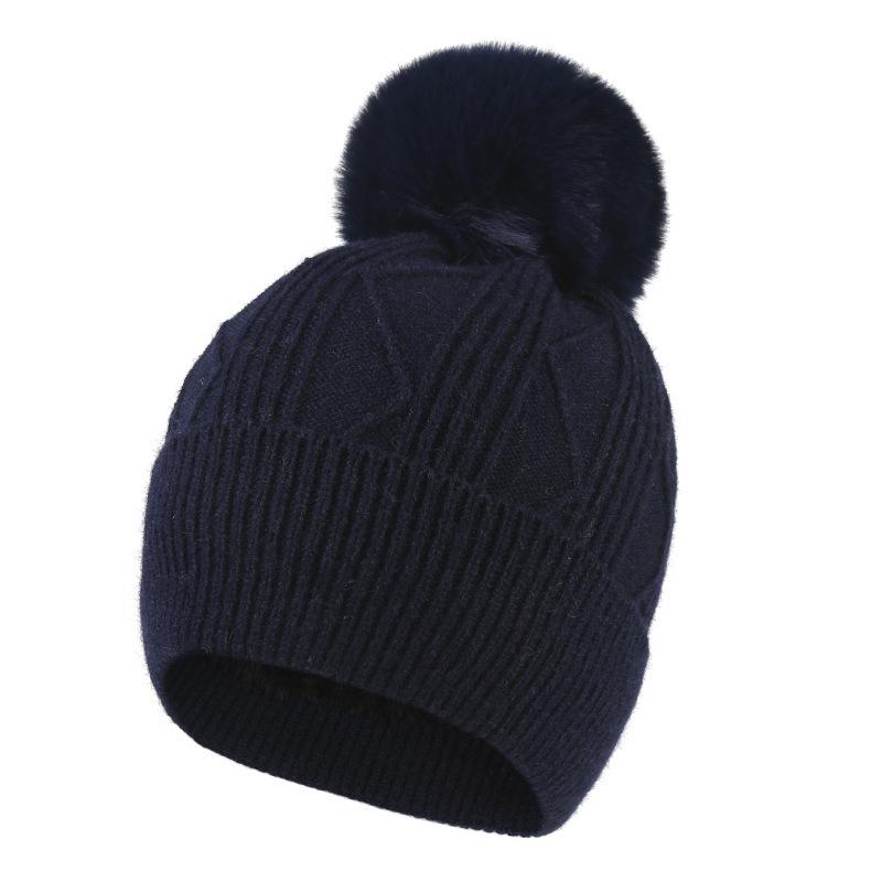 Wool ball striped knitted hat Black, Wool ball striped knitted hat navy blue, Fur Ball striped knitted hat Whi...