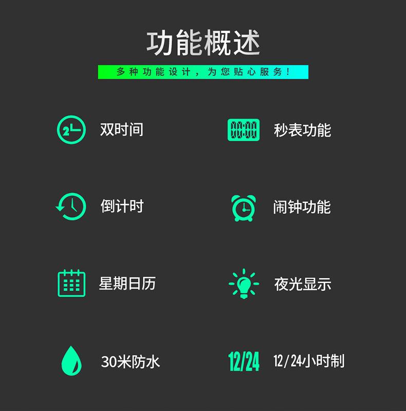 Double time display, stopwatch chronograph, luminous, date display, timing noise, week display, hour clock, 12...
