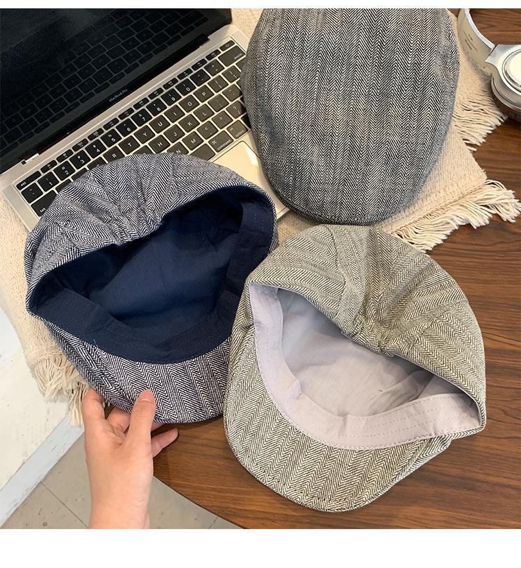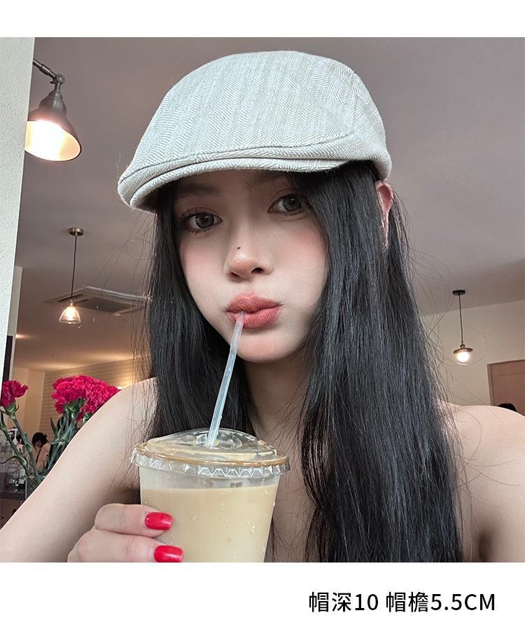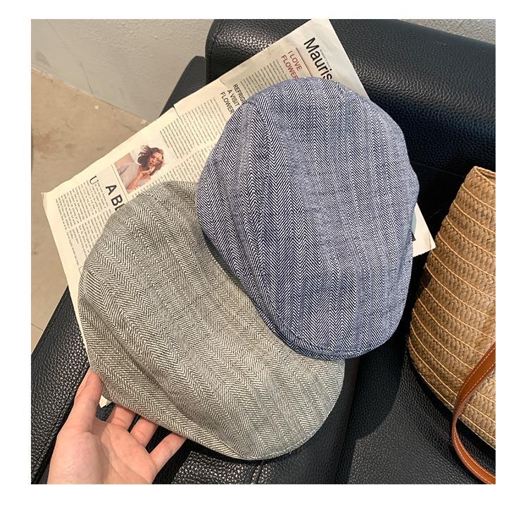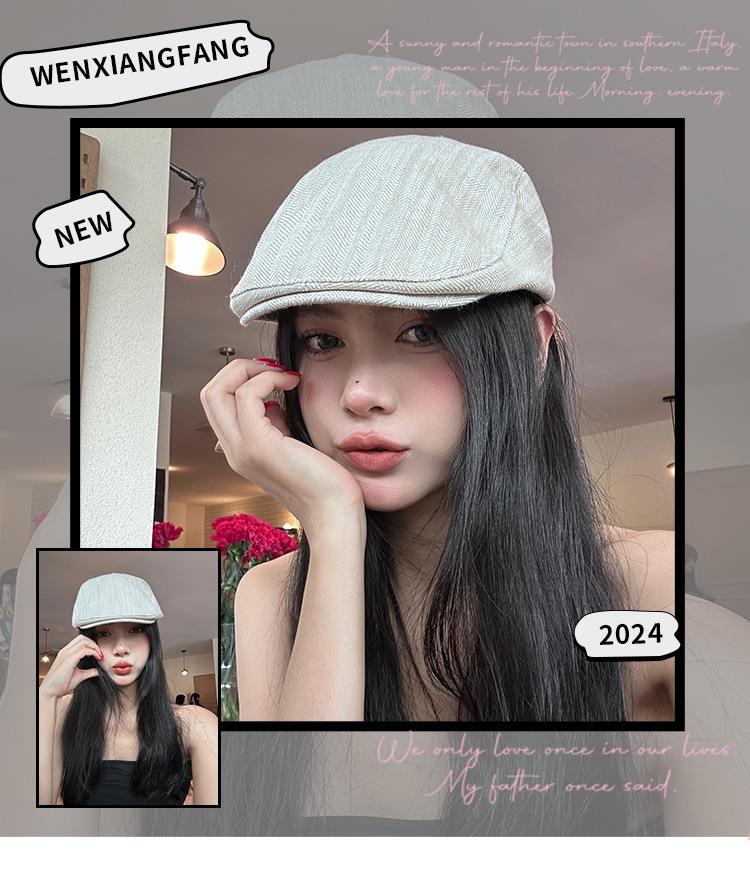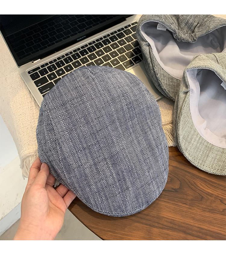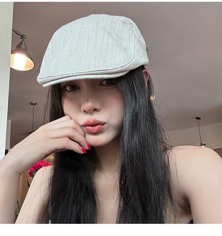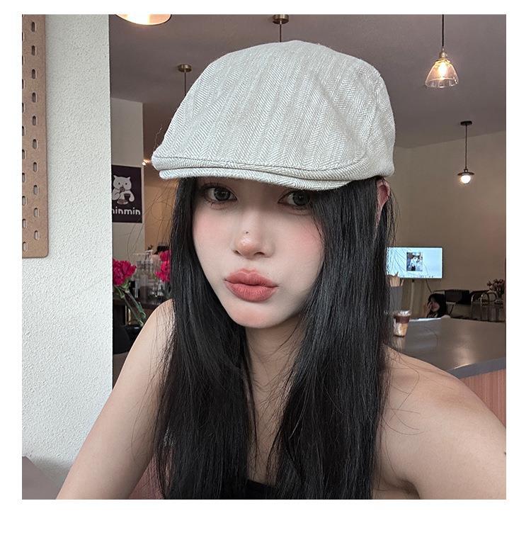 Sombrero Cowboy Retro Rayado Hacia Adelante para Mujer Estilo Británico Literario Circunferencia de Cabeza Grande Boina Mostrando la Cara Sombrero de Pato de Pintor