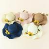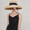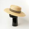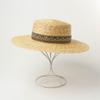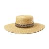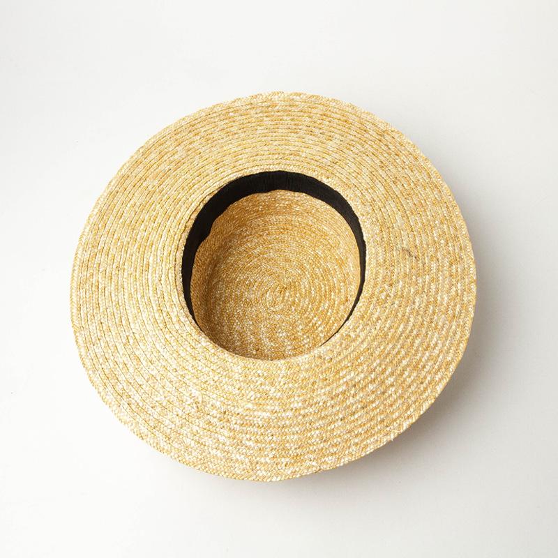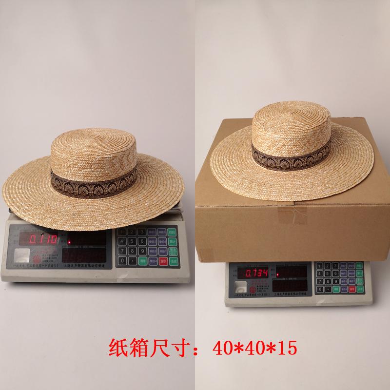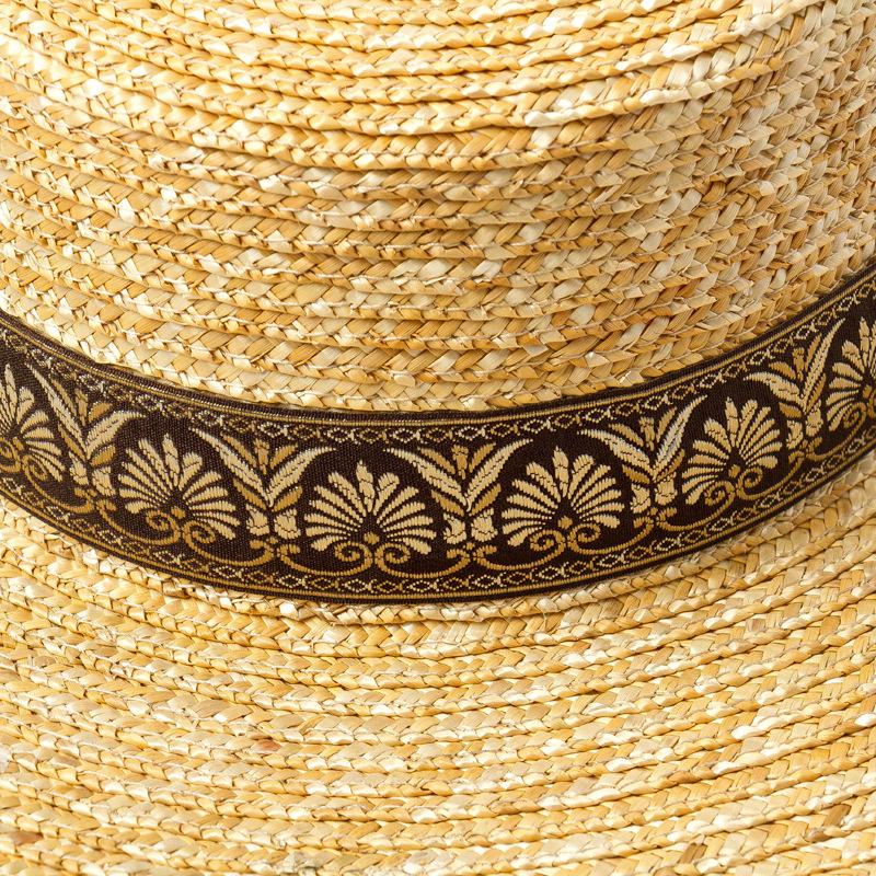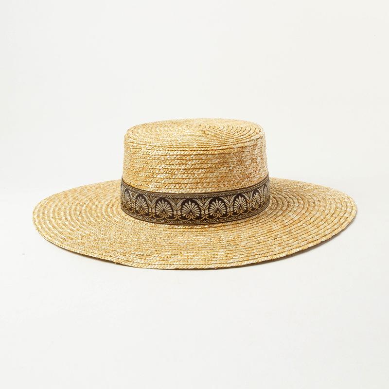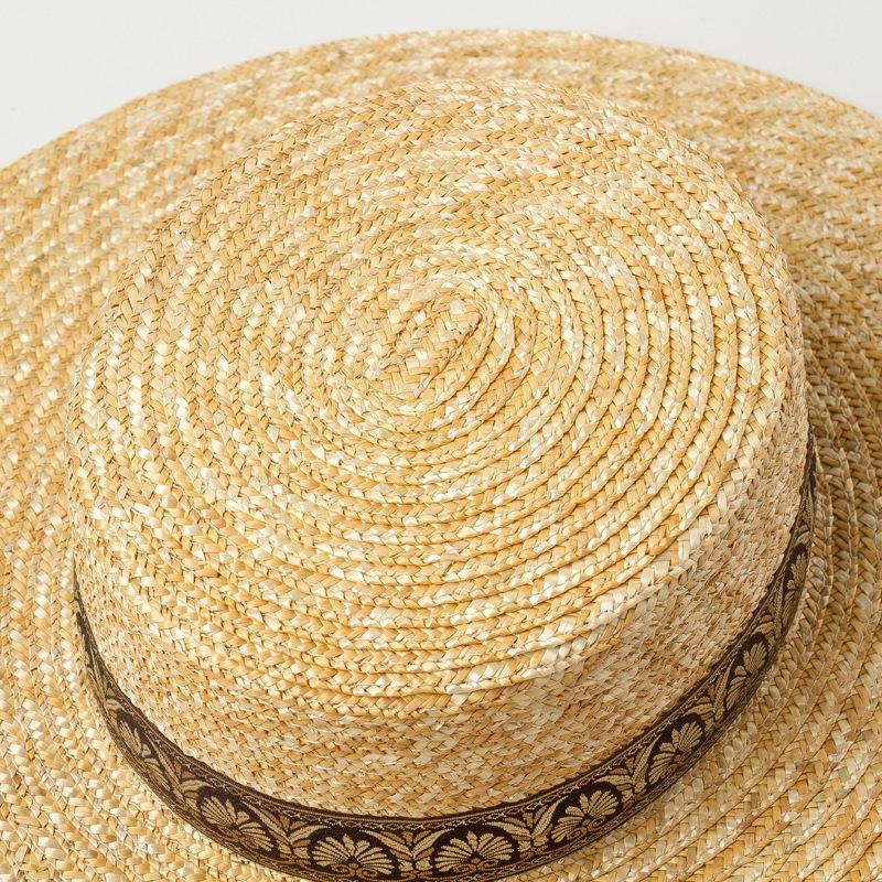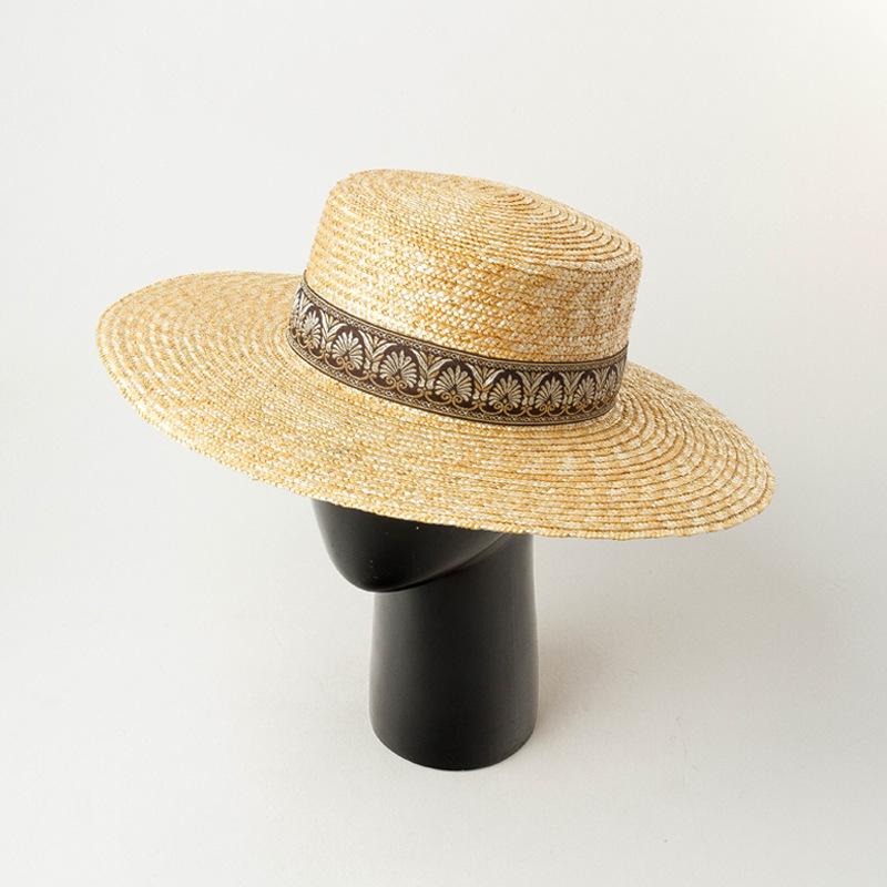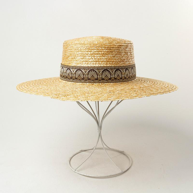 Sombrero de paja decorativo con cinta bordada y diseño retro europeo y americano, sombrero de paja de parte superior plana, para viaje, protector solar, sombrero de paja para playa.