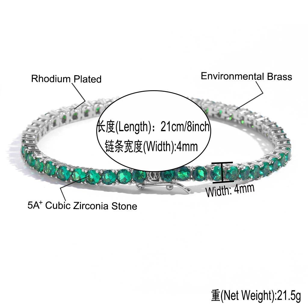 Cadena de tenis de circonita verde de 4 mm de hip-hop europeo y americano, personalidad simple, cadena de tenis para hombres y mujeres, artículos de hip-hop transfronterizos